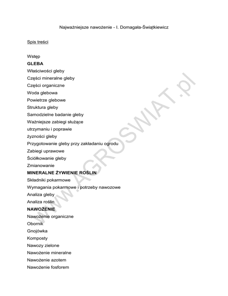 NajwaŜniejsze nawoŜenie - I. Domagała-Świątkiewicz Spis treści Wstęp GLEBA Właściwości gleby Części mineralne gleby Części organiczne Woda glebowa Powietrze glebowe Struktura gleby Samodzielne badanie gleby WaŜniejsze zabiegi słuŜące utrzymaniu i poprawie Ŝyzności gleby Przygotowanie gleby przy zakładaniu ogrodu Zabiegi uprawowe Ściółkowanie gleby Zmianowanie MINERALNE śYWIENIE ROŚLIN Składniki pokarmowe Wymagania pokarmowe i potrzeby nawozowe Analiza gleby Analiza roślin NAWOśENIE NawoŜenie organiczne Obornik Gnojówka Komposty Nawozy zielone NawoŜenie mineralne NawoŜenie azotem NawoŜenie fosforem NawoŜenie potasem NawoŜenie magnezem NawoŜenie mikroelementami Nawozy wieloskładnikowe Wapnowanie Określanie potrzeb wapnowania gleb i podłoŜy organicznych Nawozy stosowane do wapnowania gleb Techniki nawoŜenia Techniki stosowania nawozów mineralnych Mieszanie nawozów Zasady ustalania dawek nawozów mineralnych NawoŜenie warzyw NawoŜenie a zawartość azotanów w warzywach NawoŜenie a metale cięŜkie NawoŜenie kwatery sadowniczej NawoŜenie roślin ozdobnych SŁOWNICZEK ANEKS Wydawca Działkowiec Rok wydania 2004 Liczba stron 80 Wymiary A-5 Okładka miękka ISBN 83-89615-20-7