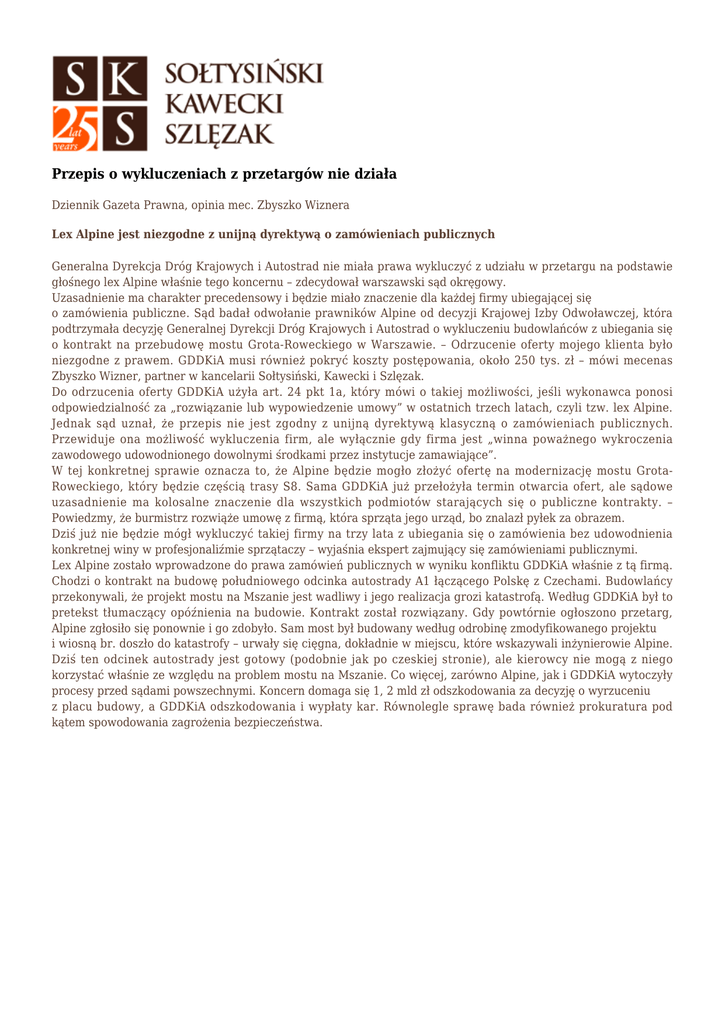 Przepis o wykluczeniach z przetargów nie działa Dziennik Gazeta Prawna, opinia mec. Zbyszko Wiznera Lex Alpine jest niezgodne z unijną dyrektywą o zamówieniach publicznych Generalna Dyrekcja Dróg Krajowych i Autostrad nie miała prawa wykluczyć z udziału w przetargu na podstawie głośnego lex Alpine właśnie tego koncernu – zdecydował warszawski sąd okręgowy. Uzasadnienie ma charakter precedensowy i będzie miało znaczenie dla każdej firmy ubiegającej się o zamówienia publiczne. Sąd badał odwołanie prawników Alpine od decyzji Krajowej Izby Odwoławczej, która podtrzymała decyzję Generalnej Dyrekcji Dróg Krajowych i Autostrad o wykluczeniu budowlańców z ubiegania się o kontrakt na przebudowę mostu Grota-Roweckiego w Warszawie. – Odrzucenie oferty mojego klienta było niezgodne z prawem. GDDKiA musi również pokryć koszty postępowania, około 250 tys. zł – mówi mecenas Zbyszko Wizner, partner w kancelarii Sołtysiński, Kawecki i Szlęzak. Do odrzucenia oferty GDDKiA użyła art. 24 pkt 1a, który mówi o takiej możliwości, jeśli wykonawca ponosi odpowiedzialność za „rozwiązanie lub wypowiedzenie umowy” w ostatnich trzech latach, czyli tzw. lex Alpine. Jednak sąd uznał, że przepis nie jest zgodny z unijną dyrektywą klasyczną o zamówieniach publicznych. Przewiduje ona możliwość wykluczenia firm, ale wyłącznie gdy firma jest „winna poważnego wykroczenia zawodowego udowodnionego dowolnymi środkami przez instytucje zamawiające”. W tej konkretnej sprawie oznacza to, że Alpine będzie mogło złożyć ofertę na modernizację mostu GrotaRoweckiego, który będzie częścią trasy S8. Sama GDDKiA już przełożyła termin otwarcia ofert, ale sądowe uzasadnienie ma kolosalne znaczenie dla wszystkich podmiotów starających się o publiczne kontrakty. – Powiedzmy, że burmistrz rozwiąże umowę z firmą, która sprząta jego urząd, bo znalazł pyłek za obrazem. Dziś już nie będzie mógł wykluczyć takiej firmy na trzy lata z ubiegania się o zamówienia bez udowodnienia konkretnej winy w profesjonaliźmie sprzątaczy – wyjaśnia ekspert zajmujący się zamówieniami publicznymi. Lex Alpine zostało wprowadzone do prawa zamówień publicznych w wyniku konfliktu GDDKiA właśnie z tą firmą. Chodzi o kontrakt na budowę południowego odcinka autostrady A1 łączącego Polskę z Czechami. Budowlańcy przekonywali, że projekt mostu na Mszanie jest wadliwy i jego realizacja grozi katastrofą. Według GDDKiA był to pretekst tłumaczący opóźnienia na budowie. Kontrakt został rozwiązany. Gdy powtórnie ogłoszono przetarg, Alpine zgłosiło się ponownie i go zdobyło. Sam most był budowany według odrobinę zmodyfikowanego projektu i wiosną br. doszło do katastrofy – urwały się cięgna, dokładnie w miejscu, które wskazywali inżynierowie Alpine. Dziś ten odcinek autostrady jest gotowy (podobnie jak po czeskiej stronie), ale kierowcy nie mogą z niego korzystać właśnie ze względu na problem mostu na Mszanie. Co więcej, zarówno Alpine, jak i GDDKiA wytoczyły procesy przed sądami powszechnymi. Koncern domaga się 1, 2 mld zł odszkodowania za decyzję o wyrzuceniu z placu budowy, a GDDKiA odszkodowania i wypłaty kar. Równolegle sprawę bada również prokuratura pod kątem spowodowania zagrożenia bezpieczeństwa.