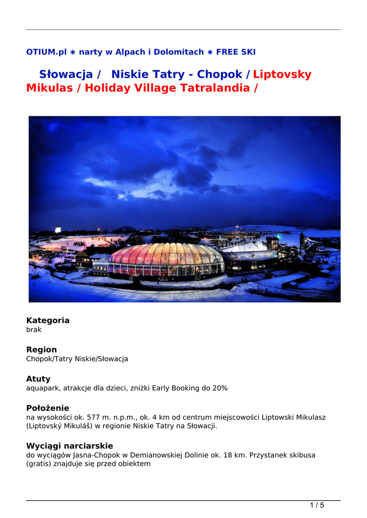 OTIUM.pl ∗ narty w Alpach i Dolomitach ∗ FREE SKI Słowacja / Niskie Tatry - Chopok / Liptovsky Mikulas / Holiday Village Tatralandia / Kategoria brak Region Chopok/Tatry Niskie/Słowacja Atuty aquapark, atrakcje dla dzieci, zniżki Early Booking do 20% Położenie na wysokości ok. 577 m. n.p.m., ok. 4 km od centrum miejscowości Liptowski Mikulasz (Liptovský Mikuláš) w regionie Niskie Tatry na Słowacji. Wyciągi narciarskie do wyciągów Jasna-Chopok w Demianowskiej Dolinie ok. 18 km. Przystanek skibusa (gratis) znajduje się przed obiektem 1/5 Wyposażenie recepcja, dwie restauracje (bransoletki z chipami do szafek w przebieralni, służą również do płacenia w barach i restauracji), lobby bar, 3 sale konferencyjne, wypożyczalnia sprzętu narciarskiego, parking (bez opłat, 1 miejsce na każdy apartament/domek). Brak przechowalni sprzętu narciarskiego Holiday Village Tatralandia to jedyny w swoim rodzaju kompleks turystyczny na Słowacji składający się łącznie z 155 domków i apartamentów. Domki rozmieszczone są w niezwykłych wioskach tematycznych, z której każda przenosi nas w inny świat - U Myśliwego, Liptowska Osada, Osada Indiańska, Zatoka Rybacka, Obóz Harcerski, U Winiarza, Rzemieślniczy Dwór, Park Centralny, Świat Dziecka, Romantyczny Ogród, Ranczo. Wioska znajduje się ok. 100 m od słynnego Aquapark Tatralandia, czyli największego całorocznego parku wodnego w centralnej Europie, wykorzystujące wody mineralne z własnego ujęcia, z głębokości ok. 2,5 km i temperaturze ok. 60oC. Aquapark składa się z dwóch części - letniej odkrytej oraz zadaszonej, która funkcjonuje przez cały rok. Aquapark Tatralandia to - 9 całorocznych basenów (temperatura wody 24-39oC z dobroczynnym działaniem na układ ruchowy, skórę i układ oddechowy) z mnóstwem wodnych atrakcji - siedzenia do masażu, łóżka wodne, grzybki wodne, przeciwprądy, kurtyny wodne, gejzery, huśtawka, wodna koszykówka, siatkówka, aqua-aerobic; 28 rur i zjeżdżalni, ponad 1800 m drogi do zjeżdżania - w tym 7 zjeżdżalni całorocznych; Wyspa piratów z Karaibów - niepowtarzalny tropikalny wellness z basenami z widokiem na Tatry; Saunowy Świat Celtów - kompleks 17 parowych, wodnych i masażowych kąpieli, saun i zabiegów; Tropical Paradise - jedna z dwóch w Europie hala z czterema basenami, dachem przepuszczającym promienie UV, mnóstwem atrakcji i tropikalnym klimatem; Wellness Paradise - kompleks masaży, kąpieli, okładów i innych leczniczych i relaksacyjnych zabiegów Internet tak (Wi-Fi gratis - przy recepcji) Karty kredytowe tak (Visa, Mastercard) Sport i relaks plac zabaw dla dzieci. Do dyspozycji (za opłatą) kręgle (2 tory, czynne 10.00-22.00), kino 5D, bilard (czynny 10.00-22.00), wypożyczalnia gier, wypożyczalnia sprzętu sportowego Aquapark Tatralandia kompleks basenowy (ok. 100 m od wioski, wstęp za dodatkową opłatą - Pakiet Tropical 63 PLN/os./dzień w terminach do 24.12.2016 i 80 zł/os./dzień w terminach od 24.12.2016 płatne przy rezerwacji; dzieci do 5,9 lat - gratis). Pakiet obejmuje korzystanie z 10 zjeżdżalni, basen, jacuzzi). Za dodatkową opłatą - Saunowy Świat Celtów, Tropical Paradise, Wellness Paradise Pokoje wioska dysponuje 155 apartamentami i domkami. Wszystkie apartamenty i domki posiadają w pełni wyposażony aneks kuchenny (kuchenka, lodówka, kuchenka mikrofalowa, czajnik, sztućce, talerze, garnki); TV-Sat, radio, telefon, niektóre z kominkiem. Łazienka z WC. Pokoje/apartamenty różnią się wystrojem w zależności od położenia 2/5 Apartament typ A (2-4 os) - piętrowy domek w zabudowie szeregowej (ok. 48-60 m<sup>2</sup>), składa się z salonu z możliwością dostawki dla piątej osoby (rozkładana sofa), aneksu kuchennego, łazienki z WC, na piętrze sypialnia z łóżkiem małżeńskim i 2 pojedynczymi. Apartamenty A rozmieszczone są w osadach Romantyczny Ogród, Dziecięcy Świat, Park Centralny. Przed każdym apartamentem znajduje się stolik i ławki do siedzenia. Niektóre mają balkon. Jeśli w domku znajduje się kominek - nie ma możliwości dostawki w salonie. Dostawka dla 5-tej osoby za dopłatą 915 zł/os. dorosła/tydz., 835 zł/dziecko 6-11,9 lat/tydz. (na zapytanie) Domek typ B (2-3 os) - wolnostojący domek parterowy (ok. 30-40 m<sup>2</sup>), składa się z salonu z możliwością dostawki dla czwartej osoby (rozkładana sofa), aneksu kuchennego, łazienki z WC, sypialni z 1 łóżkiem małżeńskim i 1 pojedynczym. Domki typu B rozmieszczone są w osadach - U myśliwego, Liptowska Osada, Osada Indiańska, Zatoka Rybacka, Obóz Harcerski, U winiarza, Rzemieślniczy dwór. Dostawka dla 4-tej osoby za dopłatą 915 zł/os. dorosła/tydz., 835 zł/dziecko 6-11,9 lat/tydz. (na zapytanie) Domek typ C (5-7 os) - wolnostojący domek piętrowy (ok. 60-80 m<sup>2</sup>), składa się z - salonu z możliwością dostawki dla ósmej osoby (rozkładana sofa), aneksu kuchennego, łazienki z WC, na piętrze dwie sypialnie (4 osobowa z pojedynczymi łóżkami i 3 osobowa z łóżkiem małżeńskim i pojedynczym). Domki typu C rozmieszczone są w osadach - U myśliwego, Rzemieślniczy Dwór. Dostawka dla 8-ej osoby za dopłatą 915 zł/os. dorosła/tydz., 835 zł/dziecko 6-11,9 lat/tydz. (na zapytanie) Wyżywienie śniadania w formie bufetu, ciepłe 3 daniowe kolacje podawane przez kelnera. Napoje do kolacji dodatkowo płatne Pieski nie Kategoria lokalna brak Kolacja Wigilijna obowiązkowo płatna przy rezerwacji 25 euro/os/dorosła, 15 euro/dzieci od 6-11,9 lat, w PLN w przeliczeniu wg kursu sprzedaży EUR banku PNB Paribas z dnia rezerwacji Kolacja Sylwestrowa obowiązkowo płatna przy rezerwacji 45 euro/os/dorosła, 28 euro/dzieci od 6-11,9 lat, w PLN w przeliczeniu wg kursu sprzedaży EUR banku PNB Paribas z dnia rezerwacji Świadczenia 7 noclegów, wyżywienie 2 x dziennie wg opisu, ubezpieczenie Signal Iduna - Bezpieczne Podróże (w tym rekreacyjne uprawianie narciarstwa zjazdowego, biegowego lub