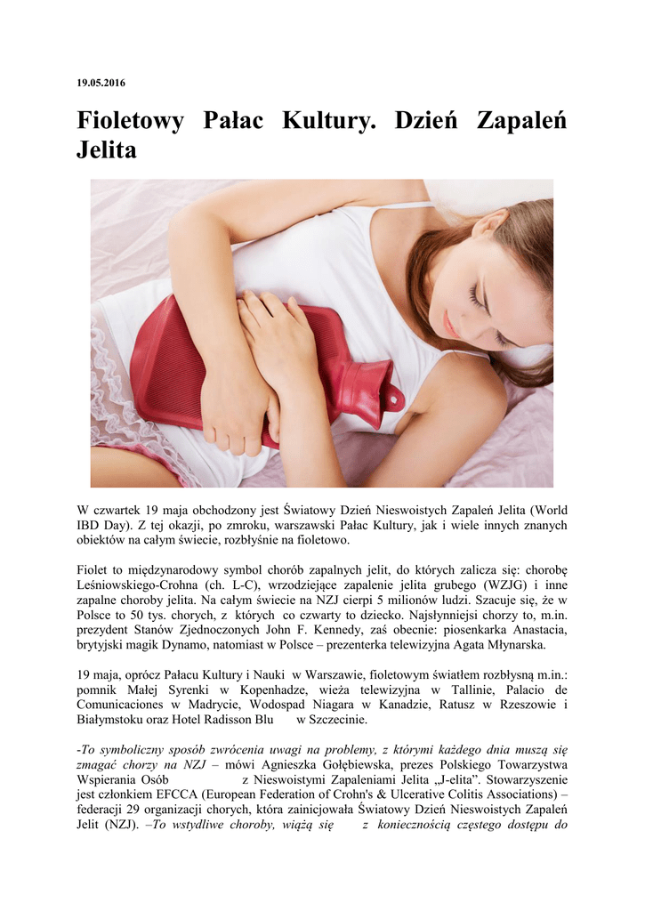 19.05.2016 Fioletowy Pałac Kultury. Dzień Zapaleń Jelita W czwartek 19 maja obchodzony jest Światowy Dzień Nieswoistych Zapaleń Jelita (World IBD Day). Z tej okazji, po zmroku, warszawski Pałac Kultury, jak i wiele innych znanych obiektów na całym świecie, rozbłyśnie na fioletowo. Fiolet to międzynarodowy symbol chorób zapalnych jelit, do których zalicza się: chorobę Leśniowskiego-Crohna (ch. L-C), wrzodziejące zapalenie jelita grubego (WZJG) i inne zapalne choroby jelita. Na całym świecie na NZJ cierpi 5 milionów ludzi. Szacuje się, że w Polsce to 50 tys. chorych, z których co czwarty to dziecko. Najsłynniejsi chorzy to, m.in. prezydent Stanów Zjednoczonych John F. Kennedy, zaś obecnie: piosenkarka Anastacia, brytyjski magik Dynamo, natomiast w Polsce – prezenterka telewizyjna Agata Młynarska. 19 maja, oprócz Pałacu Kultury i Nauki w Warszawie, fioletowym światłem rozbłysną m.in.: pomnik Małej Syrenki w Kopenhadze, wieża telewizyjna w Tallinie, Palacio de Comunicaciones w Madrycie, Wodospad Niagara w Kanadzie, Ratusz w Rzeszowie i Białymstoku oraz Hotel Radisson Blu w Szczecinie. -To symboliczny sposób zwrócenia uwagi na problemy, z którymi każdego dnia muszą się zmagać chorzy na NZJ – mówi Agnieszka Gołębiewska, prezes Polskiego Towarzystwa Wspierania Osób z Nieswoistymi Zapaleniami Jelita „J-elita”. Stowarzyszenie jest członkiem EFCCA (European Federation of Crohn's & Ulcerative Colitis Associations) – federacji 29 organizacji chorych, która zainicjowała Światowy Dzień Nieswoistych Zapaleń Jelit (NZJ). –To wstydliwe choroby, wiążą się z koniecznością częstego dostępu do toalety – kontynuuje Gołębiewska. – Ale w Polsce największym problemem jest nierówny dostęp do leczenia dorosłych i dzieci, które są pozbawione możliwości korzystania ze skutecznej terapii biologicznej. Choroby zapalne jelit objawiają się m.in.: silnymi bólami brzucha, biegunkami, zmęczeniem i utratą masy ciała, a u dzieci opóźnieniem wzrastania. Są nieuleczalne – wymagają zażywania leków przez całe życie, często interwencji chirurgicznej (usunięcia fragmentu lub całego jelita). U chorych, którzy nie reagują na standardowe leczenie skuteczną i zalecaną przez specjalistów metodą jest terapia biologiczna, bezpłatna dla pacjentów w większości państw Unii Europejskiej. W Polsce NFZ refunduje preparaty biologiczne z dwoma substancjami czynnymi: infliksimabem i adalimumabem u dorosłych z ch. L-C, u dzieci tylko infliksimabem. Natomiast we WZJG jedynie dorośli mają możliwość skorzystania z terapii ratunkowej (3 dawek leku) w przypadku zagrożenia kolektomią – usunięcie całego jelita grubego. Towarzystwo „J-elita” powstało w 2005 r. z inicjatywy chorych i rodziców dzieci cierpiących na NZJ. Od 2007 r. ma status organizacji pożytku publicznego. Obecnie ma oddziały w 11 województwach i skupia ponad 1,6 tys. osób. Organizuje m.in. Dni Edukacji o NZJ, obozy i turnusy rehabilitacyjne dla chorych dzieci i ich rodziców, wydaje kwartalnik „J-elita”, poradniki, i przekazuje darowizny na zakup sprzętu przez placówki leczące chorych na NZJ. W 2014 r. pomogło w zakupie wyposażenia za 92 tys. zł dla 21 szpitali w całej Polsce. Organizacja od lat zabiega o dostęp do nowoczesnych metod leczenia. http://www.suwalki24.pl/article/1,fioletowy_palac_kultury_dzien_zapalen_jelita#