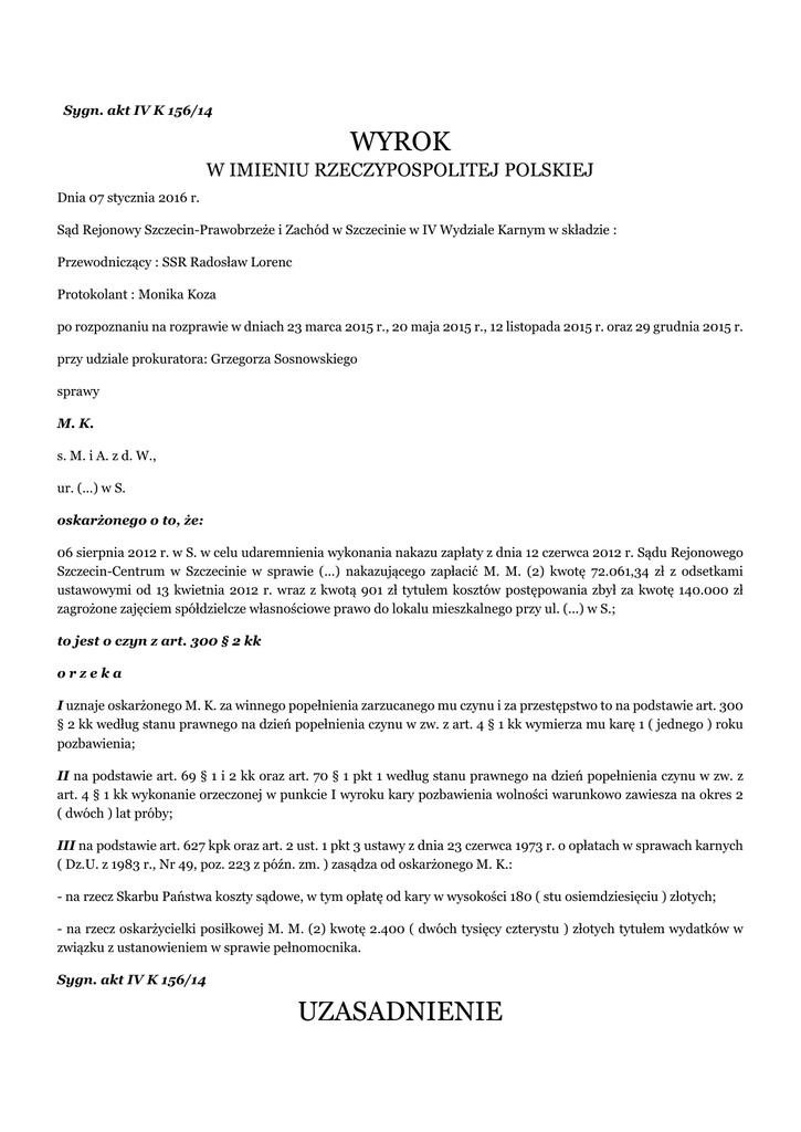 Sygn. akt IV K 156/14 WYROK W IMIENIU RZECZYPOSPOLITEJ POLSKIEJ Dnia 07 stycznia 2016 r. Sąd Rejonowy Szczecin-Prawobrzeże i Zachód w Szczecinie w IV Wydziale Karnym w składzie : Przewodniczący : SSR Radosław Lorenc Protokolant : Monika Koza po rozpoznaniu na rozprawie w dniach 23 marca 2015 r., 20 maja 2015 r., 12 listopada 2015 r. oraz 29 grudnia 2015 r. przy udziale prokuratora: Grzegorza Sosnowskiego sprawy M. K. s. M. i A. z d. W., ur. (...) w S. oskarżonego o to, że: 06 sierpnia 2012 r. w S. w celu udaremnienia wykonania nakazu zapłaty z dnia 12 czerwca 2012 r. Sądu Rejonowego Szczecin-Centrum w Szczecinie w sprawie (...) nakazującego zapłacić M. M. (2) kwotę 72.061,34 zł z odsetkami ustawowymi od 13 kwietnia 2012 r. wraz z kwotą 901 zł tytułem kosztów postępowania zbył za kwotę 140.000 zł zagrożone zajęciem spółdzielcze własnościowe prawo do lokalu mieszkalnego przy ul. (...) w S.; to jest o czyn z art. 300 § 2 kk orzeka I uznaje oskarżonego M. K. za winnego popełnienia zarzucanego mu czynu i za przestępstwo to na podstawie art. 300 § 2 kk według stanu prawnego na dzień popełnienia czynu w zw. z art. 4 § 1 kk wymierza mu karę 1 ( jednego ) roku pozbawienia; II na podstawie art. 69 § 1 i 2 kk oraz art. 70 § 1 pkt 1 według stanu prawnego na dzień popełnienia czynu w zw. z art. 4 § 1 kk wykonanie orzeczonej w punkcie I wyroku kary pozbawienia wolności warunkowo zawiesza na okres 2 ( dwóch ) lat próby; III na podstawie art. 627 kpk oraz art. 2 ust. 1 pkt 3 ustawy z dnia 23 czerwca 1973 r. o opłatach w sprawach karnych ( Dz.U. z 1983 r., Nr 49, poz. 223 z późn. zm. ) zasądza od oskarżonego M. K.: - na rzecz Skarbu Państwa koszty sądowe, w tym opłatę od kary w wysokości 180 ( stu osiemdziesięciu ) złotych; - na rzecz oskarżycielki posiłkowej M. M. (2) kwotę 2.400 ( dwóch tysięcy czterystu ) złotych tytułem wydatków w związku z ustanowieniem w sprawie pełnomocnika. Sygn. akt IV K 156/14 UZASADNIENIE M. K. oraz M. M. (2) zawarli w dniach 11 września 2008 r. oraz 05 grudnia 2009 r. i 31 marca 2011 r. trzy umowy najmu lokali użytkowych znajdujących się przy ul (...) w S. a należących do M. M. (2). Na podstawie pierwszej z tych umów M. K. zobowiązany był do regulowania czynszu najmu 6.000 zł brutto ( od pewnego momentu 7.000 zł ) + koszty oraz miał zapłacić 120.000 zł w 12 ratach tytułem zakupu wyposażenia. W lokalu tym prowadził restaurację (...). Na podstawie umowy z 05 grudnia 2009 r. M. K. zobowiązany był do zapłaty za wynajem kolejnego lokalu w tej lokalizacji kwoty 4.000 zł netto miesięcznie oraz koszty. M. K. dokonywał nieregularnych wpłat powyższych należności, lecz mimo tego M. M. (2) zawarła z nim w dniu 31 marca 2011 r. kolejną umowę najmu lokalu użytkowego przylegającego do poprzednich lokali gdyż założeniem miało być zwiększenie wpływów z działalności prowadzonej przez M. K., co miało przyczynić się do regulowania wszystkich należności w terminie. Czynsz za ten lokal ustalono na 3.500 zł netto + koszty. M. K. wbrew zapewnieniom nie regulował należności tak jak wynikało to z zawartych umów. W związku z tym M. M. (2) wystąpiła przeciwko niemu z powództwem o zapłatę kwoty 47.118,29 zł w wyniku czego w dniu 04 listopada 2011 r. Sąd Rejonowy Szczecin-Centrum wydał nakaz zapłaty w sprawie (...), który po nadaniu klauzuli wykonalności został skierowany do postępowania egzekucyjnego, w związku z którym zajęte zostało należącego do M. K. własnościowe spółdzielcze prawo do lokalu mieszkalnego położonego w S. przy ul. (...). M. K. dobrowolnie regulował należności wobec komornika w postępowaniu (...), natomiast na konto M. M. (2) uiszczał on bezpośrednio kwoty różnej wysokości, które nieodpowiadały miesięcznej wysokości opłat z tytułu czynszu najmu lokali. Z tego też powodu narastało zadłużenie M. K. wobec M. M. (2). Celem zabezpieczenia bieżących należności M. K. w dniu 18 stycznia 2012 r. podpisał deklarację wekslową zgodnie z którą M. M. (2) miała prawo wypełnić weksel in blanco do wysokości należności M. K.. Weksel taki M. K. podpisał w dniu 20 stycznia 2012 r. Dowód: - częściowo wyjaśnienia oskarżonego M. K., k. 318-320, - zeznania M. M. (2), k. 22-24, 159-160, 321-322, - zeznania K. M., k. 161-163, 340-342, - umowy najmu, k. 201-212 akt sprawy (...), - wezwania do zapłaty, k. 199-205, - faktura VAT, k. 198, - nakaz zapłaty z 04 listopada 2011 r., k. 56, - dokumentacja z postępowania egzekucyjnego (...), k.25-30, 47-48, 57, - zestawienie zadłużenia, k. 31-35, - deklaracja wekslowa, k. 213 akt sprawy (...), - weksel, k. 4 akt sprawy (...). Z uwagi na fakt, iż zadłużenie M. K. wciąż narastało, gdyż nie uiszczał on regularnie należności z tytułu najmu M. M. (2) pismem z dnia 13 marca 2012 r. wezwała go do zapłaty z tego tytułu kwoty 72.061,34 zł pod rygorem wypełnienia weksla. M. K. na to wezwanie nie odpowiedział w związku z czym M. M. (2) wypełniła weksel w dniu 20 marca 2012 r. na ww. kwotę, a w dniu 13 kwietnia 2012 r. wystąpiła do Sądu Szczecin-Centrum z powództwem przeciwko M. K. o zapłatę kwoty 72.061,34 zł wynikającej z przedmiotowego weksla. W dniu 12 czerwca 2012 r. Sąd Rejonowy SzczecinCentrum w sprawie (...) wydał nakaz zapłaty przeciwko M. K., którym zasądził on ww. kwotę 72.061,34 złotych oraz 901 zł tytułem kosztów postępowania. Nakaz ten został doręczony na adres zamieszkania M. K., to jest. ul. (...) w S. w dniu 31 lipca 2012 r. – odebrała go żona M. I. K., która występowała w dotychczas prowadzonym postępowaniu egzekucyjnym (...) przeciwko M. K. jako pełnomocnik. Dowód: - częściowo wyjaśnienia oskarżonego M. K., k. 318-320, - zeznania M. M. (2), k. 22-24, 159-160, 321-322, - zeznania K. M., k. 161-163, 340-342, - częściowo zeznania świadka I. K., k. 173v-174,381-383, - wezwanie do zapłaty k. 5 akt sprawy (...) ( uprzed