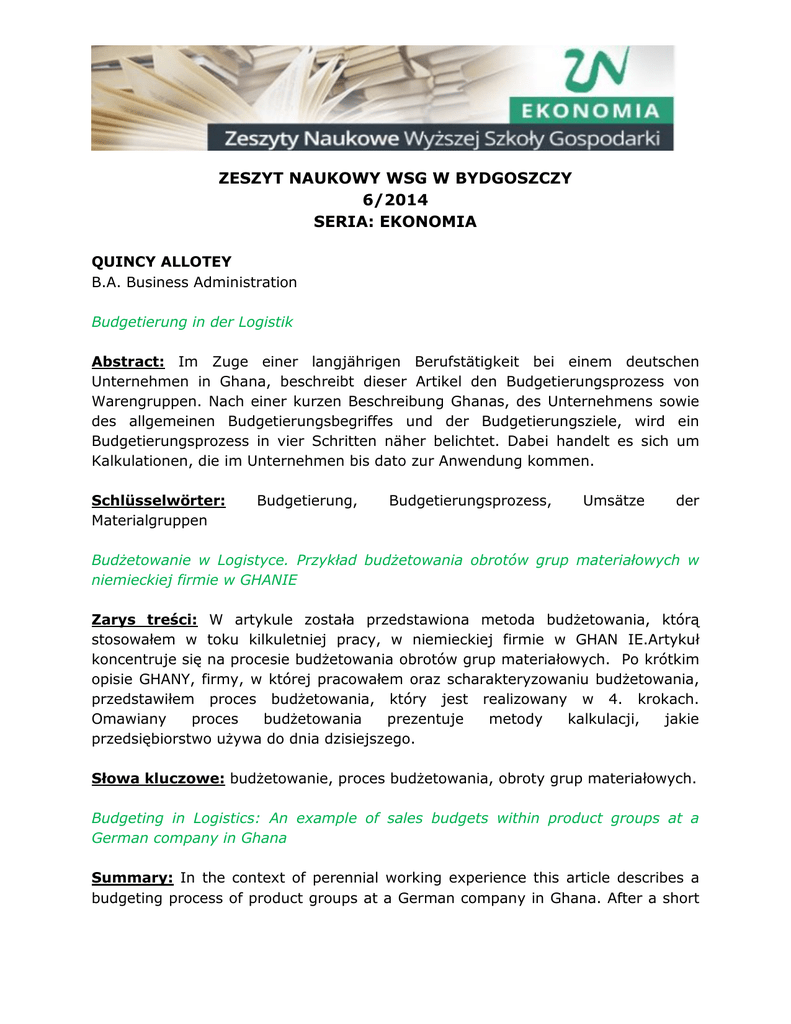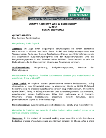 ZESZYT NAUKOWY WSG W BYDGOSZCZY 6/2014 SERIA: EKONOMIA QUINCY ALLOTEY B.A. Business Administration Budgetierung in der Logistik Abstract: Im Zuge einer langjährigen Berufstätigkeit bei einem deutschen Unternehmen in Ghana, beschreibt dieser Artikel den Budgetierungsprozess von Warengruppen. Nach einer kurzen Beschreibung Ghanas, des Unternehmens sowie des allgemeinen Budgetierungsbegriffes und der Budgetierungsziele, wird ein Budgetierungsprozess in vier Schritten näher belichtet. Dabei handelt es sich um Kalkulationen, die im Unternehmen bis dato zur Anwendung kommen. Schlüsselwörter: Materialgruppen Budgetierung, Budgetierungsprozess, Umsätze der Budżetowanie w Logistyce. Przykład budżetowania obrotów grup materiałowych w niemieckiej firmie w GHANIE Zarys treści: W artykule została przedstawiona metoda budżetowania, którą stosowałem w toku kilkuletniej pracy, w niemieckiej firmie w GHAN IE.Artykuł koncentruje się na procesie budżetowania obrotów grup materiałowych. Po krótkim opisie GHANY, firmy, w której pracowałem oraz scharakteryzowaniu budżetowania, przedstawiłem proces budżetowania, który jest realizowany w 4. krokach. Omawiany proces budżetowania prezentuje metody kalkulacji, jakie przedsiębiorstwo używa do dnia dzisiejszego. Słowa kluczowe: budżetowanie, proces budżetowania, obroty grup materiałowych. Budgeting in Logistics: An example of sales budgets within product groups at a German company in Ghana Summary: In the context of perennial working experience this article describes a budgeting process of product groups at a German company in Ghana. After a short description of Ghana, the company as well as general budgeting and its targets, a four-step budgeting process is exposed, that is in use up till now. Keywords: budgeting, budgeting process, budgeting process of product groups. PAWEŁ ANTOSZAK, PAULINA JOANNA GLIŃSKA Wyższa Szkoła Gospodarki w Bydgoszczy Zakład Gospodarowania Zasobami Ludzkimi Instytut Ekonomii i Zarządzania Wydział Studiów Stosowanych Controlling personalny jako narzędzie wspomagające zarządzanie zasobami ludzkimi w przedsiębiorstwie Activ Med Zarys treści: Celem niniejszej artykułu jest omówienie zagadnień związanych z controllingiem personalnym, analiza funkcjonowania systemu controllingu personalnego oraz ocena jego funkcjonalności dla działu zasobów ludzkich w przedsiębiorstwie usługowym Activ Med. Zastosowanie controllingu personalnego pozwoliło na efektywne koordynowanie działań, systematyczne wykrywanie odchyleń, podejmowanie czynności korygujących. Przyjęto tezę, iż jego wdrożenie umożliwiło racjonalne gospodarowanie zasobami ludzkimi. Metodą badawczą jest natomiast analiza treści zawartych w dokumentach przedsiębiorstwa Activ Med, przekazana przez controllera personalnego firmy. Słowa kluczowe: controlling personalny, kadry, dział personalny, zarządzanie zasobami ludzkim, przedsiębiorstwo usługowe. Personnel Controlling as a tool supporting management of human resources in the company Activ Med Summary: The aim of this article is to discuss issues related to personnel controlling, analysis of the functioning of the personnel controlling and the evaluation of its functionality for human resources in the company service Activ Med. The use of personnel controlling it possible to effectively coordinate activities, systematic detection of deviations, taking corrective actions. Adopted the thesis that its implementation has enabled the rational management of human resources. The research method is analysis of the content contained in the company Activ Med forwarded by the Personnel Controller. Keywords: Personnel Controlling, staff, human resources department, human resources management, company service. EMILIA FLADROWSKA Wyższa Szkoła Gospodarki w Bydgoszczy Instytut Ekonomii i Zarządzania, Zakład Finansów i Rachunkowości Uniwersytet Technologiczno-Przyrodniczy w Bydgoszczy Wydział Zarządzania Rachunkowość zarządcza w regulacjach Krajowego Standardu Rachunkowości nr 3 – Niezakończone usługi budowlane a praktyka wybranych przedsiębiorstw województwa kujawsko-pomorskiego Zarys treści: Jednym z bardziej skomplikowanych zagadnień rachunkowości są kontrakty długoterminowe, w tym niezakończone usługi budowlane, dlatego Krajowy Komitet Standardów Rachunkowości (KSR), wsparł przedsiębiorców i księgowych szczegółową regulacją opisywanego zagadnienia, podejmując uchwałę nr 9/09 z dnia 26 października 2009 w sprawie przyjęcia znowelizowanego Krajowego Standardu Rachunkowości (KSR) nr 3 „Niezakończone usługi budowlane”, który wskazuje na konieczność zbudowania i bieżącego stosowania, w tym obszarze, podsystemu Rachunkowości Zarządczej, zintegrowanego z podsystemem Rachunkowości Finansowej. Badania wybranych przedsiębiorstw wykazują, że KSR nr 3 nie jest w praktyce stosowany, co uniemożliwia prowadzenie bieżącej kontroli zarządczej zarówno w sferze budżetowania kosztów, jak i przychodów umów budowlanych (kontraktów długoterminowych). Podstawową przyczyną jest eksploatacja przestarzałych podsystemów Rachunkowości Finansowej, napisanych w DOS, nie mogących współpracować na WE i WY z EXCEL-em, w którym to narzędziu najczęściej budują podsystemy Rachunkowości Zarządczej małe i średnie przedsiębiorstwa, ze względu na prostotę narzędzia, jego funkcjonalność i znikome koszty (nie ma konieczności zakupu dedykowanych podsystemów Rachunkowości Zarządczej, ani zatrudniania informatyków). Słowa kluczowe: MSR 11, KSR 3, kontrakty długoterminowe. Management accounting in the regulations of the National Accounting Standard no. 3 – Unfinished construction services versus the practices of the selected companies from the Kujavian and Pomeranian Voivodeship Summary: One of the most complex accounting issues are long-term contracts including the unfinished construction services. Therefore, the National Accou