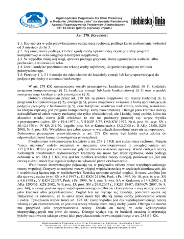 Ogólnopolskie Pogotowie dla Ofiar Przemocy w Rodzinie „Niebieska Linia” na zlecenie Państwowej Agencji Rozwiązywania Problemów Alkoholowych 801 12-00-02 (płatny pierwszy impuls) Art. 278. [Kradzież] § 1. Kto zabiera w celu przywłaszczenia cudzą rzecz ruchomą, podlega karze pozbawienia wolności od 3 miesięcy do lat 5. § 2. Tej samej karze podlega, kto bez zgody osoby uprawnionej uzyskuje cudzy program komputerowy w celu osiągnięcia korzyści majątkowej. § 3. W wypadku mniejszej wagi, sprawca podlega grzywnie, karze ograniczenia wolności albo pozbawienia wolności do roku. § 4. Jeżeli kradzież popełniono na szkodę osoby najbliższej, ściganie następuje na wniosek pokrzywdzonego. § 5. Przepisy § 1, 3 i 4 stosuje się odpowiednio do kradzieży energii lub karty uprawniającej do podjęcia pieniędzy z automatu bankowego. W art. 278 KK zamieszczone zostały przestępstwa: kradzieży (zwykłej); (§ 1), kradzieży programu komputerowego (§ 2), kradzieży energii lub karty bankomatowej (§ 5) oraz wypadek mniejszej wagi każdego z tych przestępstw (§ 3). Dobrem chronionym przez art. 278 KK są prawa majątkowe do: rzeczy ruchomej (§ 1), programu komputerowego (§ 2), energii (§ 5), prawa majątkowe związane z kartą uprawniającą do podjęcia pieniędzy z bankomatu (§ 5), oraz faktyczne władztwo nad: rzeczą ruchomą, nośnikiem, na którym zapisany jest program komputerowy, kartą bankomatową. Dlatego jako kradzież należy zakwalifikować zabór rzeczy ruchomej nie tylko właścicielowi, ale i każdej innej osobie, która nią aktualnie włada, nawet jeśli władztwo to nie ma podstawy prawnej czy wręcz wynika z przestępstwa (uchw. SN z 19.4.1977 r., VII KZP 3/77, OSNKW 1977, Nr 6, poz. 54; wyr. SN z 30.12.1970 r., IV KR 211/70, Legalis; post. SA w Katowicach z 13.2.2008 r., II AKp 24/08, KZS 2008, Nr 4, poz. 83). Wyjątkiem jest zabór rzeczy w warunkach dozwolonej prawnie samopomocy. Podmiotem przestępstw przewidzianych w art. 278 KK może być każda osoba zdolna do odpowiedzialności karnej (przestępstwa powszechne). Przedmiotem wykonawczym kradzieży z art. 278 § 1 KK jest cudza rzecz ruchoma. Pojęcie "rzecz ruchoma" należy rozumieć w znaczeniu cywilnoprawnym z uwzględnieniem art. 115 § 9 KK. Rzecz jest cudza wówczas, gdy nie stanowi własności sprawcy. Wśród cudzych rzeczy ruchomych przedmiotem wykonawczym kradzieży nie może być rzecz zgubiona, która podlega ochronie w art. 284 § 3 KK. Nie jest też możliwa kradzież rzeczy niczyjej, ponieważ nie jest ona rzeczą cudzą i może być legalnie nabyta na własność przez zawłaszczenie. Wątpliwości interpretacyjne pojawiają się w przypadku zaboru przez współuprawnionego rzeczy wspólnej. Dotyczy to zarówno rzeczy objętej współwłasnością w częściach ułamkowych, jak i wspólnością łączną (np. w małżeństwie). Szeroką aprobatę uzyskał pogląd, iż rzecz wspólna jest dla sprawcy cudza (wyr. SN z 9.4.1997 r., III KKN 241/96, Prok. i Pr. 1997, Nr 10, poz. 6; wyr. SN z 4.6.1998 r., V KKN 220/97, Prok. i Pr. 1999, Nr 1, poz. 3; wyr. SA w Krakowie z 14.8.2002 r., II AKa 1295/02, KZS 2002, Nr 9, poz. 13; post. SN z 29.8.2007 r., I KZP 18/07, OSNKW 2007, Nr 9, poz. 64), a czyny pozbawiające współuprawnionego możliwości korzystania z niej należy oceniać jako kradzież albo przywłaszczenie. Pogląd ten nie wydaje się zasadny, ponieważ opiera się faktycznie na założeniu, że ta sama rzecz może być dla tej samej osoby jednocześnie własna i cudza. Tymczasem wobec treści art. 195 KC rzecz wspólna jest dla współuprawnionego rzeczą własną z tym zastrzeżeniem, że jest ona rzeczą własną także innej osoby (osób). Dlatego nie można mu przypisać celu przywłaszczenia rzeczy. Działa on raczej w celu wykonywania nieprzysługujących mu praw do rzeczy. Dlatego wydaje się, że bardziej zasadną interpretacją byłoby traktowanie takiego czynu jako przywłaszczenia prawa majątkowego z art. 284 § 1 KK. O gó l no po ls k ie P ogot ow ie d la Of i ar Pr z em ocy w R odz i ni e „ N ie bi es ka L i ni a” A l . J er oz o l i m s k i e 1 5 5 , 0 2 - 3 2 6 W ar s z a w a, t e l . + 4 8 2 2 6 6 6 - 1 0 - 3 6 , f a x. 2 2 2 5 0 - 6 3 - 1 1 w w w . nieb i esk a li ni a. i nf o, e - m a il : nie bi es ka l i nia @ ni eb ie sk al i ni a. i nf o Ogólnopolskie Pogotowie dla Ofiar Przemocy w Rodzinie „Niebieska Linia” na zlecenie Państwowej Agencji Rozwiązywania Problemów Alkoholowych 801 12-00-02 (płatny pierwszy impuls) Do energii w rozumieniu art. 278 § 5 KK zalicza się energię elektryczną, gazową, cieplną, atomową, wodną (wyr. SN z 26.2.2004 r., IV KK 302/04, OSNwSK 2004, Nr 1, poz. 413). Zdaniem SN, przepis ten nie ma jednak zastosowania do nośnika energii wyodrębnionego w rzecz ruchomą, którego zabór należy oceniać według art. 278 § 1 KK (post. SN z 9.6.2006 r., I KZP 14/06, OSNKW 2006, Nr 7-8, poz. 67), ani do zaboru wody z urządzeń wodociągowych (post. SN z 9.6.2006 r., I KZP 15/06, OSNwSK 2006, Nr 1, poz. 1217). Odrębna kryminalizacja kradzieży karty uprawniającej do podjęcia pieniędzy z automatu bankowego wydaje się równoznaczna z wyłączeniem jej spod kategorii rzeczy ruchomej, mimo że jest ona "dokumentem uprawniającym do otrzymania sumy pieniędzy" w rozumieniu art. 115 § 9 KK (uchw. SN z 21.10.2003 r., I KZP 33/03, OSNKW 2003, Nr 11-12, poz. 96). Jeśli jednak karta uprawniająca do wypłaty pieniędzy z bankomatu pełni też funkcję płatniczą, to jest rzeczą jako środek płatniczy (art. 115 § 9 KK) i jej zabór należy kwalifikować z art. 278 § 1 KK . Za przedmiot wykonawczy kradzieży nie można uznać dokumentów, które nie mieszczą się w art. 115 § 9 KK (wyr. SA w Krakowie z 26.1.1995 r., II Akr 247/94, KZS 1995, Nr 1, poz. 27). Ich zabór może być kwalifikowany z art. 275 § 1 lub art. 276 KK. Wartość rzeczy ruchomej z art. 278 § 1 KK musi przekraczać 250 zł. W przeciwnym razie