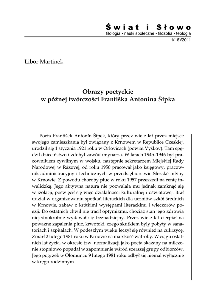 Świat i Słowo filologia • nauki społeczne • filozofia • teologia 1(16)/2011 Libor Martinek Obrazy poetyckie w późnej twórczości Františka Antonína Šípka Poeta František Antonín Šípek, który przez wiele lat przez miejsce swojego zamieszkania był związany z Krnowem w Republice Czeskiej, urodził się 1 stycznia 1921 roku w Orlovicach (powiat Vyškov). Tam spędził dzieciństwo i zdobył zawód młynarza. W latach 1945–1946 był pracownikiem cywilnym w wojsku, następnie sekretarzem Miejskiej Rady Narodowej w Rázovej, od roku 1950 pracował jako księgowy, pracownik administracyjny i technicznych w przedsiębiorstwie Slezské mlýny w Krnowie. Z powodu choroby płuc w roku 1957 przeszedł na rentę inwalidzką. Jego aktywna natura nie pozwalała mu jednak zamknąć się w izolacji, poświęcił się więc działalności kulturalnej i oświatowej. Brał udział w organizowaniu spotkań literackich dla uczniów szkół średnich w Krnowie, zabaw z krótkimi występami literackimi i wieczorów poezji. Do ostatnich chwil nie tracił optymizmu, chociaż stan jego zdrowia niejednokrotnie wydawał się beznadziejny. Przez wiele lat cierpiał na poważne zapalenia płuc, krwotoki, czego skutkiem były pobyty w sanatoriach i szpitalach. W podeszłym wieku leczył się również na cukrzycę. Zmarł 2 lutego 1981 roku w Krnovie na marskość wątroby. W ciągu ostatnich lat życia, w okresie tzw. normalizacji jako poeta skazany na milczenie stopniowo popadał w zapomnienie wśród szerszej grupy odbiorców. Jego pogrzeb w Ołomuńcu 9 lutego 1981 roku odbył się niemal wyłącznie w kręgu rodzinnym. 256 Libor Martinek Twórczością Šípka systematycznie zajmowali się opawski historyk literatury Jiří Urbanec1 i ostrawski krytyk literacki Drahomír Šajtar2. Na język polski wiersze Šípka na początku lat dziewięćdziesiątych XX wieku przetłumaczył polski pisarz z Zaolzia Władysław Sikora3. Šípek publikował w czasopismach od roku 1947. Pierwszy zbiór poezji Blíž k zemi (Bliżej ziemi, 1959) zawiera utwory inspirowane młodością spędzoną na wsi i życiem rodzinnym; poeta tomik zadedykował swoim rodzicom. Wiersze bliskie są poetyckiemu realizmowi przesyconemu głeboką emocjonalnością, często wypełnione gorącym uczuciem do ziemi i tych, którzy na niej pracują. Nie jest to jednak pochwała chłopstwa, ale raczej pochwała poczciwej aktywności zwykłego człowieka, czasami przechodząca w deklaratywność. Inną grupę tworzy liryka miłosna i rodzinna. Swoją silną obrazowość Šípek opanował w wolnych wierszach poematu epickiego Zpěv nad městem (Śpiew nad miastem, 1961) wydanego przy okazji III edycji „Teatralnego Maja” w Krnovie. Poeta ogląda miasta z Cvilínskiego Wzgórza i umieszcza w wersach sugestywne obrazy życia w nim. Kolejny zbiór otrzymał tytuł Jen jednou stěhovavý pták (Tylko raz ptak wędrowny, 1962), w którym najlepiej brzmią życiowe filozoficzne wiersze traktujące o upływie czasu. Nowe podejście do poetyki charakteryzuje kolejny zbiór Šípka Vox humana (1969). Wiersze nastrojone przede wszystkim kameralnie charakteryzują się filozoficznym relatywizmem i deziluzją, jednak mimo dość pesymistycznego tonu widoczne jest w nich ciążenie ku ludziom i człowieczeństwu. W finale zbioru znalazł się emblematyczny wiersz Lidský hlas (Ludzki głos). Po tym poetycko wyważonym zbiorze przychodzi ostatni tomik wydany za życia poety, Strom přes cestu (Drzewo po drugiej stronie drogi, 1970), gdzie odnaleźć można wiersze na różnym poziomie, często przypominające początki twórczości, w których Šípek nieustannie akcentuje młodość i optymizm. Lirykę osobistą dzięki ograniczaniu obrazowości cechuje natomiast skrótowość czy wręcz gnomiczność. Wiersz Šípka Dům v zahradách (Dom w ogrodach, 1982) został wydany jako odrębne dzieło z ilustracjami plastyka Svatoslava Böhma. W rękopisie pozostał zbiór autorski Když zrno tluče křídly (Kiedy ziarno łopocze skrzydłami), zawierający sześćdziesiąt utworów potyckich, z których Drahomír Šajtar przygotował wybór pod tym samym tytułem (posłowie do wyboru napisał autor niniejszego artykułu), wyda- 1 J. Urbanec, Úspěšný debut krnovského básníka (F. A. Šípek: Blíž k zemi), „Krnovsko” 1960, nr. 9, 4. strona okładki; Šípkova oslava Krnova, „Kulturní kalendář města Krnova” 1961, nr. 6, s. 8. Tvůrčí vývoj F. A. Šípka, „Časopis Slezského muzea – vědy historické”, nr. 31, 1982, s. 49–60; Zemřel F. A. Šípek, „Svobodné slovo”, 1981, nr. 40, s. 5; Šípek, František Antonín, [w:] Biografický slovník Slezska a severní Moravy. Z. 2. Optys – Ostravská univerzita, Opava–Ostrava 1994, s. 117–118. 2 D. Šajtar, Nad básnickou sbírkou F. A. Šípka, „Červený květ”, 1959, nr. 11, s. 303; Nad poezií F. A. Šípka, „Kulturní měsíčník“, 1986, nr. 1, s. 64–65. 3 F. A. Šípek, Stogowanie, Listy, „Głos Ludu”, 28.07.1990. Obrazy poetyckie w późnej twórczości F.A. Šípka ny przez Bibliotekę Miejską w Krnovie w roku 2000 z ilustracjami Vladivoja Jindřicha. I na tym wyborze chciałbym się skoncentrować. Obraz i symbol znajdują się w nim w ścisłym związku. Za Jiřím Pecharem „obraz4 jest tworzony poprzez wyrazy użyte w sensie obrazowym, czyli przeniesionym lub symbolicznym”5. Różnica między symbolem a obrazem tkwi w tym, że symbol oddziałuje nieustannie, natomiast obraz bywa zazwyczaj wywołany tylko raz. Obok obrazów symbole zajmują w poezji istotne miejsce, dlatego zostały włączone do niniejszych rozważań. Zostaną one poddane oglądowi analitycznemu oraz określone zostanie ich znaczenie w wierszu pod względem celu i sensu. Obraz ma wiele form (może to być wyobrażenie plastyczne lub muzyczne, odbicie czyjejś podobizny, wizja, część wiersza i temu podobne). Dla potrzeb moich rozważań istotny jest obraz taki, jakim bada