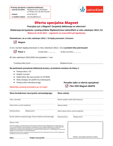 Prosimy uprzejmie o odesłanie deklaracji: – pocztą na adres: Wydawnictwo LektorKlett ul. Polska 114, 60-401 Poznań – faxem: 61 84 96 212, – e-mailem (skan): [email protected]. Oferta specjalna Magnet Pracujesz już z Magnet? Uzupełnij deklarację na odwrocie! Deklaracja korzystania z podręczników Wydawnictwa LektorKlett w roku szkolnym 2012 /13 Ważna do 15.05.2012 – regulamin na www.klett.pl/regulaminy Oświadczam, że w roku szkolnym 2012 / 13 będę pracować z kursem: Magnet Z ww. kursem będę pracować w roku szkolnym 2012 / 13 z uczniami klas pierwszych: Klasa 1: Liczba klas: liczba uczniów: W roku szkolnym 2011/2012 korzystałam / -em: Z podręcznika tytuł: Wydawnictwa Na podstawie powyższej deklaracji proszę o przesłanie zestawu do klasy 1: Podręcznika z CD Książki ćwiczeń Materiałów dla nauczyciela na CD-ROM Kodu dostępu do platformy edukacyjnej Podręcznika interaktywnego Ponadto tylko w ofercie specjalnej! Film DVD Magnet GRATIS Materiały zostaną przesłane po 15 maja! Dane kontaktowe nauczyciela zamawiającego: Dane szkoły: Imię i nazwisko: Nazwa zespołu szkół (jeśli dotyczy): Adres (ulica, numer budynku): Nazwa szkoły: Kod pocztowy: Adres szkoły (ulica, numer budynku): Miejscowość: Numer telefonu stacjonarnego: Numer telefonu komórkowego: Kod pocztowy: Miejscowość: Adres e-mail: Wyrażam zgodę na przetwarzanie moich danych osobowych przez Wydawnictwo LektorKlett Sp. z o.o. oraz podmioty z nim powiązane i korzystanie z nich w celach handlowych i marketingowych związanych z ofertami dla nauczycieli oraz na otrzymywanie takich ofert drogą pocztową, telefoniczną i elektroniczną. Oświadczam, że jestem poinformowana/-y, iż przysługuje mi prawo do wglądu do moich danych i ich aktualizowania. Akceptują postanowienia regulaminu oferty specjalnej ‘Der Osterhase hat was für Dich’. Regulamin dostępny na stronie www.klett.pl. Data Podpis nauczyciela Podpis i pieczątka dyrektora szkoły Oferta dla klientów Magnet Oświadczam, że w roku szkolnym 2012/13 będę kontynuować pracę z kursem Magnet. Z kursem Magnet będę pracować z: klasami 1 klasami 2 klasami 3 Proszę w ramach oferty specjalnej o przesłanie: Filmu DVD Magnet GRATIS oraz poniższych wybranych komponentów: Prosimy o zaznaczenie komponentów zestawów, które wcześniej nie zostały dostarczone. Zestaw nauczycielski do Magnet 1: Zestaw nauczycielski do Magnet 3: Prosimy o zaznaczenie Prosimy o zaznaczenie Podręcznik z CD Podręcznik z CD Książka ćwiczeń Książka ćwiczeń Materiały dla nauczyciela na CD-ROM Materiały dla nauczyciela na CD-ROM Kod dostępu do platformy edukacyjnej Kod dostępu do platformy edukacyjnej Podręcznik interaktywny Podręcznik interaktywny Zestaw nauczycielski do Magnet 2: Zestaw nauczycielski do Magnet 4: Prosimy o zaznaczenie Prosimy o zaznaczenie Podręcznik z CD Podręcznik z CD Książka ćwiczeń Książka ćwiczeń Materiały dla nauczyciela na CD-ROM Materiały dla nauczyciela na CD-ROM Kod dostępu do platformy edukacyjnej Podręcznik interaktywny Dane kontaktowe nauczyciela zamawiającego: Dane szkoły: Imię i nazwisko: Nazwa zespołu szkół (jeśli dotyczy): Adres (ulica, numer budynku): Nazwa szkoły: Kod pocztowy: Adres szkoły (ulica, numer budynku): Miejscowość: Numer telefonu stacjonarnego: Numer telefonu komórkowego: Kod pocztowy: Miejscowość: Adres e-mail: Wyrażam zgodę na przetwarzanie moich danych osobowych przez Wydawnictwo LektorKlett Sp. z o.o. oraz podmioty z nim powiązane i korzystanie z nich w celach handlowych i marketingowych związanych z ofertami dla nauczycieli oraz na otrzymywanie takich ofert drogą pocztową, telefoniczną i elektroniczną. Oświadczam, że jestem poinformowana/-y, iż przysługuje mi prawo do wglądu do moich danych i ich aktualizowania. Akceptują postanowienia regulaminu oferty specjalnej ‘Der Osterhase hat was für Dich’. Regulamin dostępny na stronie www.klett.pl. Data Podpis nauczyciela Podpis i pieczątka dyrektora szkoły