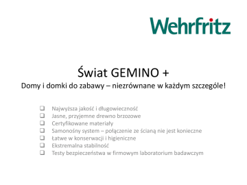 Świat GEMINO + Domy i domki do zabawy – niezrównane w każdym szczególe! Najwyższa jakość i długowieczność Jasne, przyjemne drewno brzozowe Certyfikowane materiały Samonośny system – połączenie ze ścianą nie jest konieczne Łatwe w konserwacji i higieniczne Ekstremalna stabilność Testy bezpieczeństwa w firmowym laboratorium badawczym www.wehrfritz.pl 0 800 200 221