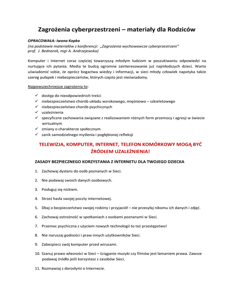 Zagrożenia cyberprzestrzeni – materiały dla Rodziców OPRACOWAŁA: Iwona Kopka (na podstawie materiałów z konferencji: „Zagrożenia wychowawcze cyberprzestrzeni” prof. J. Bednarek, mgr A. Andrzejewska) Komputer i Internet coraz częściej towarzyszą młodym ludziom w poszukiwaniu odpowiedzi na nurtujące ich pytania. Media te budzą ogromne zainteresowanie już najmłodszych dzieci. Warto uświadomid sobie, że oprócz bogactwa wiedzy i informacji, w sieci młody człowiek napotyka także szereg pułapek i niebezpieczeostw, których często jest nieświadomy. Najpowszechniejsze zagrożenia to: dostęp do nieodpowiednich treści niebezpieczeostwo chorób układu wzrokowego, mięśniowo – szkieletowego niebezpieczeostwo chorób psychicznych uzależnienia specyficzne zachowania związane z realizowaniem różnych form przemocy i agresji w świecie wirtualnym zmiany o charakterze społecznym zanik samodzielnego myślenia i pogłębionej refleksji TELEWIZJA, KOMPUTER, INTERNET, TELEFON KOMÓRKOWY MOGĄ BYD ŹRÓDŁEM UZALEŻNIENIA! ZASADY BEZPIECZNEGO KORZYSTANIA Z INTERNETU DLA TWOJEGO DZIECKA 1. Zachowaj dystans do osób poznanych w Sieci. 2. Nie podawaj swoich danych osobowych. 3. Posługuj się nickiem. 4. Strzeż hasła swojej poczty internetowej. 5. Dbaj o bezpieczeostwo swojej rodziny i przyjaciół – nie przesyłaj nikomu ich danych i zdjęd. 6. Zachowaj ostrożnośd w spotkaniach z osobami poznanymi w Sieci. 7. Przemoc psychiczna z użyciem nowych technologii to też przestępstwo! 8. Nie naruszaj godności i praw innych użytkowników Sieci. 9. Zabezpiecz swój komputer przed wirusami. 10. Szanuj prawo własności w Sieci – ściąganie muzyki czy filmów jest łamaniem prawa. Zawsze podawaj źródło jeśli korzystasz z zasobów Sieci. 11. Rozmawiaj z dorosłymi o Internecie. 12. Pamiętaj, że Internet może byd źródłem groźnego uzależnienia. 13. Uzależnienie od Internetu to choroba! CYBERPRZEMOC – to prześladowanie, zastraszanie, nękanie i wyśmiewanie innych osób za pomocą technologii informacyjnych i komunikacyjnych, tj.: sms i mms e-mail witryny internetowe fora dyskusyjne blogi komunikatory typu GG czaty FORMY CYBERPRZEMOCY: nękanie, zastraszanie, szantażowanie z użyciem Sieci włamania na konta pocztowe i konta komunikatorów celu rozsyłania kompromitujących wiadomości rejestrowanie niechcianych filmów, zdjęd tworzenie ośmieszających stron www publikowanie lub rozsyłanie kompromitujących informacji, zdjęd podszywanie się w Sieci pod kogo innego wbrew jego woli JAK ROZPOZNAD, ŻE DZIECKO JEST PRZEŚLADOWANE? wydaje się poirytowane, smutne lub zdenerwowane po zakooczeniu rozmowy przez telefon lub korzystania z komputera izoluje się od lubianych znajomych i zajęd gorzej się uczy, okazuje złośd lub niezadowolenie ze szkoły lub konkretnego przedmiotu wykazuje nietypowe oznaki przygnębienia lub smutku SKUTKI CYBERPRZEMOCY spadek samooceny depresja izolacja od rówieśników lęki brak zaufania CYBERPRZEMOC, CHOD NIE MA OBJAWÓW PRZEMOCY FIZYCZNEJ, JEST RÓWNIE GRŹNYM ZJAWISKIEM I NIE MOŻNA JEJ BAGATELIZOWAD! GDZIE SZUKAD POMOCY GDY PADNIE SIĘ OFIARĄ CYBERPRZEMOCY? 0 800 100 100 www.helpline.org.pl www.dyżurnet.pl http://www.dzieckowsieci.pl/ PAMIĘTAJ! PRZEMOC STOSOWANA ZA POMOCĄ TECHNOLOGII INFORMACYJNYCH I KOMUNIKACYJNYCH TO PRZESTĘPSTWO!!! INFOHOLIZM – uzależnienie od komputera i Internetu prowadzące do utraty kontroli nad swoim zachowaniem Typy infoholizmu: 1. Uzależnienie od związków wirtualnych – nadmierny udział w listach dyskusyjnych, IRC-u, na forach. Osoba chora nawiązuje kontakty wyłącznie przez sied, ma kłopoty w kontaktach osobistych. 2. Erotomania komputerowa – oglądanie filmów i zdjęd z materiałami erotycznymi i pornograficznymi; pogawędki o tematyce seksualnej. 3. Uzależnienie od komputera – obsesyjne przebywanie przy komputerze, najczęściej przy graniu w gry komputerowe. 4. Uzależnienie od Sieci – nieustanne przeglądanie Sieci, obsesyjne granie w gry, uczestniczenie w aukcjach, itp. 5. Przeciążenie informacyjne – nałogowe surfowanie w sieci. Fazy infoholizmu: Faza początkowa: Przebywanie w sieci sprawia przyjemnośd Wzrost ochoty na częstsze przebywanie w sieci Następuje utrata poczucia czasu Faza ostrzegawcza: Szukanie okazji do jak najczęstszego przebywania w Sieci Rozładowanie napięcia poprzez sied Próby korzystania z sieci w ukryciu Korzystanie z sieci przynosi ulgę Brak chęci powrotu do rzeczywistości Faza krytyczna: Spadek innych zainteresowao Zaniedbywanie wyglądu zewnętrznego Zaniedbywanie snu Nieregularne odżywianie się Silna potrzeba przebywania w sieci Stałe myślenie o tym, co dzieje się w sieci Potrzeba zwiększenia ilości czasu spędzanego w sieci Zaniedbywanie nauki, pracy, rezygnacja ze spotkao towarzyskich Odkładanie innych czynności „na potem” Okłamywanie innych odnośnie ilości czasu spędzanego w sieci Pojawienie się konfliktów rodzinnych związanych z komputerem Następuje utrata kontroli nad własnym zachowaniem Faza przewlekła: Okresy długotrwałego przebywania w sieci Przebywanie w sieci w celu przeżywania silnych emocji Świat wirtualny staje się jedynym światem życiu Rozpad więzi rodzinnych Degradacja zawodowa i społeczna Choroby somatyczne Lęki, psychozy Sięganie po inne środki zmieniające nastrój – alkohol, leki Poczucie bezsensu życia w świecie realnym Skrajne wyczerpanie organizmu Następuje właściwe uzależnienie OBJAWY UZALEŻNIENIA 1. Potrzeba korzystania z komputera w coraz większym wymiarze czasowym. 2. Występowanie złego samopoczucia, drażliwości, pobudzenia psychoruchowego, lęku, depresji przy braku możliwości korzystania z komputera. 3. Podejmowanie nieudanych prób zaprzestania użytkowania danego medium, okłamywanie o rzeczywistym czasie poświęcanym na jego użytkowanie. 4. Doznawanie uczucia satysfakcji i poczucia własnej wartości poprzez udział w grach i sesjach internetowy