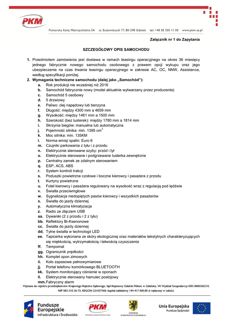 Załącznik nr 1 do Zapytania SZCZEGÓŁOWY OPIS SAMOCHODU 1. Przedmiotem zamówienia jest dostawa w ramach leasingu operacyjnego na okres 36 miesięcy jednego fabrycznie nowego samochodu osobowego z prawem opcji wykupu oraz jego ubezpieczenie na czas trwania leasingu operacyjnego w zakresie AC, OC, NNW, Assistance, według specyfikacji poniżej. 2. Wymagania techniczne samochodu (dalej jako „Samochód”): a. Rok produkcji nie wcześniej niż 2016 b. Samochód fabrycznie nowy (model aktualnie wytwarzany przez producenta) c. Samochód 5 osobowy d. 5 drzwiowy e. Paliwo: olej napędowy lub benzyna f. Długość: między 4300 mm a 4659 mm g. Wysokość: między 1461 mm a 1500 mm h. Szerokość (bez lusterek): między 1780 mm a 1814 mm i. Skrzynia biegów: manualna lub automatyczna 3 j. Pojemność silnika: min. 1395 cm k. Moc silnika: min. 135KM l. Norma emisji spalin: Euro 6 m. Czujniki parkowania z tyłu i z przodu n. Elektrycznie sterowane szyby: przód i tył o. Elektrycznie sterowane i podgrzewane lusterka zewnętrzne p. Centralny zamek ze zdalnym sterowaniem q. ESP, ACS, ABS r. System kontroli trakcji s. Poduszki powietrzne czołowe i boczne kierowcy i pasażera z przodu t. Kurtyny powietrzne u. Fotel kierowcy i pasażera regulowany na wysokość wraz z regulacją pod lędźwie v. Światła przeciwmgłowe w. Sygnalizacja niedopiętych pasów kierowcy i wszystkich pasażerów x. Światła do jazdy dziennej y. Automatyczna klimatyzacja z. Radio ze złączem USB aa. Dywaniki (2 z przodu i 2 z tyłu) bb. Reflektory Bi-Ksenonowe cc. Światła do jazdy dziennej dd. Tylne światła w technologii LED ee. Tapicerka wykonana ze skóry ekologicznej oraz materiałów tekstylnych charakteryzujących się miękkością, wytrzymałością i łatwością czyszczenia ff. Tempomat gg. Ogranicznik prędkości hh. Komplet opon zimowych ii. Koło zapasowe pełnowymiarowe jj. Portal telefonu komórkowego BLUETOOTH kk. System monitorujący ciśnienie w oponach ll. Elektrycznie sterowany hamulec postojowy mm. Fabryczny alarm nn. System Webasto lub analogiczny oo. Kolor nadwozia: Kolor do wyboru przez Zamawiającego z dostępnej palety kolorów danego modelu, 3. Pozostałe wymagania dotyczące Samochodu a. Zamawiający wymaga aby autoryzowany serwis producenta zaoferowanej przez Wykonawcę marki Samochodu znajdował się w odległości do 90 km od siedziby Zamawiającego. b. Wykonawca zobowiązany będzie dołączyć do Samochodu komplet dokumentów: kopię karty pojazdu, kartę gwarancyjną, książkę przeglądów serwisowych, instrukcję obsługi w języku polskim oraz inne wymagane prawem dokumenty pojazdu (kserokopię wyciągu ze świadectwa homologacji pojazdu sporządzony w języku polskim, dokument potwierdzający spełnienie normy CEE EURO 6, dowód rejestracyjny, polisę ubezpieczeniową potwierdzającą ubezpieczenie. c. Wykonawca jest zobowiązany dla dostarczonego Samochodu zapewnić pakiet ubezpieczeniowy obejmujący, co najmniej poniższy zakres: i. Odpowiedzialność Cywilna, ii. Auto Casco/KR, w tym: suma ubezpieczenia powinna odpowiadać wartości pojazdu w dniu zawarcia umowy ubezpieczenia; system rozliczania szkód do AC serwisowy (naprawa bezgotówkowa w ASO); zniesiona amortyzacja części do wymiany brak udziału własnego; utrzymanie wartości pojazdu przez okres 12 m-cy; zniesienie konsumpcji sum ubezpieczenia. iii. Następstwa Nieszczęśliwych Wypadków – ubezpieczenie NNW powinno obejmować kierującego i pasażerów z sumą ubezpieczenia nie mniejszą niż 10 000 zł na każdą osobę. iv. Assistance - ubezpieczenie powinno gwarantować kierowcom i pasażerom pojazdów: pomoc w trudnych sytuacjach, takich jak wypadek, awaria, unieruchomienie oraz kradzież pojazdu, a także w przypadkach nagłego zachorowania kierowcy oraz urazu ciała kierowcy lub pasażera, pomoc techniczną, medyczną, organizacyjną i informacyjną, udzielaną na terenie całej Polski, bezpłatne holowanie z miejsca wypadku dla poszkodowanego oraz dla sprawcy wypadku lub kolizji, pełen zakres bezpłatnych usług pomocy drogowej, pojazd zastępczy v. GAP - ubezpieczenie straty finansowej polegającej na całkowitym zniszczeniu bądź utracie pojazdu. vi. Samochód winien być ubezpieczony przez cały okres trwania umowy. Wykonawca odpowiada za zapewnienie ciągłości ubezpieczenia. d. Wynagrodzenie z tytułu leasingu Samochodu, będzie – poza kosztami bieżącej eksploatacji, tj. kosztami paliwa oraz uzupełnienia płynów do spryskiwaczy - jedynym kosztem obciążającym Zamawiającego. W szczególności, Wykonawcę obciążać będą koszty rejestracji Samochodu, przygotowania do wydania, dostawy, ubezpieczenia Samochodu, napraw, przeglądów i serwisowania. 4. Parametry leasingu operacyjnego: a. Waluta leasingu w PLN, b. Okres leasingu 36 miesięcy, c. Pierwsza wpłata do 10% wartości netto przedmiotu leasingu + podatek VAT, d. Raty leasingowe równe, e. Kwota wykupu 1% wartości netto przedmiotu leasingu + podatek VAT (po wpłacie której prawo własności przedmiotu leasingu przechodzi na Zamawiającego), f. Zamawiający wymaga, aby płatność z tytułu ubezpieczenia była wliczona w miesięczne raty leasingowe; g. Raty leasingowe zawierają w sobie wszelkie składniki cenotwórcze, w tym: podatki, opłaty leasingowe, koszt ubezpieczenia pojazdu, koszt rejestracji pojazdu, koszty uboczne powstałe przed przekazaniem przedmiotu leasingu. Poza ratami, Zamawiający nie poniesie żadnych dodatkowych kosztów; h. Maksymalny roczny przebieg Samochodu: 33 000 km.