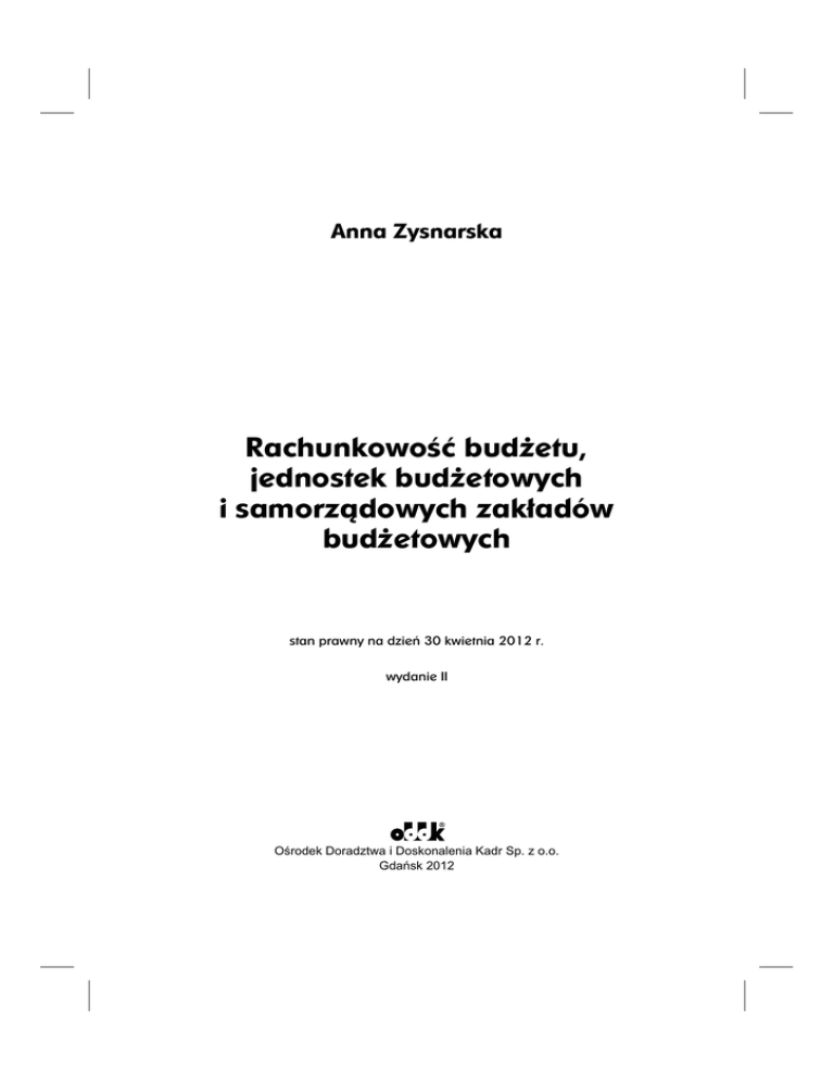 Anna Zysnarska Rachunkowość budżetu, jednostek budżetowych i samorządowych zakładów budżetowych stan prawny na dzień 30 kwietnia 2012 r. wydanie II Oœrodek Doradztwa i Doskonalenia Kadr Sp. z o.o. Gdañsk 2012 Spis treści Wstęp . . . . . . . . . . . . . . . . . . . . . . . . . . . . . . . . . . . . . . . . . . . . . . . 7 Część pierwsza Ogólna charakterystyka sektora finansów publicznych, rachunkowość wykonywania budżetu, jednostek budżetowych i samorządowych zakładów budżetowych oraz rachunki bankowe jednostek I. Zasady gospodarki finansowej wynikające z ustawy o finansach publicznych. 1. Charakterystyka sektora finansów publicznych i sektora budżetowego państwa . . . . . . . . . . . . . . . . . . . . . . . . . . . . . . . . . . . . . . 1.1. Jednostki budżetowe i zasady ich finansowania . . . . . . . . . . . . . 1.2. Samorządowe zakłady budżetowe . . . . . . . . . . . . . . . . . . . . 2. Zadania sektora publicznego . . . . . . . . . . . . . . . . . . . . . . . . . . 2.1. Zadania gmin . . . . . . . . . . . . . . . . . . . . . . . . . . . . . . . . 2.2. Zadania powiatów . . . . . . . . . . . . . . . . . . . . . . . . . . . . . 2.3. Zadania samorządów województw . . . . . . . . . . . . . . . . . . . . 3. Definicja budżetu państwa i budżetu jednostki samorządu terytorialnego 3.1. Dochody i wydatki budżetu państwa . . . . . . . . . . . . . . . . . . . 3.2. Przychody i rozchody budżetu państwa . . . . . . . . . . . . . . . . . 4. Budżet środków europejskich. . . . . . . . . . . . . . . . . . . . . . . . . . 5. Budżet jednostki samorządu terytorialnego . . . . . . . . . . . . . . . . . . 6. Dysponenci środków budżetowych . . . . . . . . . . . . . . . . . . . . . . 6.1. Układy wykonawcze budżetu . . . . . . . . . . . . . . . . . . . . . . . 6.2. Klasyfikacja budżetowa . . . . . . . . . . . . . . . . . . . . . . . . . . 6.2.1. Klasyfikacja według części budżetu państwa. . . . . . . . . . . 6.2.2. Klasyfikacja według działów . . . . . . . . . . . . . . . . . . . 6.2.3. Klasyfikacja według rozdziałów . . . . . . . . . . . . . . . . . . 6.2.4. Klasyfikacja według paragrafów . . . . . . . . . . . . . . . . . . 6.3. Klasyfikacja według wydatków strukturalnych . . . . . . . . . . . . . 7. Rachunkowość sektora budżetowego . . . . . . . . . . . . . . . . . . . . . II. Gromadzenie i wydatkowanie środków pieniężnych w organie finansowym. 1. Ogólna charakterystyka miejsc i kierunków przepływów w budżecie państwa . . . . . . . . . . . . . . . . . . . . . . . . . . . . . . . . . . . . . . 2. Ogólne zasady wykonywania budżetu państwa. . . . . . . . . . . . . . . . 3. Rachunki bankowe budżetu państwa . . . . . . . . . . . . . . . . . . . . . 4. Wykonywanie budżetu jednostki samorządu terytorialnego . . . . . . . . 4.1. Ogólne zasady wykonywania budżetu JST . . . . . . . . . . . . . . . 5. Szczególne zasady rachunkowości wykonywania budżetu państwa – okres przejściowy oraz księga główna budżetu państwa. . . . . . . . . . 6. Szczególne zasady rachunkowości i księga główna budżetu JST . . . . . . 7. Zobowiązania finansowe jednostek samorządu terytorialnego . . . . . . . 7.1. Zasady zaciągania zobowiązań przez JST . . . . . . . . . . . . . . . . 3 . . 11 . . . . . . . . . . . . . . . . . . . . . . . . . . . . . . . . . . . . . . . . . . . . 11 20 27 31 31 32 33 34 36 40 41 45 53 53 54 56 59 61 61 63 70 73 . . . . . . . . . . 73 76 81 85 85 . . . . . 91 101 116 116 Spis treœci III. Dochody, wydatki i środki pieniężne jednostek budżetowych oraz środki pieniężne samorządowych zakładów budżetowych . . . . . . . . . . . . . . 1. Ogólna charakterystyka szczególnych zasad rachunkowości jednostek budżetowych i samorządowych zakładów budżetowych. . . . . . . . . . 2. Rachunki bieżące jednostek budżetowych . . . . . . . . . . . . . . . . . . 2.1. Ewidencja dochodów budżetowych w jednostkach budżetowych. . 2.2. Ewidencja wydatków budżetowych w jednostkach budżetowych. . 3. Rachunki bieżące samorządowych zakładów budżetowych . . . . . . . . 4. Pomocnicze rachunki bankowe . . . . . . . . . . . . . . . . . . . . . . . . 4.1. Pomocnicze rachunki bankowe według „rozporządzenia” – zasady ogólne . . . . . . . . . . . . . . . . . . . . . . . . . . . . . . 4.2. Pomocnicze rachunki bankowe dla obsługi budżetu państwa w zakresie krajowych środków finansowych. . . . . . . . . . . . . . 5. Rachunki „dochodów własnych” jednostek budżetowych . . . . . . . . . 5.1. Rachunki „dochodów własnych” państwowych jednostek budżetowych . . . . . . . . . . . . . . . . . . . . . . . . . . . . . . . 5.2. Rachunki „dochodów własnych” samorządowych jednostek budżetowych . . . . . . . . . . . . . . . . . . . . . . . . . . . . . . . 6. Rachunki środków funduszy specjalnego przeznaczenia. . . . . . . . . . 7. Rachunek państwowych funduszy celowych . . . . . . . . . . . . . . . . 8. Rachunki środków europejskich . . . . . . . . . . . . . . . . . . . . . . . 8.1. Rachunek środków pochodzących ze źródeł zagranicznych niepodlegających zwrotowi . . . . . . . . . . . . . . . . . . . . . . . 8.2. Rachunek środków europejskich . . . . . . . . . . . . . . . . . . . . 9. Krótkoterminowe aktywa finansowe . . . . . . . . . . . . . . . . . . . . . 10. Rozliczenia gotówkowe . . . . . . . . . . . . . . . . . . . . . . . . . . . . 11. Zaangażowanie . . . . . . . . . . . . . . . . . . . . . . . . . . . . . . . . . 11.1. Ewidencja zaangażowania środków na wydatki budżetowe . . . . . 11.2. Ewidencja zaangażowania planu finansowego samorządowego zakładu budżetowego . . . . . . . . . . . . . . . . . . . . . . . . . . 11.3. Ewidencja zaangażowania wydatków środków europejskich . . . . IV. Sprawozdawczość . . . . . . . . . . . . . . . . . . . . . . . . . . . . . . . . . . 1. Sprawozdawczość budżetowa . . . . . . . . . . . . . . . . . . . . . . . . . 2. Sprawozd