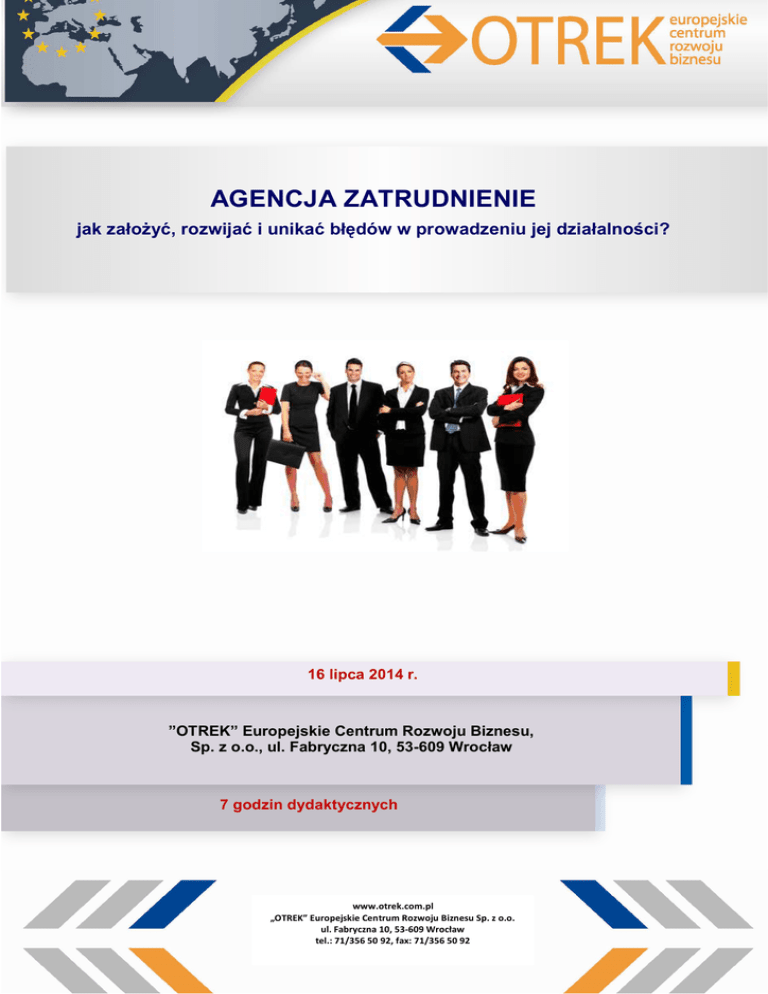 AGENCJA ZATRUDNIENIE jak założyć, rozwijać i unikać błędów w prowadzeniu jej działalności? 16 lipca 2014 r. ”OTREK” Europejskie Centrum Rozwoju Biznesu, Sp. z o.o., ul. Fabryczna 10, 53-609 Wrocław 7 godzin dydaktycznych www.otrek.com.pl „OTREK” Europejskie Centrum Rozwoju Biznesu Sp. z o.o. ul. Fabryczna 10, 53-609 Wrocław tel.: 71/356 50 92, fax: 71/356 50 92 Cel szkolenia: Przekazanie informacji i wyjaśnienie zagadnień związanych z założeniem i prowadzeniem Agencji Zatrudnienia oraz unikania błędów w jej działalności. Wykładowca: Daniel Pałyga – trener „OTREK”, pracownik Państwowej Inspekcji Pracy w Opolu, absolwent Uniwersytetu Ekonomicznego we Wrocławiu, oraz Uniwersytetu Opolskiego. Zajmuje się m.in. zagadnieniami związanymi z prawną ochroną pracy, bezpieczeństwem i higieną pracy, czasem pracy i odpoczynku kierowców. Prowadzi szkolenia z zakresu prawa pracy, czasu pracy, czasu pracy kierowców oraz mobbingu. Miejsce i czas szkolenia: Sala szkoleniowa „OTREK” Europejskie Centrum Rozwoju Biznesu Sp. z o.o., ul. Fabryczna 10, 53-609 Wrocław, w godzinach 9:00 – 15:15 Program ramowy: Zgłoszenia: I. Podstawy funkcjonowania Agencji Zatrudnienia. Zgłoszenie udziału w szkoleniu należy przesłać faksem na nr 71/356 50 92, najpóźniej na 5 dni przed terminem rozpoczęcia zajęć. Formularz zgłoszenia w załączeniu lub do pobrania z naszej strony, www.otrek.com.pl Kontakt: Dodatkowych informacji Halina Skórska, Tel. 71/ 356 email: [email protected] udziela: 50 92, Cena: Opłata za szkolenie wynosi 460, 00 PLN + 23% VAT i obejmuje udział w szkoleniu, materiały dydaktyczne piśmiennicze, przerwy kawowe oraz zaświadczenie. Należność za udział w szkoleniu, prosimy przekazać przelewem, po otrzymaniu potwierdzenia o rozpoczęciu szkolenia, na konto: BZ WBK I/O Wrocław, Nr: 85 1090 2398 0000 0001 1426 1336 1. Agencja Zatrudnienia – charakterystyka, zasady działania, korzyści dla firm i pracowników. 2. Podstawy prawne działania Agencji Zatrudnienia: ustawa o promocji zatrudnienia i instytucjach rynku pracy, ustawa o zatrudnienia pracowników tymczasowych, 3. Usługi oferowane przez agencje zatrudnienia i ich charakterystyka: Agencja Zatrudnienia Pośrednictwo Pracy 4. Jak założyć agencję zatrudnienia?. wymagania ustawowe składanie wniosku o wpis do rejestru 5.Wpis do rejestru Agencji Zatrudnienia: prowadzenie rejestru, zgłaszanie zmiany w rejestrze, 6. Pozostałe obowiązki spoczywające na Agencji Zatrudnienia: brak zaległości w daninach publicznoprawnych, niekaralność za przestępstwa lub wykroczenia, II. Agencje Pracy Tymczasowej: wyjaśnienie pojęć: pracownik tymczasowy, pracodawca użytkownik, agencja pracy tymczasowej, niezbędne uzgodnienia pomiędzy pracodawcą użytkownikiem, a agencją pracy tymczasowej przed zatrudnieniem pracownika tymczasowego, zasady zatrudniania przez agencję pracy tymczasowej na podstawie umów cywilnoprawnych – zasady i obowiązki. III. Odpowiedzialność Agencji Zatrudnienia: odpowiedzialność cywilnoprawna, odpowiedzialność administracyjnoprawna. Szczegółowy program szkolenia na www.otrek.com.pl