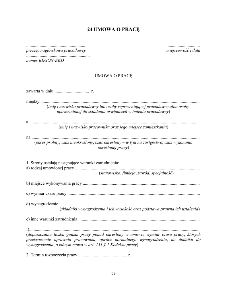 24 UMOWA O PRACĘ ..................................................... pieczęć nagłówkowa pracodawcy ......................................................... numer REGON-EKD .............................. miejscowość i data UMOWA O PRACĘ zawarta w dniu ............................... r. między ............................................................................................................................................... (imię i nazwisko pracodawcy lub osoby reprezentującej pracodawcę albo osoby upoważnionej do składania oświadczeń w imieniu pracodawcy) a ......................................................................................................................................................... (imię i nazwisko pracownika oraz jego miejsce zamieszkania) na ....................................................................................................................................................... (okres próbny, czas nieokreślony, czas określony – w tym na zastępstwo, czas wykonania określonej pracy) 1. Strony ustalają następujące warunki zatrudnienia: a) rodzaj umówionej pracy ................................................................................................................ (stanowisko, funkcja, zawód, specjalność) b) miejsce wykonywania pracy ......................................................................................................... c) wymiar czasu pracy ....................................................................................................................... d) wynagrodzenie ............................................................................................................................... (składniki wynagrodzenia i ich wysokość oraz podstawa prawna ich ustalenia) e) inne warunki zatrudnienia ............................................................................................................. f)......................................................................................................................................................... (dopuszczalna liczba godzin pracy ponad określony w umowie wymiar czasu pracy, których przekroczenie uprawnia pracownika, oprócz normalnego wynagrodzenia, do dodatku do wynagrodzenia, o którym mowa w art. 151 § 1 Kodeksu pracy) 2. Termin rozpoczęcia pracy ............................................ r. 63 ....................................................................... podpis pracownika .................................................................... podpis pracodawcy lub osoby reprezentującej pracodawcę albo osoby upoważnionej do składania oświadczeń w imieniu pracodawcy Zdroj: http://www.druki.gofin.pl/umowa-o-prace,wzor,373,54.html PREKLADOVÝ SLOVNÍČEK art. (artykuł) čl. (článok) czas nieokreślony doba neurčitá czas określony doba určitá Kodeks pracy Zákonník práce nagłówek hlavička, záhlavie, nadpis, titul okres próbny skúšobná lehota (doba) podstawa prawna právny základ pracodawca zamestnávateľ REGON-EKD (Rejestr Gospodarki Narodowej-Europejska Klasyfikacja Działalności) IČO-NACE (identifikačné číslo organizácieeurópska klasifikácia ekonomických činností) składać oświadczenie predkladať vyhlásenie, vyhlasovať składnik súčasť, komponent, zložka specjalność špecializácia stanowisko pozícia umowa «pisemne lub ustne porozumienie stron, mające na celu ustalenie wzajemnych praw i obowiązków; też: dokument, w którym są określone te prawa» zmluva «dohodnutie sa (obyčajne písomné) niekoľkých ľudí alebo strán na nejakej veci, dohoda» umowa o pracę pracovná zmluva upoważniony oprávnený ustalenie stanovenie, určenie warunek podmienka wymiar czasu pracy dĺžka pracovnej doby wynagrodzenie mzda, plat, odmena zastępstwo zastupovanie 64 zatrudnienie zamestnanie zawarty uzavretý zawód profesia 65