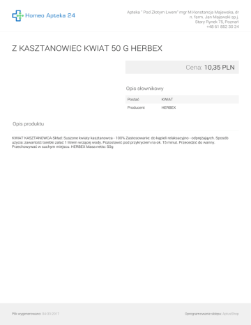 Apteka " Pod Złotym Lwem" mgr M.Konstancja Majewska, dr n. farm. Jan Majewski sp.j. Stary Rynek 75, Poznań +48 61 852 30 24 Z KASZTANOWIEC KWIAT 50 G HERBEX Cena: 10,35 PLN Opis słownikowy Postać KWIAT Producent HERBEX Opis produktu KWIAT KASZTANOWCA Skład: Suszone kwiaty kasztanowca - 100% Zastosowanie: do kąpieli relaksacyjno - odprężająych. Sposób użycia: zawartość torebki zalać 1 litrem wrzącej wody. Pozostawić pod przykryciem na ok. 15 minut. Przecedzić do wanny. Przechowywać w suchym miejscu. HERBEX Masa netto: 50g Plik wygenerowano: 04-03-2017 Powered by TCPDF (www.tcpdf.org) Oprogramowanie sklepu: AptusShop