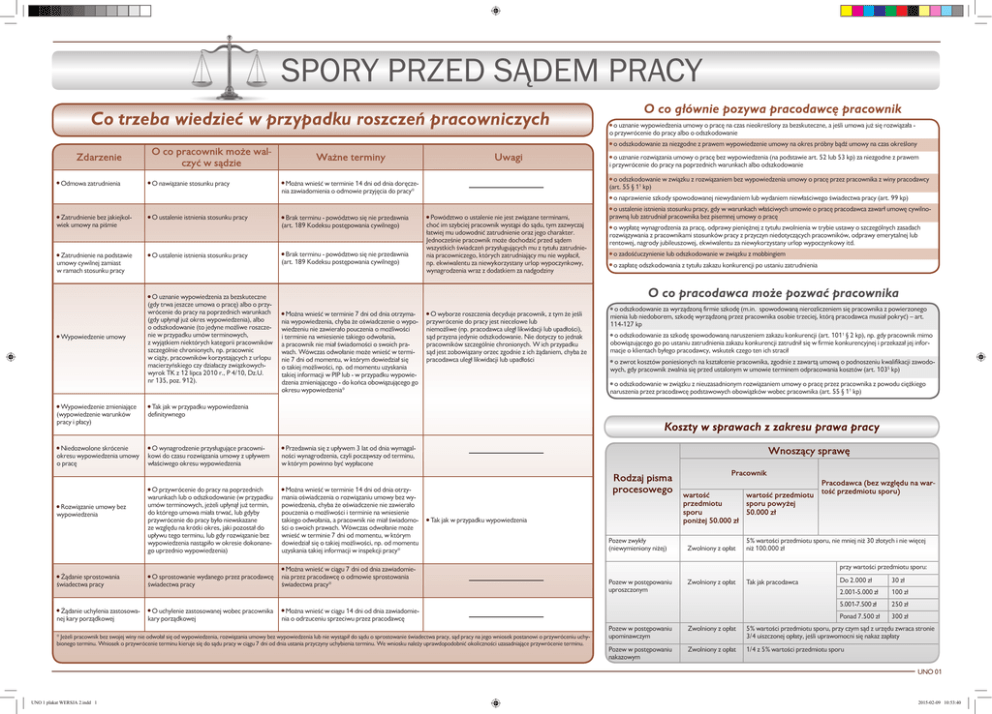 SPORY PRZED SĄDEM PRACY Co trzeba wiedzieć w przypadku roszczeń pracowniczych n Odmowa zatrudnienia n O nawiązanie stosunku pracy o uznanie wypowiedzenia umowy o pracę na czas nieokreślony za bezskuteczne, a jeśli umowa już się rozwiązała ‑ o przywrócenie do pracy albo o odszkodowanie n o odszkodowanie za niezgodne z prawem wypowiedzenie umowy na okres próbny bądź umowy na czas określony n O co pracownik może walczyć w sądzie Zdarzenie O co głównie pozywa pracodawcę pracownik Ważne terminy Uwagi o uznanie rozwiązania umowy o pracę bez wypowiedzenia (na podstawie art. 52 lub 53 kp) za niezgodne z prawem i przywrócenie do pracy na poprzednich warunkach albo odszkodowanie n o odszkodowanie w związku z rozwiązaniem bez wypowiedzenia umowy o pracę przez pracownika z winy pracodawcy (art. 55 § 11 kp) n Można wnieść w terminie 14 dni od dnia doręcze‑ nia zawiadomienia o odmowie przyjęcia do pracy* n o naprawienie szkody spowodowanej niewydaniem lub wydaniem niewłaściwego świadectwa pracy (art. 99 kp) n o ustalenie istnienia stosunku pracy, gdy w warunkach właściwych umowie o pracę pracodawca zawarł umowę cywilno‑ prawną lub zatrudniał pracownika bez pisemnej umowy o pracę n Zatrudnienie bez jakiejkol‑ wiek umowy na piśmie n Zatrudnienie na podstawie umowy cywilnej zamiast w ramach stosunku pracy n n n O ustalenie istnienia stosunku pracy O ustalenie istnienia stosunku pracy O uznanie wypowiedzenia za bezskuteczne (gdy trwa jeszcze umowa o pracę) albo o przy‑ wrócenie do pracy na poprzednich warunkach (gdy upłynął już okres wypowiedzenia), albo o odszkodowanie (to jedyne możliwe roszcze‑ nie w przypadku umów terminowych, z wyjątkiem niektórych kategorii pracowników szczególnie chronionych, np. pracownic w ciąży, pracowników korzystających z urlopu macierzyńskiego czy działaczy związkowych wyrok TK z 12 lipca 2010 r., P 4/10, Dz.U. nr 135, poz. 912). Brak terminu ‑ powództwo się nie przedawnia (art. 189 Kodeksu postępowania cywilnego) n Brak terminu ‑ powództwo się nie przedawnia (art. 189 Kodeksu postępowania cywilnego) n Powództwo o ustalenie nie jest związane terminami, choć im szybciej pracownik wystąpi do sądu, tym zazwyczaj łatwiej mu udowodnić zatrudnienie oraz jego charakter. Jednocześnie pracownik może dochodzić przed sądem wszystkich świadczeń przysługujących mu z tytułu zatrudnie‑ nia pracowniczego, których zatrudniający mu nie wypłacił, np. ekwiwalentu za niewykorzystany urlop wypoczynkowy, wynagrodzenia wraz z dodatkiem za nadgodziny n n o wypłatę wynagrodzenia za pracę, odprawy pieniężnej z tytułu zwolnienia w trybie ustawy o szczególnych zasadach rozwiązywania z pracownikami stosunków pracy z przyczyn niedotyczących pracowników, odprawy emerytalnej lub rentowej, nagrody jubileuszowej, ekwiwalentu za niewykorzystany urlop wypoczynkowy itd. n o zadośćuczynienie lub odszkodowanie w związku z mobbingiem n o zapłatę odszkodowania z tytułu zakazu konkurencji po ustaniu zatrudnienia O co pracodawca może pozwać pracownika n n Wypowiedzenie umowy Wypowiedzenie zmieniające (wypowiedzenie warunków pracy i płacy) n Niedozwolone skrócenie okresu wypowiedzenia umowy o pracę n Rozwiązanie umowy bez wypowiedzenia Żądanie sprostowania świadectwa pracy n Żądanie uchylenia zastosowa‑ nej kary porządkowej n O wyborze roszczenia decyduje pracownik, z tym że jeśli przywrócenie do pracy jest niecelowe lub niemożliwe (np. pracodawca uległ likwidacji lub upadłości), sąd przyzna jedynie odszkodowanie. Nie dotyczy to jednak pracowników szczególnie chronionych. W ich przypadku sąd jest zobowiązany orzec zgodnie z ich żądaniem, chyba że pracodawca uległ likwidacji lub upadłości n o odszkodowanie za wyrządzoną firmie szkodę (m.in. spowodowaną nierozliczeniem się pracownika z powierzonego mienia lub niedoborem, szkodę wyrządzoną przez pracownika osobie trzeciej, którą pracodawca musiał pokryć) — art. 114‑127 kp n o odszkodowanie za szkodę spowodowaną naruszeniem zakazu konkurencji (art. 1011 § 2 kp), np. gdy pracownik mimo obowiązującego go po ustaniu zatrudnienia zakazu konkurencji zatrudnił się w firmie konkurencyjnej i przekazał jej infor‑ macje o klientach byłego pracodawcy, wskutek czego ten ich stracił n n o zwrot kosztów poniesionych na kształcenie pracownika, zgodnie z zawartą umową o podnoszeniu kwalifikacji zawodo‑ wych, gdy pracownik zwalnia się przed ustalonym w umowie terminem odpracowania kosztów (art. 1035 kp) n o odszkodowanie w związku z nieuzasadnionym rozwiązaniem umowy o pracę przez pracownika z powodu ciężkiego naruszenia przez pracodawcę podstawowych obowiązków wobec pracownika (art. 55 § 11 kp) Tak jak w przypadku wypowiedzenia definitywnego n Koszty w sprawach z zakresu prawa pracy n O wynagrodzenie przysługujące pracowni‑ kowi do czasu rozwiązania umowy z upływem właściwego okresu wypowiedzenia O przywrócenie do pracy na poprzednich warunkach lub o odszkodowanie (w przypadku umów terminowych, jeżeli upłynął już termin, do którego umowa miała trwać, lub gdyby przywrócenie do pracy było niewskazane ze względu na krótki okres, jaki pozostał do upływu tego terminu, lub gdy rozwiązanie bez wypowiedzenia nastąpiło w okresie dokonane‑ go uprzednio wypowiedzenia) n n Można wnieść w terminie 7 dni od dnia otrzyma‑ nia wypowiedzenia, chyba że oświadczenie o wypo‑ wiedzeniu nie zawierało pouczenia o możliwości i terminie na wniesienie takiego odwołania, a pracownik nie miał świadomości o swoich pra‑ wach. Wówczas odwołanie może wnieść w termi‑ nie 7 dni od momentu, w którym dowiedział się o takiej możliwości, np. od momentu uzyskania takiej informacji w PIP lub ‑ w przypadku wypowie‑ dzenia zmieniającego ‑ do końca obowiązującego go okresu wypowiedzenia* n Przedawnia się z upływem 3 lat od dnia wymagal‑ ności wynagrodzenia,