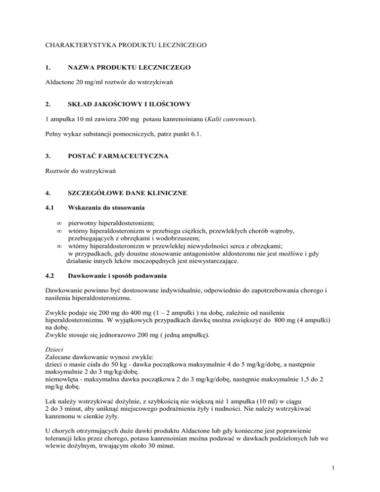 CHARAKTERYSTYKA PRODUKTU LECZNICZEGO 1. NAZWA PRODUKTU LECZNICZEGO Aldactone 20 mg/ml roztwór do wstrzykiwań 2. SKŁAD JAKOŚCIOWY I ILOŚCIOWY 1 ampułka 10 ml zawiera 200 mg potasu kanrenoinianu (Kalii canrenoas). Pełny wykaz substancji pomocniczych, patrz punkt 6.1. 3. POSTAĆ FARMACEUTYCZNA Roztwór do wstrzykiwań 4. SZCZEGÓŁOWE DANE KLINICZNE 4.1 Wskazania do stosowania • • pierwotny hiperaldosteronizm; wtórny hiperaldosteronizm w przebiegu ciężkich, przewlekłych chorób wątroby, przebiegających z obrzękami i wodobrzuszem; • wtórny hiperaldosteronizm w przewlekłej niewydolności serca z obrzękami; w przypadkach, gdy doustne stosowanie antagonistów aldosteronu nie jest możliwe i gdy działanie innych leków moczopędnych jest niewystarczające. 4.2 Dawkowanie i sposób podawania Dawkowanie powinno być dostosowane indywidualnie, odpowiednio do zapotrzebowania chorego i nasilenia hiperaldosteronizmu. Zwykle podaje się 200 mg do 400 mg (1 – 2 ampułki ) na dobę, zależnie od nasilenia hiperaldosteronizmu. W wyjątkowych przypadkach dawkę można zwiększyć do 800 mg (4 ampułki) na dobę. Zwykle stosuje się jednorazowo 200 mg ( jedną ampułkę). Dzieci Zalecane dawkowanie wynosi zwykle: dzieci o masie ciała do 50 kg - dawka początkowa maksymalnie 4 do 5 mg/kg/dobę, a następnie maksymalnie 2 do 3 mg/kg/dobę. niemowlęta - maksymalna dawka początkowa 2 do 3 mg/kg/dobę, następnie maksymalnie 1,5 do 2 mg/kg dobę. Lek należy wstrzykiwać dożylnie, z szybkością nie większą niż 1 ampułka (10 ml) w ciągu 2 do 3 minut, aby uniknąć miejscowego podrażnienia żyły i nudności. Nie należy wstrzykiwać kanrenonu w cienkie żyły. U chorych otrzymujących duże dawki produktu Aldactone lub gdy konieczne jest poprawienie tolerancji leku przez chorego, potasu kanrenoinian można podawać w dawkach podzielonych lub we wlewie dożylnym, trwającym około 30 minut. 1 Ampułkę należy otwierać bezpośrednio przed wstrzyknięciem. Dłuższe przetrzymywanie otwartej ampułki może prowadzić do zmętnienia roztworu. Lekkie opalizowanie roztworu nie ma wpływu na tolerancję leku. Jeżeli w roztworze widoczne są wyraźne zmętnienia, co może w wyjątkowych przypadkach wynikać z nieprawidłowego przechowywania, roztworu nie należy podawać. Tylko roztwór klarowny, bez widocznych zanieczyszczeń może zostać użyty. Nieumyślne wstrzyknięcie produktu do tętnicy może być szkodliwe, dlatego przed rozpoczęciem podawania należy upewnić się, że igła tkwi w żyle. 4.3 − − − − − 4.4 Przeciwwskazania nadwrażliwość na substancję czynną, spironolakton lub na którąkolwiek substancję pomocniczą, występowanie hiperkaliemii lub hiponatremii, zaburzenia czynności nerek ze stężeniem kreatyniny w osoczu powyżej 1,8 – 2,0 mg/dl i klirensem kreatyniny poniżej 30 ml/min., ostra niewydolność nerek oraz anuria, ciąża i karmienie piersią. Specjalne ostrzeżenia i środki ostrożności dotyczące stosowania Równowaga wodno-elektrolitowa powinna być regularnie monitorowana, szczególnie u osób w podeszłym wieku z zaburzeniami czynności nerek i wątroby. Hiperkaliemia może występować u pacjentów z zaburzeniami czynności nerek lub po przyjęciu nadmiernej ilości potasu i może powodować zaburzenia rytmu, co może prowadzić do śmierci. W przypadku wystąpienia hiperkaliemii leczenie produktem Aldactone powinno zostać przerwane i należy podjąć aktywne działania w celu zmniejszenia stężenia potasu do wartości normalnej (Patrz punkt 4.3.) Może wystapić hiponatremia, szczególnie jeśli Aldactone podawany jest w skojarzeniu z innymi lekami moczopędnymi. Odwracalna hiperchloremiczna kwasica metaboliczna, zwykle w połączeniu z hiperkaliemią wystąpiła u kilku pacjentów ze zdekompensowaną marskością wątroby nawet jeśli czynność nerek była prawidłowa. Odwracalne zwiększenie stężenia mocznika we krwi wystąpiło podczas terapii produktem Aldactone, głównie u pacjentów z zaburzeniami czynności nerek. Należy zachować ostrożność stosując lek Aldactone u pacjentów, którzy zagrożeni są kwasicą oraz u których występuje ryzyko hiperkaliemii (np. w cukrzycy). Wyniki testów radioimmunologicznych stosowanych do oznaczania stężenia digoksyny we krwi mogą być fałszywie zawyżone u pacjentów leczonych produktem Aldactone. Podejrzewa się, że przyczyną tego może być stosowanie niewystarczająco specyficznych przeciwciał. Dlatego też do wyników badań należy podchodzić krytycznie porównując je z obrazem klinicznym. Aldactone może fałszywie zawyżać wyniki oznaczania kortyzolu metodą Mattingly. W badaniach na zwierzętach stwierdzono działania rakotwórcze przy długotrwałym podawaniu, dlatego leczenie produktem Aldactone należy prowadzić tak krótko jak to możliwe oraz zawsze rozważać konieczność dalszego podawania. Lek zawiera 1,6 mmol (albo 37,1 mg) sodu na dawkę, należy wziąć pod uwagę u pacjentów z upośledzoną czynnością nerek i u pacjentów kontrolujących zawartość sodu w diecie. 2 Lek zawiera mniej niż 1 mmol (39 mg) potasu na dawkę, to znaczy lek uznaje się za „wolny od potasu” Lek może powodować ból w miejscu wstrzyknięcia. 4.5 Interakcje z innymi lekami i inne rodzaje interakcji Skojarzone podawanie produktu Aldactone i: − leków moczopędnych może nasilać ich działanie, − karbenoksolonu może osłabiać działanie karbenoksolonu, − niesteroidowych leków przeciwzapalnych może zwiększać ryzyko wystąpienia hiperkaliemii, − innych leków moczopędnych oszczędzających potas (triamteren, amilorid), suplementów potasu lub inhibitorów konwertazy angiotensyny (inhibitorów ACE) może prowadzić do groźnego dla życia zwiększenia stężenia potasu w osoczu, − inhibitorów konwertazy angiotensyny (inhibitorów ACE) może powodować zwiększenie stężenia kreatyniny w osoczu, − jednoczesne stosowanie furosemidu i inhibitor