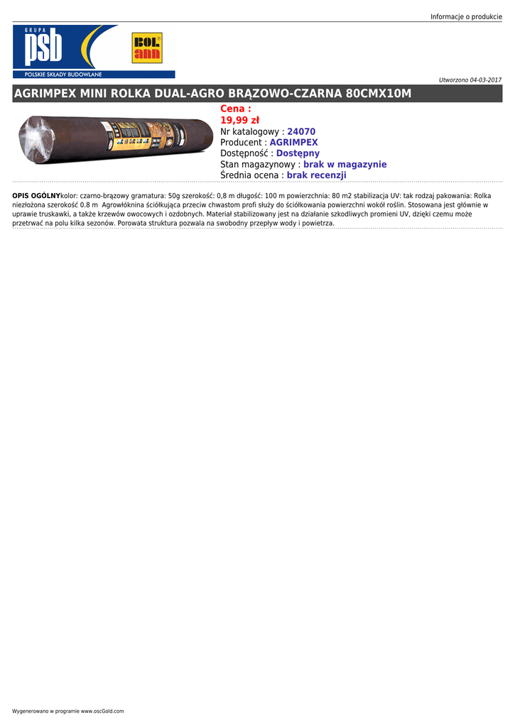 Informacje o produkcie Utworzono 04-03-2017 AGRIMPEX MINI ROLKA DUAL-AGRO BRĄZOWO-CZARNA 80CMX10M Cena : 19,99 zł Nr katalogowy : 24070 Producent : AGRIMPEX Dostępność : Dostępny Stan magazynowy : brak w magazynie Średnia ocena : brak recenzji OPIS OGÓLNYkolor: czarno-brązowy gramatura: 50g szerokość: 0,8 m długość: 100 m powierzchnia: 80 m2 stabilizacja UV: tak rodzaj pakowania: Rolka niezłożona szerokość 0.8 m Agrowłóknina ściółkująca przeciw chwastom profi służy do ściółkowania powierzchni wokół roślin. Stosowana jest głównie w uprawie truskawki, a także krzewów owocowych i ozdobnych. Materiał stabilizowany jest na działanie szkodliwych promieni UV, dzięki czemu może przetrwać na polu kilka sezonów. Porowata struktura pozwala na swobodny przepływ wody i powietrza. Wygenerowano w programie www.oscGold.com