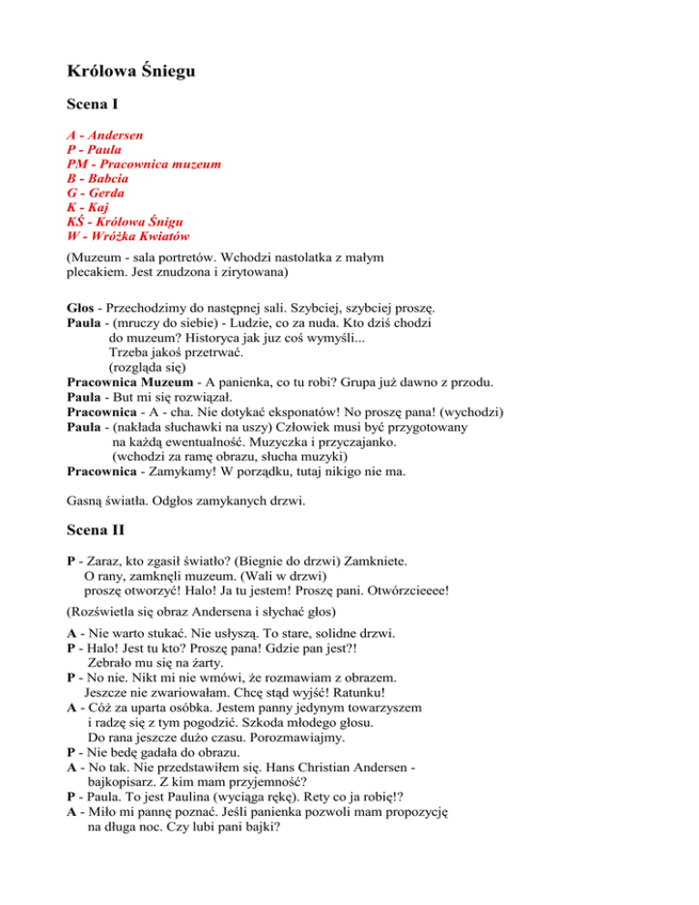 Królowa Śniegu Scena I A - Andersen P - Paula PM - Pracownica muzeum B - Babcia G - Gerda K - Kaj KŚ - Królowa Śnigu W - WróŜka Kwiatów (Muzeum - sala portretów. Wchodzi nastolatka z małym plecakiem. Jest znudzona i zirytowana) Głos - Przechodzimy do następnej sali. Szybciej, szybciej proszę. Paula - (mruczy do siebie) - Ludzie, co za nuda. Kto dziś chodzi do muzeum? Historyca jak juz coś wymyśli... Trzeba jakoś przetrwać. (rozgląda się) Pracownica Muzeum - A panienka, co tu robi? Grupa juŜ dawno z przodu. Paula - But mi się rozwiązał. Pracownica - A - cha. Nie dotykać eksponatów! No proszę pana! (wychodzi) Paula - (nakłada słuchawki na uszy) Człowiek musi być przygotowany na kaŜdą ewentualność. Muzyczka i przyczajanko. (wchodzi za ramę obrazu, słucha muzyki) Pracownica - Zamykamy! W porządku, tutaj nikigo nie ma. Gasną światła. Odgłos zamykanych drzwi. Scena II P - Zaraz, kto zgasił światło? (Biegnie do drzwi) Zamkniete. O rany, zamknęli muzeum. (Wali w drzwi) proszę otworzyć! Halo! Ja tu jestem! Proszę pani. Otwórzcieeee! (Rozświetla się obraz Andersena i słychać głos) A - Nie warto stukać. Nie usłyszą. To stare, solidne drzwi. P - Halo! Jest tu kto? Proszę pana! Gdzie pan jest?! Zebrało mu się na Ŝarty. P - No nie. Nikt mi nie wmówi, Ŝe rozmawiam z obrazem. Jeszcze nie zwariowałam. Chcę stąd wyjść! Ratunku! A - CóŜ za uparta osóbka. Jestem panny jedynym towarzyszem i radzę się z tym pogodzić. Szkoda młodego głosu. Do rana jeszcze duŜo czasu. Porozmawiajmy. P - Nie bedę gadała do obrazu. A - No tak. Nie przedstawiłem się. Hans Christian Andersen bajkopisarz. Z kim mam przyjemność? P - Paula. To jest Paulina (wyciąga rękę). Rety co ja robię!? A - Miło mi pannę poznać. Jeśli panienka pozwoli mam propozycję na długa noc. Czy lubi pani bajki? P - Co? Bajki? To dobre dla małych dzieci. Nudy. A - No cóŜ. Nigdy nie myślałem o tym w taki sposób. U nas wszyscy lubili słuchać bajek. Zbieraliśmy się wieczorem wokół lampy i babcia opowiadała nam... P - Są kreskówki w telewizji. MoŜna je oglądać po 100 razy na wideo. Mama często je puszczała, jak nie mogłam zasnąć, a ona miała duŜo pracy. ChociaŜ, zaraz... Raz gdy byłam chora zaczęla mi czytać jakąś bajkę. Zdaje mi się, Ŝe to była "Królowa Śniegu", ale nie skończyła czytać, bo zadzwonił telefon i musiała lecieć na dyŜur. To było nawet niezłe, ale nigdy nie dowiedziałam się co było dalej. A - Moja bajka! Co panna zapamiętała? P - Nie jestem Ŝadna panna, tylko zwyczajnie Paulina! Była jakaś staruszka i dwoje dzieci, zdaje się, Ŝe Kaj i Gerda. bardzo się tego no... lubili. Gdzieś tam czyhała zimna jak kawał lodu Królowa Śniegu. A - Brawo, masz talent! Lubisz teatr? P - MoŜe być. A - Usiądź i spójrz na ramę obok. Co widzisz? P - Nic, jest pusta. A - Patrz uwaŜnie. P - O rety, to chyba oni! A - Dobrze. A teraz patrz i słuchaj. Zapraszam Cię do teatru. Scena III (W domu babci. Gerda podlewa krzew róŜy, a Kaj wygląda przez okno. babcia wyszywa) K - Gerdo, popatrz jak sypie. Jutro będzie duŜo śniegu. Pójdziemy na sanki. Dobrze? G - Pójdziemy. Babciu, popatrz twoje ukochane róŜe gubią płatki. B - To nic, wiosną zakwitną na nowo. K - Jakie piękne te śnieŜynki, jak wirują! B - To roje białych pszczół. K - Czy mają takŜe swoją królową? B - Naturalnie, Ŝe mają. MoŜna ją spotkać tam, gdzie się najczęściej roją. Jest piękna i zimna. Nigdy nie odpoczywa na ziemi. G - Babciu, opowiadaj, opowiadaj dalej o Królowie Śniegu. B - Czasami w zimowe noce przelatuje przez miasta i wsie i zagląda do wszystkich okien. Wtedy okna zamarzają tak dziwnie, jakby się pokrywały kwiatami. G i K - Tak, tośmy widzieli. G - Czy Królowa Śniegu moŜe tutaj przyjść? K - Niech tylko spróbuje! Wtedy posadzę ją na piecu i roztopi się! B - Och, Kaj! Obyś jej nigdy nie spotkał. Ma serce z lodu. Jest władcza i silna. Zawsze dostaje to, czego pragnie. K - (otwiera okno) Nie boję się jej! Hej, czy jest tam Królowa Śniegu?! G - Kaj, zamknij okno! Szybko! KŚ - Zuchwały chłopcze! Będziesz naleŜał do mnie i tylko do mnie. K - Gerdo, Gerdo! Chodź tutaj! G - Co Ci sie stało. Kaj, co sie stało? K- Coś mi wpadło do oka. O, a teraz ukłuło mnie tutaj. G - Nic nie widać. K - JuŜ wszystko dobrze. Odejdź! (Odpycha ją) G - Poczytam ci, dobrze? K - Nudna jesteś. G - Kaj, coś ty? K - Nie chce się z tobą bawić. Idź sobie! G - Kaj, ja... K - Wynoś się!Jesteś brzydka gdy płaczesz. Przestań się mazać. No idź juŜ! B - Kaj, co się z tobą dzieje? K - Dajcie mi spokój! G - Babciu... (płacze i przytula się) B - MoŜe źle się czuje. Jutro będzie lepiej. Nie płacz Gerdo. Scena III (W domu babci. Gerda podlewa krzew róŜy, a Kaj wygląda przez okno. Babcia wyszywa) K - Gerdo, popatrz jak sypie. Jutro będzie duŜo śniegu. Pójdziemy na sanki. Dobrze? G - Pójdziemy. Babciu, popatrz twoje ukochane róŜe gubią płatki. B - To nic, wiosną zakwitną na nowo. K - Jakie piękne te śnieŜynki, jak wirują! B - To roje białych pszczół. K - Czy mają takŜe swoją królową? B - Naturalnie, Ŝe mają. MoŜna ją spotkać tam, gdzie się najczęściej roją. Jest piękna i zimna. Nigdy nie odpoczywa na ziemi. G - Babciu, opowiadaj, opowiadaj dalej o Królowie Śniegu. B - Czasami w zimowe noce przelatuje przez miasta i wsie i zagląda do wszystkich okien. Wtedy okna zamarzają tak dziwnie, jakby się pokrywały kwiatami. G i K - Tak, tośmy widzieli. G - Czy Królowa Śniegu moŜe tutaj przyjść? K - Niech tylko spróbuje! Wtedy posadzę ją na piecu i roztopi się! B - Och, Kaj! Obyś jej nigdy nie spotkał. Ma serce z lodu. Jest władcza i silna. Zawsze dostaje to, czego pragnie. K - (otwiera okno) Nie boję się jej! Hej, czy jest tam Królowa Śniegu?! G - Kaj, zamknij okno! Szybko! KŚ - Zuchwały chłopcze! Będziesz naleŜał do mnie i tylko do mnie. K - Gerd