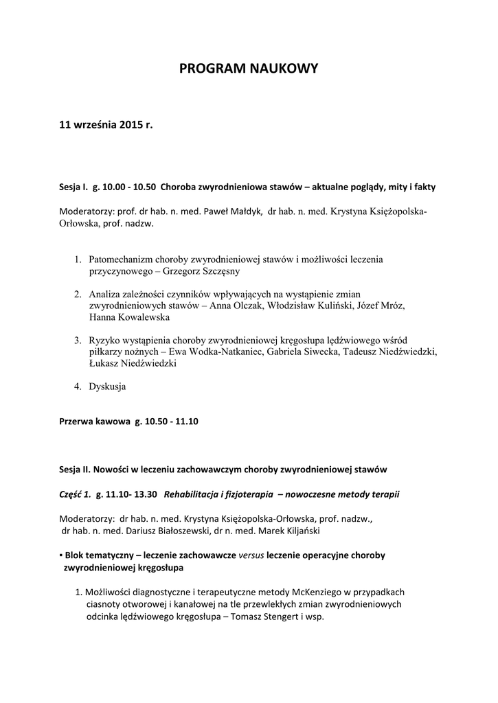 PROGRAM NAUKOWY 11 września 2015 r. Sesja I. g. 10.00 - 10.50 Choroba zwyrodnieniowa stawów – aktualne poglądy, mity i fakty Moderatorzy: prof. dr hab. n. med. Paweł Małdyk, dr hab. n. med. Krystyna KsiężopolskaOrłowska, prof. nadzw. 1. Patomechanizm choroby zwyrodnieniowej stawów i możliwości leczenia przyczynowego – Grzegorz Szczęsny 2. Analiza zależności czynników wpływających na wystąpienie zmian zwyrodnieniowych stawów – Anna Olczak, Włodzisław Kuliński, Józef Mróz, Hanna Kowalewska 3. Ryzyko wystąpienia choroby zwyrodnieniowej kręgosłupa lędźwiowego wśród piłkarzy nożnych – Ewa Wodka-Natkaniec, Gabriela Siwecka, Tadeusz Niedźwiedzki, Łukasz Niedźwiedzki 4. Dyskusja Przerwa kawowa g. 10.50 - 11.10 Sesja II. Nowości w leczeniu zachowawczym choroby zwyrodnieniowej stawów Część 1. g. 11.10- 13.30 Rehabilitacja i fizjoterapia – nowoczesne metody terapii Moderatorzy: dr hab. n. med. Krystyna Księżopolska-Orłowska, prof. nadzw., dr hab. n. med. Dariusz Białoszewski, dr n. med. Marek Kiljański ▪ Blok tematyczny – leczenie zachowawcze versus leczenie operacyjne choroby zwyrodnieniowej kręgosłupa 1. Możliwości diagnostyczne i terapeutyczne metody McKenziego w przypadkach ciasnoty otworowej i kanałowej na tle przewlekłych zmian zwyrodnieniowych odcinka lędźwiowego kręgosłupa – Tomasz Stengert i wsp. 2. Osteopatia w profilaktyce i terapii choroby zwyrodnieniowej stawów kręgosłupa Michał Dwornik, Sebastian Szajkowski, Paweł Karczewski 3. Leczenie operacyjne zespołu ciasnoty w obrębie kręgosłupa - Paweł Baranowski 4. Dyskusja - „bitwa na poglądy” – uczestniczą prezenterzy wystąpień: 1, 2 i 3 5. Ocena wyników leczenia usprawniającego po protezoplastyce stawu kolanowego na podstawie badań elektromiograficznych wybranych mięśni kończyny dolnej. Doniesienie wstępne – Ewa Wodka-Natkaniec, Tadeusz Gaździk, Łukasz Niedźwiedzki, Alicja Jurecka, Łukasz Oleksy 6. Fizjoprofilaktyka w chorobie zwyrodnieniowej stawów – Anna Olczak, Włodzisław Kuliński, Józef Mróz, Hanna Kowalewska 7. Choroba zwyrodnieniowa stawów problemem współczesnej cywilizacji – analiza postępowania fizykalnego – Włodzisław Kuliński, Józef Mróz, Anna Olczak 8. Telerehabilitacja w leczeniu choroby zwyrodnieniowej kręgosłupa – Wojciech Glinkowski i wsp. 9. Kinesiotaping w dysfunkcjach narządu ruchu powodowanych chorobą reumatyczną. Wybrane aplikacje w chorobie zwyrodnieniowej stawów – Mariusz Dowejko 10. Dyskusja Przerwa kawowa g. 13.30 - 14.00 Część 2. g. 14.00 - 17.20 Farmakoterapia, metody biologiczne, komplementarne i in. Moderatorzy: dr hab. Wiesław Tomaszewski, prof. nadzw., dr hab. n. farm. Jacek Sapa, prof. nadzw. 1. Wykorzystanie doustnych niesterydowych leków przeciwzapalnych (NLPZ) w leczeniu choroby zwyrodnieniowej stawów – Maciej Materkowski 2. Miorelaksanty – aktualna pozycja terapeutyczna – Jacek Sapa, Leszek Nowiński 3. Co oznacza kompleksowe leczenie choroby zwyrodnieniowej stawów? Nowości 2015 - Wojciech Marczyński 4. Viscosuplementacja w leczeniu choroby zwyrodnieniowej stawów – fakty i mity – Artur Biel 5. Dyskusja - „bitwa na poglądy” – uczestniczą prezenterzy wystąpień: 1,2,3 i 4 Przerwa obiadowa g. 15.45 - 16.30 6. Regulacja stanu zapalnego w ChZS na przykładzie najnowszych badań naukowych złożonego leku naturalnego – Anita Bania 7. Ocena skuteczności terapeutycznej sterydoterapii miejscowej i potencjalne objawy na skutek niewłaściwego podania preparatu – Maciej Materkowski, Wiesław Tomaszewski 8. Efekty aplikacji pochodnych kwasu hialuronowego na aktywność wolnoprzewodzących włókien nerwowych zaopatrujących staw kolanowy szczura – Matthias Pawlak, Robert F. Schmidt 9. Stada, partner w leczeniu bólu 10. Dyskusja Sesja III. g. 17.20 - 18.45 Nowości w leczeniu operacyjnym choroby zwyrodnieniowej stawów – co przed aloplastyką? Moderatorzy: prof. dr hab. n. med. Wojciech Marczyński, dr hab. n. med. Ireneusz Kotela, prof.nadzw. 1. Rola czynników wzrostu w leczeniu miejscowym elementów choroby zwyrodnieniowej stawów – doniesienie wstępne – Wojciech Marczyński, Jolanta Korsak, Iwona Jabłońska, Jerzy Białecki 2. Operacje korekcyjne osi kończyny jako zapobieganie rozwojowi choroby zwyrodnieniowej stawu kolanowego – Grzegorz Adamczyk 3. Ocena jakości życia u chorych po osteotomii okołopanewkowej miednicy – A. Czwojdziński, K. Kołodziejczyk, J. Czubak 4. Odległe wyniki leczenia chorych z dysplazją stawów biodrowych z użyciem osteotomii okołopanewkowej w aspekcie zmiany położenia środka stawu - K. Kołodziejczyk, A. Czwojdziński, J. Czubak 5. Czy jest możliwe zatrzymanie rozwoju zmian zwyrodnieniowych stawu skokowegoAndrzej Boszczyk, Stanisław Pomianowski 6. Porównanie endoprotezoplastyki i artrodezy w leczeniu zaawansowanego palucha sztywnego – Anna Skulimowska, Paweł Kołodziejski, Krzysztof Bryłka, Katarzyna Bażant 7. Dyskusja 8. Podsumowanie i zakończenie I-go dnia Kongresu.