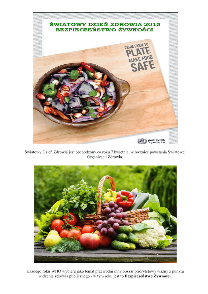 Światowy Dzień Zdrowia jest obchodzony co roku 7 kwietnia, w rocznicę powstania Światowej Organizacji Zdrowia. Każdego roku WHO wybiera jako temat przewodni inny obszar priorytetowy ważny z punktu widzenia zdrowia publicznego - w tym roku jest to Bezpieczeństwo Żywności. Światowy Dzień Zdrowia 2015 jest okazją do przypomnienia i podkreślenia roli jaką zarówno rząd jak i rolnicy, producenci czy sprzedawcy, ale także każdy z nas, jako konsument, odgrywa w zapewnieniu bezpieczeństwa tego, co trafia "z pola na nasz stół". WHO opracowała 5 kluczy do bezpiecznej żywności, czyli zestaw praktycznych zaleceń dotyczących przygotowywania i przechowywania żywności: Klucz 1: Utrzymuj czystość Klucz 2: Oddzielaj żywność surową od ugotowanej Klucz 3: Gotuj dokładnie Klucz 4: Utrzymuj żywność w odpowiedniej temperaturze Klucz 5: Używaj bezpiecznej wody i żywności Źródło: www.who.int Informacje i materiały przygotowane przez Światową Organizacje Zdrowia są dostępne na stronie WHO - linki poniżej. Pobierz pliki • Poradnik Obchodów Światowego Dnia Zdrowia 2015 http://www.who.un.org.pl/common/files_download.php?fid=91 • Bezpieczeństwo Żywności - ulotka informacyjna http://www.who.un.org.pl/common/files_download.php?fid=92 • 5 kroków do bezpiecznej żywności http://www.who.un.org.pl/common/files_download.php?fid=32 • Wytyczne dla podróżujących dotyczące bezpiecznej żywności http://www.who.un.org.pl/common/files_download.php?fid=31
