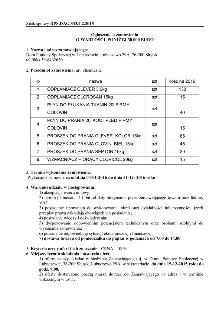 Znak sprawy DPS.DAG.333.4.2.2015 Ogłoszenie o zamówieniu O WARTOŚĆI PONIŻEJ 30 000 EURO 1. Nazwa i adres zamawiającego: Dom Pomocy Społecznej w Lubuczewie, Lubuczewo 29A, 76-200 Słupsk tel./faks 59-8462630 2. Przedmiot zamówienia: art. chemiczne lp nazwa szt. ilość na 2016 1 ODPLAMIACZ CLEVER 3,6kg szt. 130 2 ODPLAMIACZ CLOROSAN 15kg szt. 15 3 4 PŁYN DO PŁUKANIA TKANIN 20l FIRMY COLOVIN PŁYN DO PRANIA 20l KOC i PLED FIRMY COLOVIN szt. szt. 40 15 5 PROSZEK DO PRANIA CLEVER KOLOR 15kg szt. 85 6 PROSZEK DO PRANIA CLOVIN BIEL 15kg szt. 45 7 PROSZEK DO PRANIA SEPTON 15kg szt. 20 9 WZMACNIACZ PIORĄCY CLOVICOL 20kg szt. 15 3. Termin wykonania zamówienia: Wykonanie zamówienia od dnia 04-01-2016 do dnia 31-12- 2016 roku 4. Warunki udziału w postępowaniu: 1) akceptacja wzoru umowy. 2) termin płatności – 14 dni od daty otrzymania przez zamawiającego towaru oraz faktury VAT. 3) posiadanie uprawnień do wykonywania określonej działalności lub czynności, jeżeli przepisy prawa nakładają obowiązek ich posiadania; 4) posiadanie wiedzy i doświadczenia; 5) dysponowanie odpowiednim potencjałem technicznym oraz osobami zdolnymi do wykonania zamówienia; 6) posiadanie odpowiedniej sytuacji ekonomicznej i finansowej; 7) dostawa towaru od poniedziałku do piątku w godzinach od 7.00 do 14.00 5. Kryteria oceny ofert i ich znaczenie - CENA - 100% 6. Miejsce, termin składania i otwarcia ofert: 1) oferty należy składać w siedzibie Zamawiającego tj. w Domu Pomocy Społecznej w Lubuczewie, 76-200 Słupsk, Lubuczewo 29A, w sekretariacie do dnia 15-12-2015 roku do godz. 9.00. 2) oferty dostarczone pocztą muszą dotrzeć do Zamawiającego na adres i w terminie wskazanym w ust.1. 7. Miejsce i termin otwarcia ofert. Otwarcie ofert nastąpi w Domu Pomocy Społecznej w Lubuczewie, 76-270 Słupsk, Lubuczewo 29A, dnia 15-12-2015 roku o godz. 09.10 . Otwarcie ofert jest jawne. Po analizie ofert Zamawiający skontaktuje się z Dostawcą, który przedstawił najkorzystniejszą ofertę cenową w celu zawarcia umowy. Wyniki postępowania będą ogłoszone na stronie BIP Zamawiającego - http://www.dpslubuczewo.mojbip.pl. 8. Sposób przygotowania oferty: Ofertę należy sporządzić w języku polskim z zachowaniem formy pisemnej pod rygorem nieważności. Ofertę należy złożyć w kopercie z dopiskiem o treści: „dostawa proszku do prania dla Domu Pomocy Społecznej w Lubuczewie”. 9. Osoba uprawniona do porozumiewania się z Dostawcami. Szycko Radosław. w godz. 8.00-14.00 od poniedziałku do piątku. tel. 59 846-26-30, wew. 37, email:[email protected] OFERTA na dostawę proszków do prania dla DPS Lubuczewo Nazwa i adres Dostawcy:.................................................................................................................. ............................................................................................................................................................ ............................................................................................................................................................ Nr tel. ...................................................... email:.................................................................... Oferuję realizację zamówienia zgodnie z opisem zawartym w ogłoszeniu (proszku do prania): lp szt. szt. ilość na 2016 1 nazwa ODPLAMIACZ CLEVER 3,6kg cena netto 2 ODPLAMIACZ CLOROSAN 15kg szt. 3 PŁYN DO PŁUKANIA TKANIN 20l PLED firmy CLOVIN szt. 4 PŁYN DO PRANIA 20l KOC i PLED firmy CLOVIN szt. 5 PROSZEK DO PRANIA CLEVER KOLOR 15kg szt. 6 PROSZEK DO PRANIA CLOVIN BIEL 15kg szt. 45 7 PROSZEK DO PRANIA SEPTON 15kg szt. 20 8 WZMACNIACZ PIORĄCY CLOVICOL 20kg szt. 15 cena brutto razem brutto ilosc * cena brutto 130 15 40 15 85 razem UWAGA – wartość BRUTTO to iloczyn ceny jednostkowej brutto i ilości Razem CENA BRUTTO:……………......... zł (słownie złotych .…………………..……………………….………………… …………………………………………………………………………………….…………….....................) a) cena określona w ofercie zawiera wszystkie koszty i opłaty składające się na przedmiot niniejszego zamówienia. b) W/w ilości produktów wyliczone zostały na podstawie wielkość zamówionych proszku do prania w roku 2015. Wskazane wartości zostały przyjęte do obliczenia szacunkowej wartości zamówienia co nie odzwierciedla realnego bądź deklarowanego zamówienia w/w artykułów w czasie trwania umowy i w żadnym razie nie może być podstawą jakichkolwiek roszczeń ze strony Dostawcy. Jednocześnie oświadczam, że: 1) posiadam uprawnienia do wykonywania określonej działalności lub czynności, jeżeli przepisy prawa nakładają obowiązek ich posiadania; 2) posiadam wiedze i doświadczenie; 3) dysponuję odpowiednim potencjałem technicznym oraz osobami zdolnymi do wykonania zamówienia; 4) posiadam odpowiednią sytuację ekonomiczną i finansową; 5) akceptuję formę płatności w postaci przelewu na wskazane przez nas konto w terminie 14 dni od daty dostarczenia faktury a zarazem dostarczenia przez nas towaru do Domu Pomocy Społecznej w Lubuczewie; 6) towar do Domu Pomocy Społecznej w Lubuczewie dostarczany oraz wyładowany będzie w dni od poniedziałku do piątku w godzinach od 7.00 do 14.00. transportem; 7) akceptuję wzór umowy. .........................................., dnia ................. ................................................... (pieczęć i podpis oferenta) Umowa - wzór UMOWA nr ……. Zawarta w dniu ………………………… Pomiędzy Domem Pomocy Społecznej w Lubuczewie, 76-200 Słupsk, Lubuczewo 29A, 76-200 Słupsk reprezentowanym przez: ………………….- Dyrektora zwanym dalej „Zamawiającym” a ………………………………, zwanym dalej „Dostawcą” §1 W rezultacie dokonania przez Zamawiającego wyboru oferty bez zastosowania zasad i trybu postępow