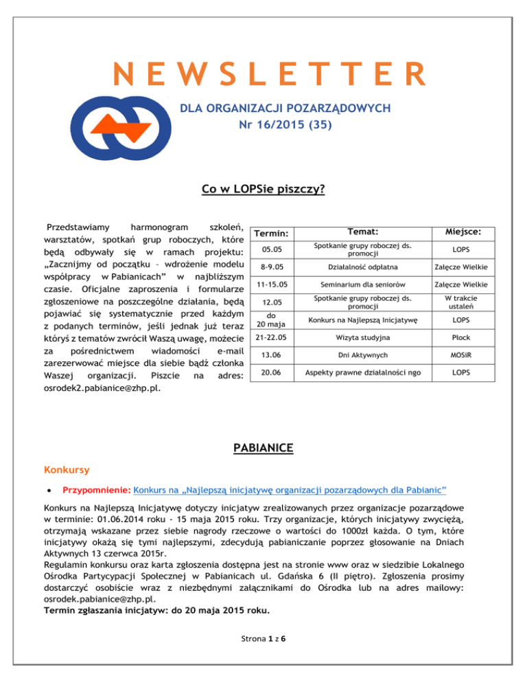 NEWSLETTER DLA ORGANIZACJI POZARZĄDOWYCH Nr 16/2015 (35) Co w LOPSie piszczy? Przedstawiamy harmonogram szkoleń, warsztatów, spotkań grup roboczych, które będą odbywały się w ramach projektu: „Zacznijmy od początku – wdrożenie modelu współpracy w Pabianicach” w najbliższym czasie. Oficjalne zaproszenia i formularze zgłoszeniowe na poszczególne działania, będą pojawiać się systematycznie przed każdym z podanych terminów, jeśli jednak już teraz któryś z tematów zwrócił Waszą uwagę, możecie za pośrednictwem wiadomości e-mail zarezerwować miejsce dla siebie bądź członka Waszej organizacji. Piszcie na adres: [email protected]. Termin: Temat: Miejsce: 05.05 Spotkanie grupy roboczej ds. promocji LOPS 8-9.05 Działalność odpłatna Załęcze Wielkie 11-15.05 Seminarium dla seniorów Załęcze Wielkie 12.05 Spotkanie grupy roboczej ds. promocji W trakcie ustaleń do 20 maja Konkurs na Najlepszą Inicjatywę LOPS 21-22.05 Wizyta studyjna Płock 13.06 Dni Aktywnych MOSiR 20.06 Aspekty prawne działalności ngo LOPS PABIANICE Konkursy Przypomnienie: Konkurs na „Najlepszą inicjatywę organizacji pozarządowych dla Pabianic” Konkurs na Najlepszą Inicjatywę dotyczy inicjatyw zrealizowanych przez organizacje pozarządowe w terminie: 01.06.2014 roku - 15 maja 2015 roku. Trzy organizacje, których inicjatywy zwyciężą, otrzymają wskazane przez siebie nagrody rzeczowe o wartości do 1000zł każda. O tym, które inicjatywy okażą się tymi najlepszymi, zdecydują pabianiczanie poprzez głosowanie na Dniach Aktywnych 13 czerwca 2015r. Regulamin konkursu oraz karta zgłoszenia dostępna jest na stronie www oraz w siedzibie Lokalnego Ośrodka Partycypacji Społecznej w Pabianicach ul. Gdańska 6 (II piętro). Zgłoszenia prosimy dostarczyć osobiście wraz z niezbędnymi załącznikami do Ośrodka lub na adres mailowy: [email protected]. Termin zgłaszania inicjatyw: do 20 maja 2015 roku. Strona 1 z 6 Warsztaty, szkolenia Drugie spotkanie grupy ds. promocji 5 maja br. w siedzibie Lokalnego Ośrodka Partycypacji Społecznej odbędzie się drugie spotkanie grupy roboczej ds. promocji. Tym razem dowiemy się kto i kiedy może ubiegać się o patronat Prezydenta Miasta Pabianic oraz jakie są przywileje i obowiązki związane z patronatem. Grupa jest otwarta, dlatego jeśli ktoś nie uczestniczył w pierwszym spotkaniu, może śmiało dołączyć teraz. Początek o godz. 16:00. Zapraszamy. Warsztat "Działalność odpłatna i nieodpłatna w organizacji pozarządowej" Lokalny Ośrodek Partycypacji Społecznej w Pabianicach w dniach 8-9 maja 2015 r. organizuje dwudniowy, wyjazdowy warsztat do Załęcza Wielkiego poświęcony m.in. działalności odpłatnej i nieodpłatnej w organizacjach pozarządowych. Termin nadsyłania zgłoszeń upływa 6 maja o godz. 16:00. Udział w warsztacie jest bezpłatny. Wydarzenia i informacje Autobus dla Szubry Rzymskokatolicka parafia świętego Marka na Szubrze w Kairze (www.stmarklatin.com) prowadzi ośrodek dla osób niepełnosprawnych "Club de Bonheur". Zepsuł im się jednak autobus potrzebny do pracy z podopiecznymi i chcemy im pomóc zebrać fundusze na zakup nowego. Akcja "Autobus dla Szubry" potrwa od 1 maja do 7 czerwca. Mamy nadzieję, że w tym czasie ten smutny, zepsuty autobus zamieni się w nowy, pełen radości. Dołączajcie! Szczegóły akcji: http://domwschodni.pl/autobusdla-szubry/. Rajd rowerowy do Ogrodu Botanicznego w Łodzi Rodzinny Klub Turystyki Kolarskiej "Konusik" PTTK Pabianice zaprasza całe rodziny do uczestnictwa w rajdzie rowerowym z Pabianic do Ogrodu Botanicznego i z powrotem (ok. 35 km). W ramach atrakcji organizatorzy zapewniają m.in.: zajęcia z przewodnikiem dla dzieci w ogrodzie botanicznym, pilota i obsługę rajdu, słodką przekąskę i pamiątkowy gadżet. Uwaga! Ilość miejsc ograniczona. Wpisowe wynosi 10 zł. Wpłaty wpisowego do 11.05.15 przyjmuje: PTTK Pabianice, ul Traugutta 2. Zawodnicy Azymutu na podium w międzynarodowych zawodach w biegu na orientację Dwunastu zawodników Azymutu stanęło na podium w międzynarodowych zawodach w biegu na orientację rozegranych w okolicach Wyszkowa. Największą niespodziankę sprawiła Kinga Królik, pewnie zwyciężając w kategorii seniorek K21E (kobiety powyżej 21 lat), mając zaledwie 16. Wszystkim biegaczom gratulujemy i trzymamy kciuki za kolejne sukcesy! Spotkania z nordic walking ruszają 4 maja 4 maja ruszają bezpłatne cotygodniowe treningi nordic walking przy MOSiR na Lewitynie. Spotkania, które odbywały się już w ubiegłym roku, ciesząc się dużą popularnością wśród pabianiczan, są owocem ogólnopolskiego projektu „Chodźmy prawidłowo”. Treningi będą trwać ok. 2 godzin, rozpoczęte od rozgrzewki, która wprawić w ruch ma wszystko od czubka głowy aż po palce u nóg, poprzez około godzinny spacer na terenach Bugaju, aż do rozciągania mięśni na koniec spotkania. Nie trzeba martwić się o sprzęt – kije będą zapewnione przez prowadzącego zajęcia. Strona 2 z 6 Wernisaż "Kruka" Codziennie na ulicach widzimy jego prace: pomalowane kamienie, pręty, suche drzewa, płoty, ściany... Jednak tym razem poznamy nowego „Kruka. Na wystawie w Clubie Boniecki Cafe przy Traugutta 13a pokaże zdjęcia. Były robione telefonem komórkowym, kompaktem i lustrzanką. Najstarsze powstało w 2006 roku. Otwarcie wystawy w piątek 8 maja o godz. 19:00 w Cafe Boniecki. Przypomnienie: Otwarcie Parku im. J. Słowackiego w Pabianicach Już 9 maja 2015 r. o godz. 12:00 nastąpi uroczyste otwarcie parku im. J. Słowackiego. Po rewitalizacji liczący 114 lat park zmienił się nie do poznania. Dla mieszkańców Pabianic zapowiada się dzień pełen atrakcji, który zostanie zakończony koncertem i wielkim pokazem fajerwerków. Z tej okazji będzie można m.in. przejechać się po Pabianicach zabytkowym tramwajem SANOK z roku 1928. Przypomnienie: Informacja o możliwości składania wniosków na realizację zadań publi