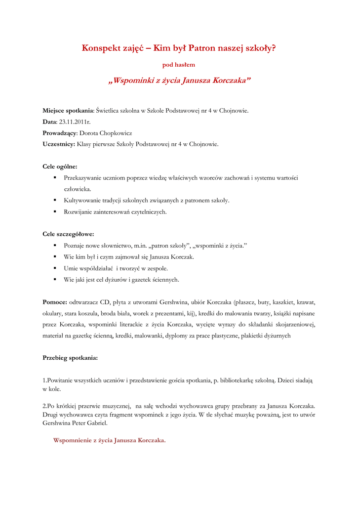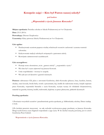 Konspekt zajęć – Kim był Patron naszej szkoły? pod hasłem „Wspominki z życia Janusza Korczaka” Miejsce spotkania: Świetlica szkolna w Szkole Podstawowej nr 4 w Chojnowie. Data: 23.11.2011r. Prowadzący: Dorota Chopkowicz Uczestnicy: Klasy pierwsze Szkoły Podstawowej nr 4 w Chojnowie. Cele ogólne: Przekazywanie uczniom poprzez wiedzę właściwych wzorców zachowań i systemu wartości człowieka. Kultywowanie tradycji szkolnych związanych z patronem szkoły. Rozwijanie zainteresowań czytelniczych. Cele szczegółowe: Poznaje nowe słownictwo, m.in. „patron szkoły”, „wspominki z życia.” Wie kim był i czym zajmował się Janusza Korczak. Umie współdziałać i tworzyć w zespole. Wie jaki jest cel dyżurów i gazetek ściennych. Pomoce: odtwarzacz CD, płyta z utworami Gershwina, ubiór Korczaka (płaszcz, buty, kaszkiet, krawat, okulary, stara koszula, broda biała, worek z prezentami, kij), kredki do malowania twarzy, książki napisane przez Korczaka, wspominki literackie z życia Korczaka, wycięte wyrazy do składanki skojarzeniowej, materiał na gazetkę ścienną, kredki, malowanki, dyplomy za prace plastyczne, plakietki dyżurnych Przebieg spotkania: 1.Powitanie wszystkich uczniów i przedstawienie gościa spotkania, p. bibliotekarkę szkolną. Dzieci siadają w kole. 2.Po krótkiej przerwie muzycznej, na salę wchodzi wychowawca grupy przebrany za Janusza Korczaka. Drugi wychowawca czyta fragment wspominek z jego życia. W tle słychać muzykę poważną, jest to utwór Gershwina Peter Gabriel. Wspomnienie z życia Janusza Korczaka. Janusz kupił cały wór zabawek, książeczek, łakoci i maskę z siwą brodą. Wystarał się o kożuch i długi pasterski kij. Nazajutrz z pierwszą gwiazdką nad Solcem, ledwo zalśniły lampy i łojowe świeczki, z podwórza wychodzi starzec siwy z worem na plecach, w kożuchu i postukując kijem, chodzić poczyna po domach. Śpiewamy kolędy, dzielimy się opłatkiem i chwilą bożego pokoju, a tu stukanie. - Kto tam? - Puśćcie, ludzie, puśćcie, idę do was siedem roków, łaskę niosę w moim wzroku.... Idzie Święty Mikołaj od domu do domu, wszystkich nazywa po imieniu, dla każdego ma jak nie podarek, to upomnienie- zna tu wszystkie tajemnice. 3. Nauczyciel który wcielił się w postać Korczaka, prezentuje się dzieciom. Padają pierwsze pytania skierowane do dzieci. Nauczyciel w rozmowie z dziećmi próbuje wyjaśnić dzieciom istotę znaczenia słowa „patron szkoły.” -Kochane dzieci , jestem Janusz Korczak, patron waszej szkoły. Czy ktoś z Was o mnie słyszał już kiedyś? -Odpowiadają dzieci. -Przyszedłem do Was dzisiaj, bo bardzo mi zależy abyśmy poznali się troszkę lepiej. Może jak mnie już poznacie, to wyjaśnicie mi dlaczego zostałem waszym patronem. Bardzo na was liczę, już widzę po Waszych buziach, że jesteście bardzo zdolne i ciekawe nowych rzeczy. „Urodziłem się dawno, dawno temu. Mój tatuś był adwokatem pochodzenia żydowskiego. Żyłem w rodzinie, która dbała jednak o polską tradycję i kulturę. Kiedy zmarł mój ojciec , wtedy zostałem studentem medycyny. Zarabiałem wtedy na dom udzielając lekcji nauczania. Wiele czasu spędzałem wtedy z dziećmi z robotniczych dzielnic Warszawy, ucząc biedne dzieci i opiekując się nimi. Ja bardzo lubiłem dzieci. Kiedy zostałem już lekarzem pediatrą, w dziecięcym szpitalu leczyłem dzieci, te najbiedniejsze i najbardziej potrzebujące. W czasach w jakich żyłem, była I wojna światowa stąd dzieci potrzebujących mnie, było bardzo dużo. Moim marzeniem oprócz bycia lekarzem, była chęć bycia nauczycielem, wychowawcą – takim rzeźbiarzem dziecięcych dusz, jak ja to nazywam. Dlatego założyłem Dom Sierot w Warszawie. Mieszkałem tam w małej i skromnej sypialni dziecięcej. Byłem dyrektorem i wychowawcą tego domu, i powiem wam jeszcze, że byłem z tymi dziećmi do samego końca ich dni. Całe życie pracowałem z dziećmi osieroconymi, to znaczy takimi które nie miały mamusi i tatusia. A kiedy wybuchła wojna, nie opuściłem dzieci – przygarniałem jak własne, dzieci zgubione. Chroniłem Dom Sierot, przez radio opowiadałem bajki i leczyłem od smutku te małe istoty. -Więc, teraz już śmiało zapytam Was: Kim był Janusz Korczak, patron waszej szkoły? -Odpowiadają dzieci podnosząc ręce do góry. - Jak myślicie co oznacza słowo patron szkoły? -Odpowiadają dzieci podnosząc ręce do góry. To był najpiękniejszy okres w moim życiu i wiecie co wymyśliłem tam wtedy? Otóż kilka ciekawych rzeczy, które jeśli pozwolicie chętnie i wam pokażę. M.in. „Gazetkę uczniowską”, „dyżury dziecięce”, bo są one bardzo pouczające i potrzebne Wam drogie dzieci. Na początek pomoże mi w tym Pani Jola, bibliotekarka szkolna, która przedstawi Wam jedną z moich ulubionych książek, których wiele napisałem. 4. Pani bibliotekarka zapoznaje dzieci z dorobkiem literackim Janusza Korczaka, prezentując wybrane książki. 5. Następnie wychowawczyni wspólnie z dziećmi wprowadza dyżury w grupie świetlicowej. 6. Dzieci z opiekunem grupy tworzą gazetkę ścienną ze składanki słów skojarzeniowych związanych z tematem i załączonymi rysunkami. 7.Na koniec dzieci malują kolorowankę z wizerunkiem J. Korczak otoczonego dziećmi. 8.Podziękowanie i pożegnanie wszystkich uczestników spotkania z patronem naszej szkoły. Przygotowała i realizowała: mgr Dorota Chopkowicz