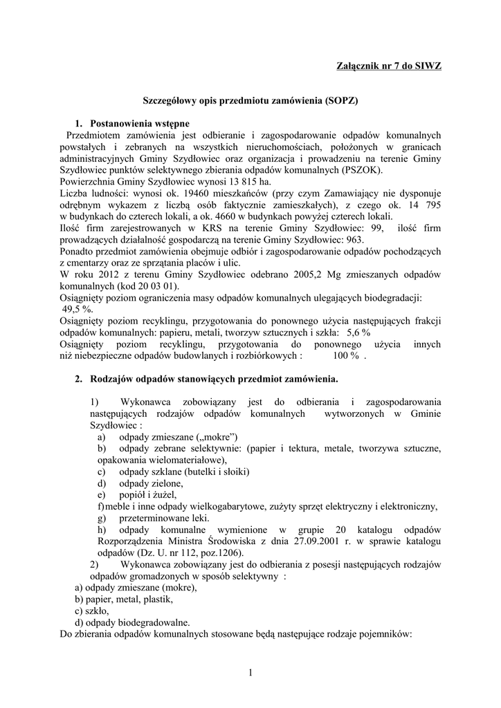 Załącznik nr 7 do SIWZ Szczegółowy opis przedmiotu zamówienia (SOPZ) 1. Postanowienia wstępne Przedmiotem zamówienia jest odbieranie i zagospodarowanie odpadów komunalnych powstałych i zebranych na wszystkich nieruchomościach, położonych w granicach administracyjnych Gminy Szydłowiec oraz organizacja i prowadzeniu na terenie Gminy Szydłowiec punktów selektywnego zbierania odpadów komunalnych (PSZOK). Powierzchnia Gminy Szydłowiec wynosi 13 815 ha. Liczba ludności: wynosi ok. 19460 mieszkańców (przy czym Zamawiający nie dysponuje odrębnym wykazem z liczbą osób faktycznie zamieszkałych), z czego ok. 14 795 w budynkach do czterech lokali, a ok. 4660 w budynkach powyżej czterech lokali. Ilość firm zarejestrowanych w KRS na terenie Gminy Szydłowiec: 99, ilość firm prowadzących działalność gospodarczą na terenie Gminy Szydłowiec: 963. Ponadto przedmiot zamówienia obejmuje odbiór i zagospodarowanie odpadów pochodzących z cmentarzy oraz ze sprzątania placów i ulic. W roku 2012 z terenu Gminy Szydłowiec odebrano 2005,2 Mg zmieszanych odpadów komunalnych (kod 20 03 01). Osiągnięty poziom ograniczenia masy odpadów komunalnych ulegających biodegradacji: 49,5 %. Osiągnięty poziom recyklingu, przygotowania do ponownego użycia następujących frakcji odpadów komunalnych: papieru, metali, tworzyw sztucznych i szkła: 5,6 % Osiągnięty poziom recyklingu, przygotowania do ponownego użycia innych niż niebezpieczne odpadów budowlanych i rozbiórkowych : 100 % . 2. Rodzajów odpadów stanowiących przedmiot zamówienia. 1) Wykonawca zobowiązany jest do odbierania i zagospodarowania następujących rodzajów odpadów komunalnych wytworzonych w Gminie Szydłowiec : a) odpady zmieszane („mokre”) b) odpady zebrane selektywnie: (papier i tektura, metale, tworzywa sztuczne, opakowania wielomateriałowe), c) odpady szklane (butelki i słoiki) d) odpady zielone, e) popiół i żużel, f)meble i inne odpady wielkogabarytowe, zużyty sprzęt elektryczny i elektroniczny, g) przeterminowane leki. h) odpady komunalne wymienione w grupie 20 katalogu odpadów Rozporządzenia Ministra Środowiska z dnia 27.09.2001 r. w sprawie katalogu odpadów (Dz. U. nr 112, poz.1206). 2) Wykonawca zobowiązany jest do odbierania z posesji następujących rodzajów odpadów gromadzonych w sposób selektywny : a) odpady zmieszane (mokre), b) papier, metal, plastik, c) szkło, d) odpady biodegradowalne. Do zbierania odpadów komunalnych stosowane będą następujące rodzaje pojemników: 1 a) b) c) d) pojemniki z tworzyw sztucznych o pojemności 120 1 lub 240 1, pojemniki z tworzyw sztucznych lub metalowe o pojemności 1100 1, kontenery KP 5, KP 7, KP 10, KP 14, worki o pojemności 120 1. 3) Wykonawca zobowiązany jest do przyjęcia dostarczonych do stacjonarnego PSZOK następujących rodzajów odpadów komunalnych: 10 01 01 – żużle, popioły paleniskowe i pyły z kotłów (z wyłączeniem pyłów z kotłów wymienionych w 10 01 04), 13 02 07 – oleje silnikowe, przekładniowe i smarowe łatwo ulegające biodegradacji, 13 02 08 – inne oleje silnikowe, przekładniowe i smarowe, 15 01 01 – opakowania z papieru i tektury (kartony, pudełka papierowe, itp.), 15 01 02 – opakowania z tworzyw sztucznych, 15 01 03 – opakowania z drewna, 15 01 04 – opakowania z metali (puszki), 15 01 05 – opakowania wielomateriałowe (kartony po napojach, itp.), 15 01 07 – opakowania ze szkła, 16 01 03 – zużyte opony, 16 01 07 – filtry olejowe, 16 01 13 – płyny hamulcowe, 17 01 07zmieszane odpady z betonu, gruzu ceglanego, odpadowych materiałów ceramicznych i elementów wyposażenia inne niż wymienione w 17 01 06 20 01 13 – rozpuszczalniki, 20 01 21 – lampy fluorescencyjne i inne odpady zawierające rtęć, 20 01 27 – farby, tusze, farby drukarskie, kleje, lepiszcze i żywice zawierające substancje niebezpieczne, 20 01 28 – farby, tusze, farby drukarskie, kleje, lepiszcze i żywice inne niż wymienione w 20 01 27; 20 01 31 – leki cytotoksyczne i cytostatyczne, 20 01 32 – leki inne niż wymienione w 20 01 31, 20 01 33 – baterie i akumulatory łącznie z bateriami i akumulatorami wymienionymi w 16 06 01, 16 06 02 lub 16 06 03 oraz nie sortowane baterie i akumulatory zawierające te baterie, 20 01 34 – baterie i akumulatory inne niż wymienione w 20 01 33, 20 01 35 – zużyte urządzenia elektryczne i elektroniczne inne niż wymienione w 20 01 21 i 20 01 23 zawierające niebezpieczne składniki, 20 01 36 – zużyte urządzenia elektryczne i elektroniczne inne niż wymienione w 20 01 21, 20 01 23 i 20 01 35, 20 01 38 – drewno inne niż wymienione w 20 01 37, 20 01 39 – tworzywa sztuczne (meble ogrodowe, wiadra, miski, doniczki, itp.), 20 01 40 – metale, 20 01 80 – środki ochrony roślin inne niż wymienione w 20 01 19, 20 01 99 – inne nie wymienione frakcje zbierane w sposób selektywny, 20 02 01 – odpady ulegające biodegradacji (gałęzie, liście, skoszona trawa). 20 03 07 – odpady wielkogabarytowe. 2 4) Wykonawca zobowiązany jest odebrać (PSZOK mobilny): odpady wielkogabarytowe, zużyty sprzęt RTV i AGD oraz opony, które zostaną wystawione przez mieszkańców przed posesję lub przy altanach śmietnikowych zgodnie z uzgodnionym z gminą harmonogramem, z częstotliwością 2- krotnego odbioru w ciągu roku. 3. Wymagania w zakresie organizacji i prowadzenia stacjonarnego Punktu Selektywnego Zbierania Odpadów Komunalnych: W celu utworzenia PSZOK stacjonarnego Gmina Szydłowiec udostępni nieodpłatnie działki stanowiące własność Gminy. Są to działki przy ul Piaskowej 22, na terenie istniejącego składowiska odpadów komunalnych, (działki o nr ew. 2333/9, 2333/2 i 2333/11 wpółnocno – wschodnim obszarze wysypiska). Zamawiający proponuje nieodpłatne wykorzystanie istniejącego budynku socjalno – magazynowego na potrzeby PSZOK. Wykonawca zobowiązany będzie do dokonania adaptacji budynku na cele PSZOK i ponoszenia kosztów j