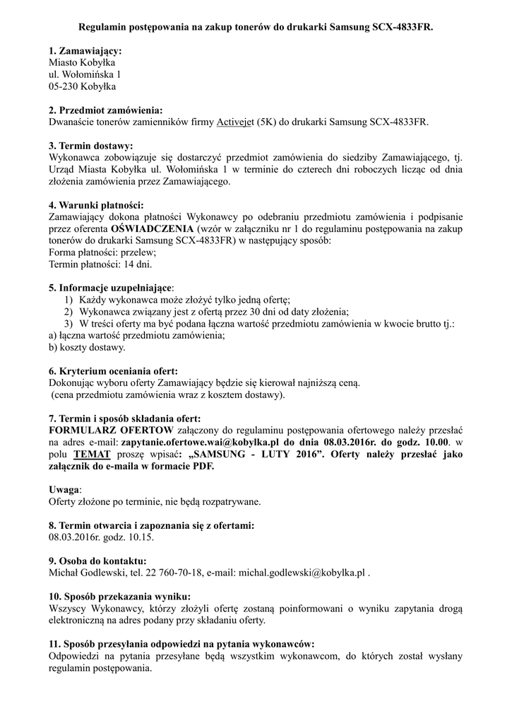 Regulamin postępowania na zakup tonerów do drukarki Samsung SCX-4833FR. 1. Zamawiający: Miasto Kobyłka ul. Wołomińska 1 05-230 Kobyłka 2. Przedmiot zamówienia: Dwanaście tonerów zamienników firmy Activejet (5K) do drukarki Samsung SCX-4833FR. 3. Termin dostawy: Wykonawca zobowiązuje się dostarczyć przedmiot zamówienia do siedziby Zamawiającego, tj. Urząd Miasta Kobyłka ul. Wołomińska 1 w terminie do czterech dni roboczych licząc od dnia złożenia zamówienia przez Zamawiającego. 4. Warunki płatności: Zamawiający dokona płatności Wykonawcy po odebraniu przedmiotu zamówienia i podpisanie przez oferenta OŚWIADCZENIA (wzór w załączniku nr 1 do regulaminu postępowania na zakup tonerów do drukarki Samsung SCX-4833FR) w następujący sposób: Forma płatności: przelew; Termin płatności: 14 dni. 5. Informacje uzupełniające: 1) Każdy wykonawca może złożyć tylko jedną ofertę; 2) Wykonawca związany jest z ofertą przez 30 dni od daty złożenia; 3) W treści oferty ma być podana łączna wartość przedmiotu zamówienia w kwocie brutto tj.: a) łączna wartość przedmiotu zamówienia; b) koszty dostawy. 6. Kryterium oceniania ofert: Dokonując wyboru oferty Zamawiający będzie się kierował najniższą ceną. (cena przedmiotu zamówienia wraz z kosztem dostawy). 7. Termin i sposób składania ofert: FORMULARZ OFERTOW załączony do regulaminu postępowania ofertowego należy przesłać na adres e-mail: [email protected] do dnia 08.03.2016r. do godz. 10.00. w polu TEMAT proszę wpisać: „SAMSUNG - LUTY 2016”. Oferty należy przesłać jako załącznik do e-maila w formacie PDF. Uwaga: Oferty złożone po terminie, nie będą rozpatrywane. 8. Termin otwarcia i zapoznania się z ofertami: 08.03.2016r. godz. 10.15. 9. Osoba do kontaktu: Michał Godlewski, tel. 22 760-70-18, e-mail: [email protected] . 10. Sposób przekazania wyniku: Wszyscy Wykonawcy, którzy złożyli ofertę zostaną poinformowani o wyniku zapytania drogą elektroniczną na adres podany przy składaniu oferty. 11. Sposób przesyłania odpowiedzi na pytania wykonawców: Odpowiedzi na pytania przesyłane będą wszystkim wykonawcom, do których został wysłany regulamin postępowania. 12. Zamawiający zastrzega sobie prawo do unieważnienia postępowania bez podania przyczyny.