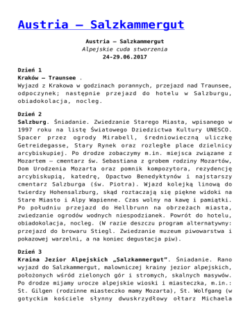 Austria – Salzkammergut Austria – Salzkammergut Alpejskie cuda stworzenia 24-29.06.2017 Dzień 1 Kraków – Traunsee . Wyjazd z Krakowa w godzinach porannych, przejazd nad Traunsee, odpoczynek; następnie przejazd obiadokolacja, nocleg. do hotelu w Salzburgu, Dzień 2 Salzburg. Śniadanie. Zwiedzanie Starego Miasta, wpisanego w 1997 roku na listę Światowego Dziedzictwa Kultury UNESCO. Spacer przez ogrody Mirabell, średniowieczną uliczkę Getreidegasse, Stary Rynek oraz rozległe place dzielnicy arcybiskupiej. Po drodze zobaczymy m.in. miejsca związane z Mozartem – cmentarz św. Sebastiana z grobem rodziny Mozartów, Dom Urodzenia Mozarta oraz pomnik kompozytora, rezydencję arcybiskupią, katedrę, Opactwo Benedyktynów i najstarszy cmentarz Salzburga (św. Piotra). Wjazd kolejką linową do twierdzy Hohensalzburg, skąd roztaczają się piękne widoki na Stare Miasto i Alpy Wapienne. Czas wolny na kawę i pamiątki. Po południu przejazd do Hellbrunn na obrzeżach miasta, zwiedzanie ogrodów wodnych niespodzianek. Powrót do hotelu, obiadokolacja, nocleg. (W razie deszczu program alternatywny: przejazd do browaru Stiegl. Zwiedzanie muzeum piwowarstwa i pokazowej warzelni, a na koniec degustacja piw). Dzień 3 Kraina Jezior Alpejskich „Salzkammergut”. Śniadanie. Rano wyjazd do Salzkammergut, malowniczej krainy jezior alpejskich, położonych wśród zielonych gór i stromych, skalnych masywów. Po drodze mijamy urocze alpejskie wioski i miasteczka, m.in.: St. Gilgen (rodzinne miasteczko mamy Mozarta), St. Wolfgang (w gotyckim kościele słynny dwuskrzydłowy ołtarz Michaela Pachera), Bad Ischl (stolicę operetki i letnią rezydencję Franciszka Józefa), a „na deser” Hallstatt – przepiękne miasteczko wpisane na Listę UNESCO. Rejs wycieczkowy statkiem z St. Gilgen do St. Wolfgang (spacer po St. Gilgen i St. Wolfgang); zwiedzanie Hallstatt; zwiedzanie Bad Ischl, kawa i ciasto w słynnej kawiarni Zauner; powrót do hotelu, obiadokolacja, nocleg. Dzień 4 Jaskinie lodowe i skalny wąwóz Liechtensteinklamm. Śniadanie; wycieczka do Werfen (40 km na południe od Salzburga), do największych na świecie jaskiń lodowych. Wycieczka dla bardziej aktywnych, ale nie nazbyt forsowna: do góry wjeżdża się kolejką linową i maszeruje 2x po 20 minut. Samo zwiedzanie jaskiń trwa 90 min. Do pokonania jest 700 schodów pod górę! Po południu przejazd do skalnego wąwozu Liechtensteinklamm w St. Johann im Pongau (60 km na południe od Salzburga); powrót do hotelu, obiadokolacja, nocleg. Dzień 5 Orle gniazdo i Königsee. Śniadanie. Wyjazd na Bawarię, do alpejskiej kwatery Hitlera Orlego Gniazda, a potem rejs stateczkiem po Jeziorze Królewskim do wyspy św. Bartłomieja; następnie rejs po jeziorze Królewskim. Powrót do hotelu, obiadokolacja, nocleg. Dzień 6 Ołomuniec – Kraków . Śniadania; przejazd do Ołomuńca – zwiedzanie Starówki i kaplicy św. Jana Sarkandra; wyjazd w drogę powrotną do Polski, powrót do Krakowa w godzinach wieczornych, zakończenie pielgrzymki. Świadczenia: komfortowy, klimatyzowany autokar 5 noclegów w komfortowym hotelu 3*, pokoje 2-, 3-osobowe z łazienkami 5 śniadań i 5 obiadokolacji obsługa pilota i przewodnika na całej trasie opieka duchowa kapłana codzienna msza św. bilety wstępu do zwiedzanych obiektów ubezpieczenie KL i NNW, od chorób przewlekłych Cena nie obejmuje: dopłaty do pokoju jednoosobowego (90 EUR) napiwków zwyczajowych dla pilota, kierowców i obsługi hotelowej (40 EUR) napojów do obiadokolacji wydatków osobistych Ważne informacje: organizator zastrzega sobie prawo zmiany kolejności zwiedzania w zależności od: pogody, kondycji uczestników oraz godzin otwarcia obiektów cena wyjazdu zawiera składkę do Turystycznego Funduszu Gwarancyjnego