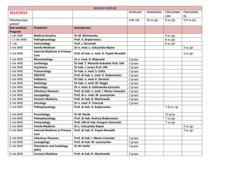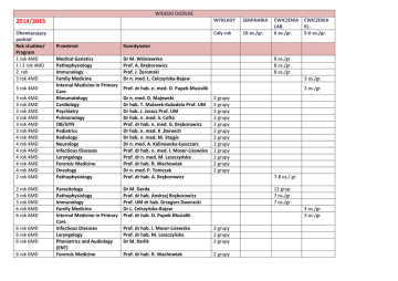 WIDEŁKI OGÓLNE 2014/2015 WYKŁADY SEMINARIA Obowiązujący podział Rok studiów/ Program 1 rok 4MD 1 i 2 rok 4MD 2. rok 3 rok 4MD Cały rok 16 os./gr. 3 rok 4MD 3 rok 4MD 3 rok 4MD 3 rok 4MD 3 rok 4MD 3 rok 4MD 3 rok 4MD 4 rok 4MD 4 rok 4MD 4 rok 4MD 4 rok 4MD 4 rok 4MD 4 rok 4MD 2 rok 6MD 2 rok 6MD 3 rok 6MD 3 rok 6MD 6 rok 6MD 6 rok 6MD 6 rok 6MD 6 rok 6MD 6 rok 6MD 6 rok 6MD Przedmiot Koordynator Medical Genetics Pathophysiology Immunology Family Medicine Internal Medicine in Primary Care Rheumatology Cardiology Psychiatry Pulmonology OB/GYN Pediatrics Radiology Neurology Infectious Diseases Laryngology Forensic Medicine Oncology Pathophysiology Dr M. Wiśniewska Prof. A. Bręborowicz Prof. J. Żeromski Dr n. med. L. Celczyńska-Bajew Parasitology Pathophysiology Immunology Family Medicine Internal Medicine in Primary Care Infectious Diseases Laryngology Phoniatrics and Audiology (ENT) Forensic Medicine Dr M. Derda Prof. dr hab. Andrzej Bręborowicz Prof. UM dr hab. Grzegorz Dworacki Dr L. Celczyńska-Bajew Prof. dr hab. D. Pupek-Musialik ĆWICZENIA LAB. 6 os./gr. 8 os./gr. 8 os./gr. 8 os./gr. 3 os./gr. Prof. dr hab. n. med. D. Pupek-Musialik Dr n. med. D. Majewski Dr hab. T. Mularek-Kubzdela Prof. UM Dr hab. J. Jaracz Prof. UM Dr hab. n. med. S. Cofta Prof. dr hab. n. med. G. Bręborowicz Dr hab. n. med. K .Derwich Dr hab. n. med. M. Stajgis Dr n. med. A. Kalinowska-Łyszczarz Prof. dr hab. n. med. I. Moser-Lisewska Prof. dr n. med. M. Leszczyńska Prof. dr hab. R. Wachowiak Dr n. med. P. Tomczak Prof. dr hab. A. Bręborowicz ĆWICZENIA KL. 5-6 os./gr. 3 os./gr. 2 grupy 2 grupy 2 grupy 2 grupy 2 grupy 2 grupy 2 grupy 2 grupy 2 grupy 2 grupy 2 grupy 2 grupy 7-8 os./ gr. 12 grup 7 os./gr. 7 os./gr. 3 os./gr. 3 os./gr. Prof. dr hab. I. Moser-Lisewska Prof. dr hab. M. Leszczyńska Dr M. Karlik 2 grupy 2 grupy 2 grupy Prof. dr hab. R. Wachowiak 2 grupy 6 rok 6MD 5 rok 5DDS Geriatric Medicine and Gerontology INTEGRACJE: Conservative Dentistry, Dental Prosthetics Prof. dr hab. K. Wieczorowska-Tobis Dr hab. Anna SzkaradkiewiczKarpińska, Dr Piotr Andrysiak 2 grupy 4 os./gr.