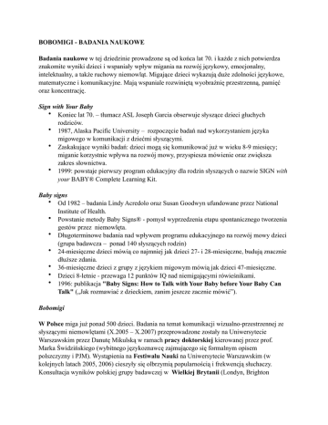 BOBOMIGI - BADANIA NAUKOWE Badania naukowe w tej dziedzinie prowadzone są od końca lat 70. i każde z nich potwierdza znakomite wyniki dzieci i wspaniały wpływ migania na rozwój językowy, emocjonalny, intelektualny, a także ruchowy niemowląt. Migające dzieci wykazują duże zdolności językowe, matematyczne i komunikacyjne. Mają wspaniale rozwiniętą wyobraźnię przestrzenną, pamięć oraz koncentrację. Sign with Your Baby • Koniec lat 70. – tłumacz ASL Joseph Garcia obserwuje słyszące dzieci głuchych rodziców. • 1987, Alaska Pacific University – rozpoczęcie badań nad wykorzystaniem języka migowego w komunikacji z dziećmi słyszącymi. • Zaskakujące wyniki badań: dzieci mogą się komunikować już w wieku 8-9 miesięcy; miganie korzystnie wpływa na rozwój mowy, przyspiesza mówienie oraz zwiększa zakres słownictwa. • 1999: powstaje pierwszy program edukacyjny dla rodzin słyszących o nazwie SIGN with your BABY® Complete Learning Kit. Baby signs • Od 1982 – badania Lindy Acredolo oraz Susan Goodwyn ufundowane przez National Institute of Health. • Powstanie metody Baby Signs® - pomysł wyprzedzenia etapu spontanicznego tworzenia gestów przez niemowlęta. • Długoterminowe badania nad wpływem programu edukacyjnego na rozwój mowy dzieci (grupa badawcza – ponad 140 słyszących rodzin) • 24-miesięczne dzieci mówią co najmniej jak dzieci 27- i 28-miesięczne, budują znacznie dłuższe zdania. • 36-miesięczne dzieci z grupy z językiem migowym mówią jak dzieci 47-miesięczne. • Dzieci 8-letnie - przewaga 12 punktów IQ nad niemigającymi rówieśnikami. • 1996: publikacja "Baby Signs: How to Talk with Your Baby before Your Baby Can Talk" („Jak rozmawiać z dzieckiem, zanim jeszcze zacznie mówić”). Bobomigi W Polsce miga już ponad 500 dzieci. Badania na temat komunikacji wizualno-przestrzennej ze słyszącymi niemowlętami (X.2005 – X.2007) przeprowadzone zostały na Uniwersytecie Warszawskim przez Danutę Mikulską w ramach pracy doktorskiej kierowanej przez prof. Marka Świdzińskiego (wybitnego językoznawcę zajmującego się formalnym opisem polszczyzny i PJM). Wystąpienia na Festiwalu Nauki na Uniwersytecie Warszawskim (w kolejnych latach 2005, 2006) cieszyły się olbrzymią popularnością i frekwencją słuchaczy. Konsultacja wyników polskiej grupy badawczej w Wielkiej Brytanii (Londyn, Brighton kwiecień/maj 2006) zaowocowała nawiązaniem współpracy międzynarodowej, a także potwierdziła wyjątkowe wyniki polskich dzieci. Grupa badawcza obejmuje 100 pełnosprawnych, słyszących dzieci słyszących rodziców, z językiem polskim jako pierwszym z całej Polski. Badania gruntownie analizują proces przyswajania znaków przez niemowlęta. Jest wiele czynników wpływających na to, kiedy, jak i ile dziecko miga, m.in. wiek, w którym zaczyna się do dziecka migać, rozwój fizyczny dziecka, cechy osobnicze, zdolności komunikacyjne rodziców, obecność rodzica w domu, częstotliwość i regularność pokazywanych znaków, a także odpowiedni dobór słowniczka. Obiektem szczególnego oglądu jest współistnienie znaku i słowa, tworzenie zdań migowo-fonicznych. Na tym etapie dzieci migają, by precyzować wypowiadane przez siebie pierwsze słowa, łączą znaki i słowa w celu przekazania treści bardziej skomplikowanych, ale też często mówiąc migają, aby wyrazić emocje towarzyszące zjawisku. Bardzo interesująca jest faza zaniku znaków na rzecz rozwijającej się mowy. Dzieci bardzo lubią migać, jednakże, gdy są już gotowe do mówienia, zdecydowanie przechodzą na ten bardziej ekonomiczny i wygodny sposób komunikacji. Lista naukowców zajmujących się różnymi aspektami komunikacji wizualno-przestrzennej z niemowlęciem: J.Garcia, L.P.Acredolo & S.W.Goodwyn, B.Moore, M.Daniels, C. Smith, S.Ward, L. Felzer, J.Hafer, L.Koehler, L. Loyd, R. Wilson, J. Teague, M.Teague, C.Brown, B. Moore, D. Bavelier, D. P. Corina, H.J.Neville, W.H. Calvin, G.A. Ojemann, K.Horobin, Y. Emmons, P.L. Griffith, Karmiloff-Smith, R.Wilbur, M. Jones, P.A. Square, S. Gretz, Stephen M.Edelson, M.R. Hopmann, C-LP. Donovan, J.F.Miller, A. Sedey, G. Miolo, M. Rosin, J.Murray-Branch, E.D. Gibbs, A.S. Springer, S.C.Cooley & S.Aloisio, D. Blackburn, J.Vonvillian, R. Ashby J.Carney, G. Cioffi, W.Raymond, M. Vernon, J.Coley, J. Hafer J. Dubois, L. Sensenig, B. Topf, E.Mazeika, D.Mikulska.