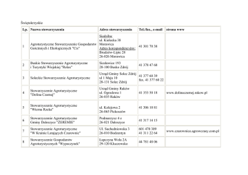 Świętokrzyskie Lp. Nazwa stowarzyszenia Adres stowarzyszenia Tel./fax., e-mail 1 Siedziba: ul. Kielecka 38 Agroturystyczne Stowarzyszenie Gospodarstw Morawica 41 301 70 38 Gościnnych i Ekologicznych "Cis" Adres korespondencyjny: Brudzów-Lipie 28 26-026 Morawica 2 Buskie Stowarzyszenie Agroturystyczne i Turystyki Wiejskiej "Relax" Siesławice 193 28-100 Busko Zdrój 3 Soleckie Stowarzyszenie Agroturystyczne Urząd Gminy Solec Zdrój 41 377 60 39 ul 1 Maja 10 fax. 41 377 60 22 28-131 Solec Zdrój 4 Stowarzyszenie Agroturystyczne "Dolina Czarnej" Urząd Gminy Raków ul. Ogrodowa 1 26-035 Raków 5 Stowarzyszenie Agroturystyczne "Wierna Rzeka" 6 Stowarzyszenie Agroturystyczne Gminy Daleszyce "ŻEREMIE" Podmarzysz 4 e 26-021 Daleszyce 41 317 14 15 7 Stowarzyszenie Agroturystyczne "W Krainie Latających Czarownic" Ul. Suchedniowska 3 26-010 Bodzentyn 601 470 309 41 311 22 64 8 Stowarzyszenie Gospodarstw Agroturystycznych "Wypoczynek" Łapczyna Wola 2A 29-120 Kluczewsko 44 781 48 06 ul. Kolejowa 2 26-065 Piekoszów strona www 41 378 47 68 41 353 50 18 www.dolinaczarnej.rakow.pl 41 306 10 81 www.czarownice.agrowczasy.com.pl 9 Stowarzyszenie Gospodarstw Gościnnych "NAD ZALEWEM HAŃCZA" Korytnica 37 28-225 Szydłów 41 354 51 65 10 Śladkowskie Stowarzyszenie Agroturystyczne i Turystyczne "Dolina Sanicy" Śladków Mały 25 26-020 Chmielnik 41-3542778 www.wakacje.agro.pl/dolinasanicy fax. 41 354 32 22 11 Świętokrzyskie Towarzystwo Agroturystyczne Trzcianka 22 "ŁYSOGÓRY" 26-006 Nowa Słupia 41 317 81 85 www.wakacje.agro.pl/korytnica www.agrolysogory.pl