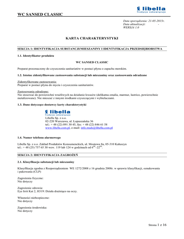 WC SANSED CLASSIC_________________________________ ____________ Data sporządzenia: 21-05-2015r. Data aktualizacji: WERSJA 1.0 KARTA CHARAKTERYSTYKI SEKCJA 1: IDENTYFIKACJA SUBSTANCJI/MIESZANINY I IDENTYFIKACJA PRZEDSIĘBIORSTWA 1.1. Identyfikator produktu WC SANSED CLASSIC Preparat przeznaczony do czyszczenia sanitariatów w postaci płynu o zapachu morskim. 1.2. Istotne zidentyfikowane zastosowania substancji lub mieszaniny oraz zastosowania odradzane Zidentyfikowane zastosowania: Preparat w postaci płynu do mycia i czyszczenia sanitariatów. Zastosowania odradzane: Nie stosować do powierzchni wrażliwych na działanie kwasów (delikatna emalia, marmur, lastrico, powierzchnie metalizowane). Nie mieszać z innymi środkami czyszczącymi i wybielaczami. 1.3. Dane dotyczące dostawcy karty charakterystyki Libella Sp. z o.o. 02-220 Warszawa, ul. Łopuszańska 36 tel.: + 48 (22) 891 30 45, fax: + 48 (22) 846 61 58 www.libella.com.pl, e-mail: [email protected] 1.4. Numer telefonu alarmowego Libella Sp. z o.o. Zakład Produktów Konsumenckich, ul. Mostowa 8a, 05-310 Kałuszyn tel.: + 48 (25) 757 65 30 wew. 119 lub 124 w godzinach od 600–2200. SEKCJA 2: IDENTYFIKACJA ZAGROŻEŃ 2.1. Klasyfikacja substancji lub mieszaniny Klasyfikacja zgodna z Rozporządzeniem WE 1272/2008 z 16 grudnia 2008r. w sprawie klasyfikacji, oznakowania i pakowania (CLP) Zagrożenia fizyczne: Nie dotyczy Zagrożenie zdrowia: Eye Irrit Kat 2, H319: Działa drażniąco na oczy. Własności niebezpieczne: Nie dotyczy Zagrożenia środowiska: Nie dotyczy Strona 1 z 16 WC SANSED CLASSIC_________________________________ ____________ 2.2. Elementy oznakowania Znak ostrzegawczy: Hasło ostrzegawcze: UWAGA Zwroty wskazujące rodzaj zagrożenia: H319 – Działa drażniąco na oczy. Zwroty określające warunki bezpiecznego stosowania: P102 – Chronić przed dziećmi. P101 – W razie konieczności zasięgnięcia porady lekarza należy pokazać pojemnik lub etykietę. P103 – Przed użyciem przeczytać etykietę. P264 – Dokładnie umyć ręce po użyciu P280 – Stosować ochronę oczu (okulary ochronne)/ochronę twarzy. P305 + P351 + P338 – W PRZYPADKU DOSTANIA SIĘ DO OCZU: Ostrożnie płukać wodą przez kilka minut. Wyjąć soczewki kontaktowe, jeżeli są i można je łatwo usunąć. Nadal płukać. P337 + P313 – W przypadku utrzymywania się działania drażniącego na oczy: Zasięgnąć porady/zgłosić się pod opiekę lekarza. P501 – Zawartość/pojemnik usuwać zgodnie z przepisami lokalnymi/regionalnymi/krajowymi/międzynarodowymi. Informacje dodatkowe: 2.3. Inne zagrożenia Brak informacji na temat spełnienia kryteriów PBT lub vPvB zgodnie z załącznikiem XIII rozporządzenia REACH. Odpowiednie badania nie były przeprowadzone. Strona 2 z 16 WC SANSED CLASSIC_________________________________ ____________ SEKCJA 3: SKŁAD/INFORMACJA O SKŁADNIKACH 3.1. Substancje Nie dotyczy. 3.2. Mieszaniny Nazwa składnika/ Numer indeksowy Zakres stężeń [%] Klasyfikacja (WE) 1272/2008 Numer CAS Numer WE Numer rejestracji Kwas 2hydroksypropanotri karboksylowy 1,2,3 ≥ 10 % Eye Irrit. 2, H319 5949-29-1 201-069-1 012119457026 -42-XXXX Alkohole etoksylowane C12-C14 (7 EO) <3% Acute Tox. 4,H302 Eye Dam. 1, H318 Aquatic Acute 1, H400 68439-50-9 - Polimer Kwas amidosulfonowy (016-026-00-0) <3% 5329-14-6 226-218-8 01211948863328-XXXX Eye Irrit. 2, H319 Skin Irrit. 2, H315 Aquatic Chronic 3, H412 Informacje dodatkowe: Pełny tekst zwrotów H: patrz sekcja 16 SEKCJA 4: ŚRODKI PIERWSZEJ POMOCY 4.1. Opis środków pierwszej pomocy Wdychanie: W normalnych warunkach nie stanowi zagrożenia. Kontakt ze skórą: Zdjąć zanieczyszczoną odzież i obuwie. Miejsca narażone na kontakt lub tylko podejrzane o kontakt z produktem umyć dużą ilością wody, najlepiej bieżącej. W przypadku utrzymywania się dolegliwości zasięgnąć porady lekarza. Kontakt z oczami: W PRZYPADKU DOSTANIA SIĘ DO OCZU: Ostrożnie płukać wodą przez kilka minut. Wyjąć soczewki kontaktowe, jeżeli są i można je łatwo usunąć. Nadal płukać. W przypadku utrzymywania się działania drażniącego na oczy: Zasięgnąć porady/zgłosić się pod opiekę lekarza. Spożycie: Dokładnie przepłukać jamę ustną wodą. Poszkodowanemu podać 1-2 szklanki wody do picia. Nie wywoływać wymiotów. Natychmiast zapewnić pomoc lekarską. W przypadku pojawienia się lub utrzymywania się dolegliwości powstałych wskutek narażenia na działanie WC SANSEDU CLASSIC, należy zapewnić poszkodowanemu pomoc lekarską. Należy usunąć źródło narażenia i przenieść poszkodowanego z miejsca narażenia. Zdjąć zanieczyszczoną odzież i obuwie. Preparat może powodować podrażnienia oczu. Osoby narażone na skażenie oczu powinny być pouczone o konieczności natychmiastowego płukania skóry i oczu. Osoby udzielające poszkodowanemu pomocy powinny być wyposażone w rękawice ochronne (kwasoodporne) i okulary lub ochronę twarzy. Strona 3 z 16 WC SANSED CLASSIC_________________________________ ____________ 4.2. Najważniejsze ostre i opóźnione objawy oraz skutki Kontakt z oczami: Może wystąpić zaczerwienienie, łzawienie, pieczenie. Kontakt ze skórą: Może wystąpić zaczerwienienie skóry. Połknięcie: Może wystąpić pieczenie w jamie ustnej i gardle, ból żołądka. 4.3. Wskazania dotyczące wszelkiej natychmiastowej pomocy lekarskiej i szczególnego postępowania z poszkodowanym Decyzję o sposobie postępowania ratunkowego podejmuje lekarz po dokładnej ocenie stanu poszkodowanego. SEKCJA 5: POSTĘPOWANIE W PRZYPADKU POŻARU Zawiadomić otoczenie o awarii. Usunąć z obszaru zagrożenia osoby niebiorące udziału w likwidowaniu awarii. 5.1. Środki gaśnicze Preparat nie jest palny. Zagrożone pożarem zbiorniki usunąć, jeżeli to możliwe i nie wiąże się z nadmiernym ryzykiem lub chłodzić rozpyloną wodą z odpowiedniej odległości. W razie potrzeby wezwać Straż Pożarną. 5.2. Szczególne zagrożenia związane z substancją lu