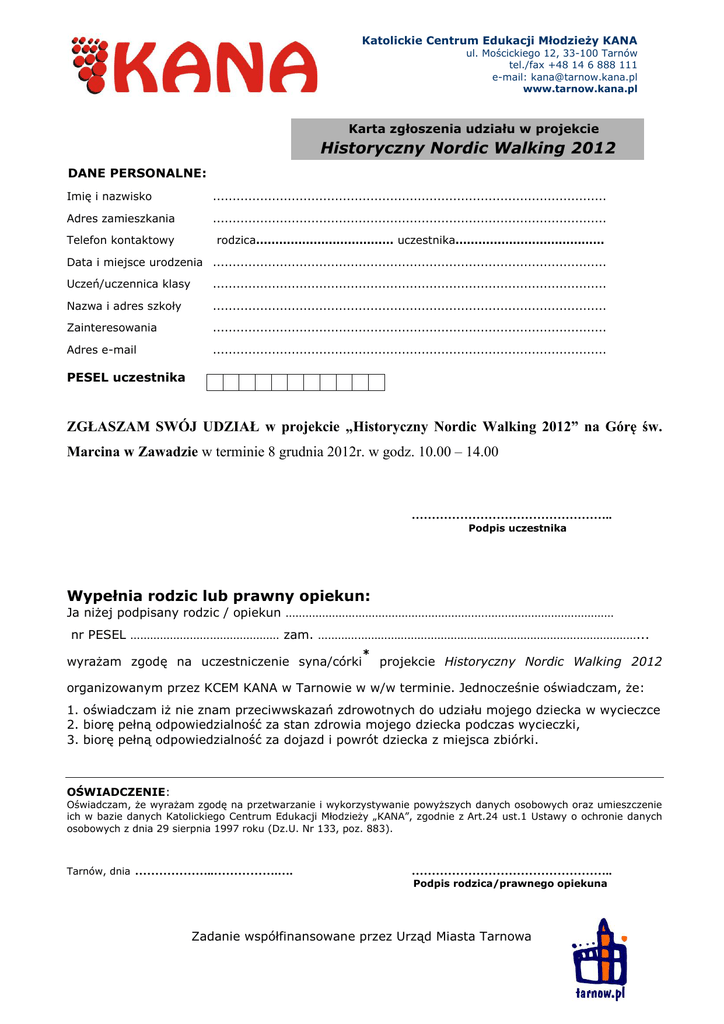 Katolickie Centrum Edukacji Młodzieży KANA ul. Mościckiego 12, 33-100 Tarnów tel./fax +48 14 6 888 111 e-mail: [email protected] www.tarnow.kana.pl Karta zgłoszenia udziału w projekcie Historyczny Nordic Walking 2012 DANE PERSONALNE: Imię i nazwisko .................................................................................................... Adres zamieszkania .................................................................................................... Telefon kontaktowy rodzica……………………………… uczestnika………………………………… Data i miejsce urodzenia .................................................................................................... Uczeń/uczennica klasy .................................................................................................... Nazwa i adres szkoły .................................................................................................... Zainteresowania .................................................................................................... Adres e-mail .................................................................................................... PESEL uczestnika ZGŁASZAM SWÓJ UDZIAŁ w projekcie „Historyczny Nordic Walking 2012” na Górę św. Marcina w Zawadzie w terminie 8 grudnia 2012r. w godz. 10.00 – 14.00 ………………………………………….. Podpis uczestnika Wypełnia rodzic lub prawny opiekun: Ja niżej podpisany rodzic / opiekun ……………………………………………………………………………………… nr PESEL ……………………………………… zam. ……………………………………………………………………………………... wyrażam zgodę na uczestniczenie syna/córki * projekcie Historyczny Nordic Walking 2012 organizowanym przez KCEM KANA w Tarnowie w w/w terminie. Jednocześnie oświadczam, że: 1. oświadczam iż nie znam przeciwwskazań zdrowotnych do udziału mojego dziecka w wycieczce 2. biorę pełną odpowiedzialność za stan zdrowia mojego dziecka podczas wycieczki, 3. biorę pełną odpowiedzialność za dojazd i powrót dziecka z miejsca zbiórki. OŚWIADCZENIE: Oświadczam, że wyrażam zgodę na przetwarzanie i wykorzystywanie powyższych danych osobowych oraz umieszczenie ich w bazie danych Katolickiego Centrum Edukacji Młodzieży „KANA”, zgodnie z Art.24 ust.1 Ustawy o ochronie danych osobowych z dnia 29 sierpnia 1997 roku (Dz.U. Nr 133, poz. 883). Tarnów, dnia ………………..…………….…. ………………………………………….. Podpis rodzica/prawnego opiekuna Zadanie współfinansowane przez Urząd Miasta Tarnowa