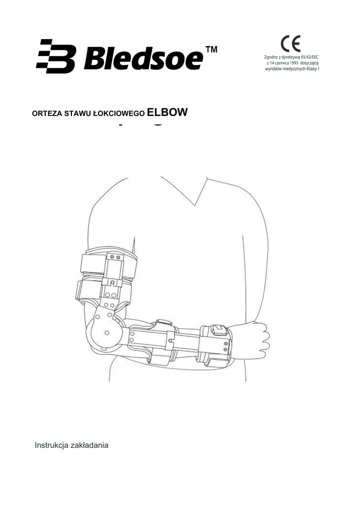 Zgodne z dyrektywą 93/42/EEC z 14 czerwca 1993 dotyczącą wyrobów medycznych Klasy I ORTEZA STAWU ŁOKCIOWEGO ELBOW Instrukcja zakładania 1.Odblokowanie zegara: Jeśli orteza zostanie dostarczona z zegrem zablokowanym w pozycji wyprostnej, należy odblokować zegar przesuwając srebrny suwak w stronę przeciwną do jego osi . 2. Zakładanie ortezy: a. Odpiąć wszystkie plastikowe zapięcia (4szt.), wciskając jednocześnie dwa szare wystające przyciski. b. Umiejscowić zegar na wysokości kłykcia bocznego kości ramiennej (na zewnątrz) 3. Dopasowanie długości szyn: a. Utrzymując pozycję zegara wspomnianą w pkt.2 (1b)– dopasować długość szyny dolnej do długości przedramienia . Zsunąć czarny klips blokujący z szyny, wcisnąć lekko metalowy bolec i rozsuwać szynę aż do uzyskania pożądanej długości (do nadgarstka). b. Zabezpieczyć bolec czarnym klipsem blokującym. c. Powtórzyć te same czynności dla szyny ramienia. 4. Dopasowanie ortezy: a. Umieścić kończynę w Cortezie. b. Dopasować/dogiąć aluminiowe obejmy do obwodu przedramienia c. Dopasować/dogiąć aluminiowe obejmy do obwodu ramienia 5. Zapinanie pasków: a. Zapiąć klamerkę znajdującą się tuż przy nadgarstku. b. Dopasować długość paska do obwodu przedramienia i zabezpieczyć wybraną długość przy użyciu taśmy Velcro. Nadmiar paska odciąć. c. Powtórzyć czynność dla pozostałych pasków. 6. Ustawianie wartości kątowych na zegarze: a. Ustawić szyny ortezy w pozycji kątowej zalecanej przez lekarza b. Wcisnąć szary wystający przycisk zegara znajdujący się po stronie wyprostu (extension) i przesunąć go do pozycji odpowiadającej wymaganej wartości kątowej. Zegar zablokuje się w tej pozycji, kiedy szary przycisk wysunie się. c.Wcisnąć szary wystający przycisk zegara znajdujący się po stronie zgięcia (flexion) i przesunąć go do pozycji odpowiadającej wymaganej wartości kątowej. Zegar zablokuje się w tej pozycji, kiedy szary przycisk wysunie się. 7. Całkowite zablokowanie ortezy (opcjonalnie): a. Orteza może być zablokowana bez ruchu w wyznaczonych wartościach kątowych pomiędzy --10° a 100° co 10°. Aby zablokować ortezę, należy ustawić jej szyny w pozycji odpowiadającej jednej z wybranych (zaznaczonych pomarańczowymi kreskami) wartości kątowych. b. Zsunąć srebrny suwak blokujący w kierunku osi zegara. Orteza zostanie zablokowana. _________________________________________ Zakładanie taśmy nośnej: 1. Przymocować dwustronny rzep w obrębie spodniej strony obejmy nadgarstkowej. 2. Przełożyć taśmę nośną poprzez obręcz ramienną po stronie objętej urazem /dysfunkcją/ skośnie przez plecy na przeciwległą stronę tułowia 3. Przypiąć do zamocowanego wcześniej rzepa koniec taśmy nośnej z przelotką. (Przy mocowaniu 2. zwrócić uwagę na kierunek przebiegu taśmy od barku do przedramienia). 3bPrze łożyć przez przelotkę przeciwległy koniec taśmy i dopiąć rzep mocujący, zapewniając prawidłowe podparcie chorej kończyny. Ustawić prawidłowo poduszkę odciążającą (maksymalnie chronić pacjenta przed naciskiem punktowym taśmy nośnej). Montaż szyny dłoniowej (Opcja) a. Wysunąć klucz z blokady szyny. Wsunąć klucz pod sprężynę blokady szyny przedramiennej aparatu. Zdjąć klip zabezpieczający, i maksymalnie rozsunąć szynę przedramienną. b. Obrócić klucz o 90 stopni, aby całkowicie zwolnić blokadę. Wymontować (wysunąć) całkowicie końcówkę szyny przedramiennej . c.Wsunąć klucz pod sprężynę blokady w szynie kontrolującej ustawienie ręki i nadgarstka. Obrócić klucz o 90 stopni i wsunąć szynę dłoniową do szyny przedramiennej. UWAGA: Zachować klucz w przypadku konieczności ponownej zmiany elementów szyny przedramiennej. Formowanie aluminiowej peloty dłoniowej: Doprofilować końcówkę nowej szyny do wymaganych ustawień i kształtu ręki. Założyć na dłoń chorej kończyny element wyściełający szyny kontrolującej ustawienie ręki i nadgarstka. (Końce z rzepami mocującymi powinny obejmować kciuk dookoła - zapięcie powyżej i poniżej palca). Owinąć rękę lekko naciągając materiał i dopiąć rzepy. Zapinanie taśm szyny dłoniowej: Założyć i dopasować taśmy stabilizacyjne zgodnie z wcześniej przedstawionymi zasadami. Dopiąć taśmę stabilizującą dłoń I sprawdzić dokładność dopięcia na rzepie mocującym, przyklejonym na grzbietowej części szyny. UWAGA: Nie dopinać taśm zbyt mocno. Może to spowodować upośledzenie krążenia w obrębie ręki lub przyczynić się do powstania podrażnień skóry i otarć. _________________________________________ GWARANCJA: Wyłączny Przedstawiciel firmy Bledsoe Brace na terenie Polski, udziela gwarancji, na zakupiony produkt stanowiący asortyment ANCOM Sp. z o.o.: - 90 dni części miękkie (rzepy, wyściółki), - 180 dni części mechaniczne i elementy metalowe. Gwarancji podlegają jedynie uszkodzenia wynikające z wad konstrukcyjnych lub materiałowych powstałych w procesie produkcji z winy producenta. Gwarancji nie podlegają: - uszkodzenia powstałe na skutek samodzielnych napraw, przeróbek, odkształceń i zmian konstrukcyjnych, dokonanych przez użytkownika lub inne nieupoważnione osoby; uszkodzenia powstałe na skutek niewłaściwej eksploatacji, lub eksploatacji niezgodnej z przeznaczeniem, przechowywania lub stosowaniem produktu w przypadku dysfunkcji, dla której nie był przeznaczony; - uszkodzenia powstałe z przyczyn niewłaściwej konserwacji lub całkowitego jej zaniechania; - uszkodzenia powstałe na skutek niewłaściwego doboru rozmiaru produktu; - uszkodzenia mechaniczne na skutek zdarzeń losowych; - produkty nie spełniające podstawowych zasad higieny podczas przyjmowania do reklamacji; uszkodzenia powstałe na skutek naturalnego zużycia: rzepy, wyściółki wewnętrzne, sznurowadła OSTRZEŻENIE: Nie wystawiaj ortezy na działanie temperatury powyżej 65°C (w pobliżu prom