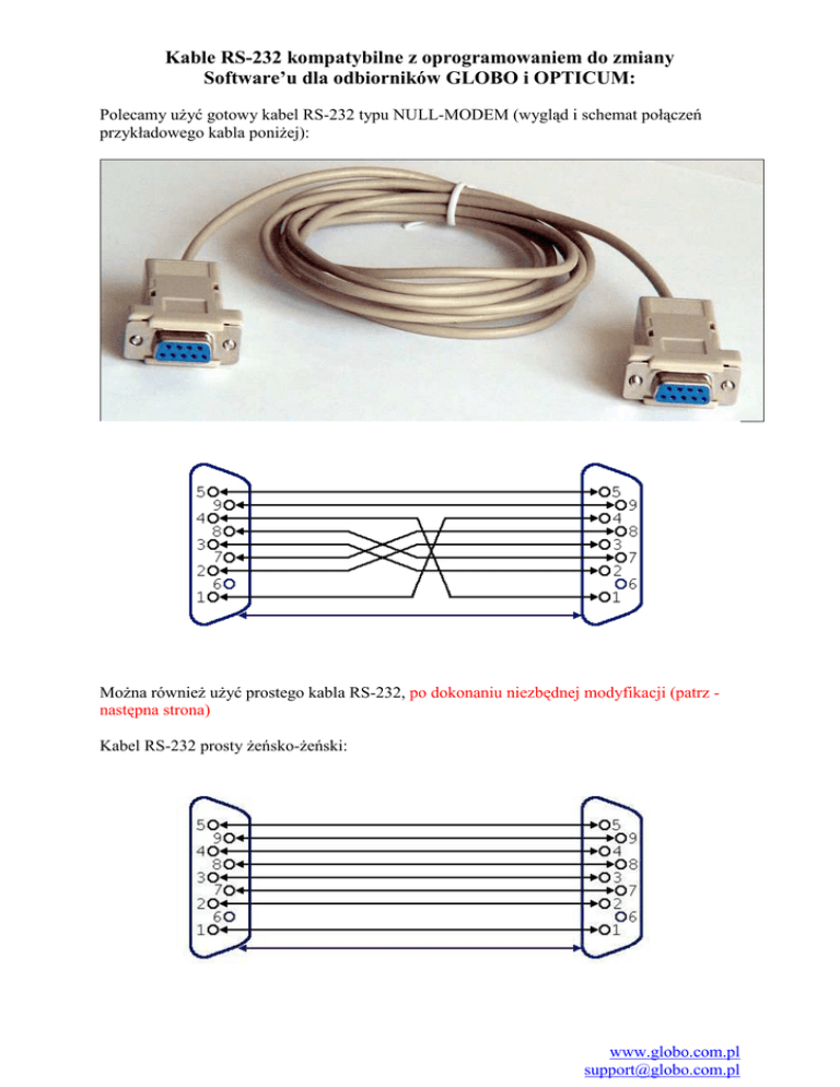 Kable RS-232 kompatybilne z oprogramowaniem do zmiany Software’u dla odbiorników GLOBO i OPTICUM: Polecamy uŜyć gotowy kabel RS-232 typu NULL-MODEM (wygląd i schemat połączeń przykładowego kabla poniŜej): MoŜna równieŜ uŜyć prostego kabla RS-232, po dokonaniu niezbędnej modyfikacji (patrz następna strona) Kabel RS-232 prosty Ŝeńsko-Ŝeński: www.globo.com.pl [email protected] Opis poszczególnych sygnałów: 1. Carrier Detect 2. Rx – Recieve Data 3. Tx – Transmit Data 4. Data Terminal Ready 5. System Ground 6. Data Set To Ready 7. Request To Send 8. Clear To Send Do programowania odbiorników Opticum wystarczy zamienić w jednej końcówce przewód 2 z przewodem 3 (moŜna rozłączyć inne nieuŜywane przewody – naleŜy to zrobić w taki sposób aby nie stykały się z obudową ani z kablami uŜywanymi do transmisji danych): Wygląd kabla po wykonaniu przeplotu: lub: UWAGA!!! Przerabianie kabla RS-232 wymaga wiedzy w dziedzinie elektroniki. JeŜeli nie umiesz odczytać schematu bądź lutować, uŜyj gotowego kabla polecanego przez sprzedawcę. www.globo.com.pl [email protected]