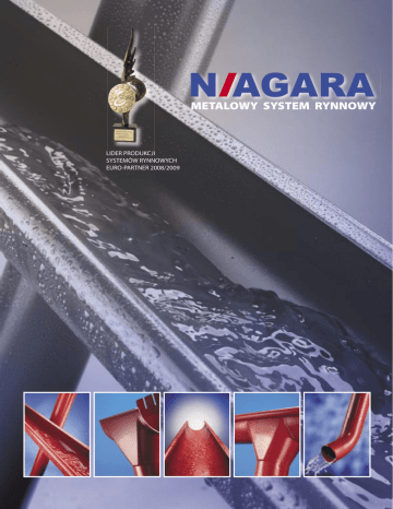 METALOWY SYSTEM RYNNOWY LIDER PRODUKCJI SYSTEMÓW RYNNOWYCH EURO-PARTNER 2008/2009 Schemat systemu hak długi hak długi z balszką narożnik wewnętrzny 90º hak długi pod wulstę hak combi plus hak długi denko uniwersalne hak długi hak longer hak combi rynna złączka rynny denko głębokie narożnik zewnętrzny 90º śruba do obejmy narożnik wewnętrzny 135º sztucer kolanko 60º lakier zaprawkowy Zastosowanie narożnik zewnętrzny 135º Wybór systemu Głównym zadaniem systemu rynnowego jest odprowadzenie kompletnym systemem odwadniania – idealnym dla każdego wód opadowych z dachu. Od jego powierzchni uzależniona dachu, przeznaczony jest dla nowych jak i remontowanych jest wielkość rynny i ilość punktów odprowadzających, jaką budynków bez względu na rodzaj pokrycia. należy zastosować. W chwili obecnej dostępnych jest osiem kolorów System dostępny jest w dwóch rozmiarach: systemu do koloru pokrycia dachu. Kolorystyka podstawowych umożliwiających dopasowanie ► rynna 125 i rura 90 mm ► brąz RAL 8017 ► rynna 150 i rura 100 mm ► cegła RAL 8004 Elementy systemu produkowane są ze stali najwyższej jakości, Poniższy rysunek ułatwi Państwu dobór odpowiedniego ► grafit RAL 7024 ocynkowanej powlekanej obustronnie poliuretanem (50 systemu - więcej informacji znajdziecie Państwo w instrukcji ► wiśnia RR 028 montażu. ► biały RAL 9010 Dzięki zastosowaniu takich materiałów mamy pewność, że 2 na działanie czynników atmosferycznych. jak również utratę kolorów w porównaniu z powszechnie obejma rury spustowej wylewka ► srebrny RAL 9006 2 stosowanym PLASTISOLEM. RAL 8004 RR 028 RAL 8017 RAL 9010 RAL 7024 RAL 9005 RAL 8023 system 125 / 90 2 POLIURETAN 50 µm podkład łapacz deszczówki ► złoty RAL 8023 uzyskujemy stabilność kolorów, a także wysoką odporność Poliuretan cechuje bardzo duża odporność na korozję łącznik rury spustowej rura spustowa ► czarny RAL 9005 ). blaszka do obejmy mufa System rynien stalowych proponowany przez naszą firmę jest Materiał trójnik RAL 9006 haki rynnowe, złączka rynnowa, obejma, oraz narożniki 135º - zewnętrzny i wewnętrzny malowane są proszkowo w kolorze odpowiadającym pozostałym elementom systemu. Ze względu na technikę druku powyższa kolorystyka odbiega od rzeczywistości. 2 RYNNY NI AGARA TYTAN CYNK Już bardziej tradycyjnie nie będzie ... blacha stalowa system 150 / 100 cynk pasywacja System dostępny również w materiale RYNNY NIAGARA TYTAN CYNK Układ warstw zabezpieczających 2 METALOWY SYSTEM RYNNOWY METALOWY SYSTEM RYNNOWY 3 Elementy systemu rynna rozmiar długość 125/150 2 mb 3 mb Znajdujący się w ofercie zestaw orynnowania pozwala 4 mb na zastosowanie go praktycznie do każdego budynku. hak długi, hak długi pod wulstę, hak długi z blaszką Zastosowanie poliuretanu System opracowany był z myślą o wysokich walorach parametry użytkowe (wysoka stalowych jest ich wysoka oporność korozyjna oraz trwałość odporność na uszkodzenia 125 125 210 mm 150 210 mm cej, która posiada doskonałe Niewątpliwą zaletą powlekanych rynien rozmiar długość jako powłoki zabezpieczają- użytkowych, jak i prostocie montażu. narożnik wewnętrzny 90º rozmiar koloru) powoduje niezawodność mechaniczne. 150 przez długie lata. hak longer, hak longer pod wulstę, hak longer z blaszką Oferowane rynny są głębsze w związku z czym są w stanie odebrać rozmiar długość 125 320 mm 150 320 mm więcej wód opadowych bez obawy przed narożnik zewnętrzny 90º przelewaniem. Haki combi umożliwiają montaż systemu bez rozmiar konieczności demontażu pokrycia. 125 rura spustowa Połączenia rynien ze sobą oraz narożnikami 150 odbywają się przy pomocy złączki rynnowej średnica długość 90 1 mb 100 3 mb 4 mb z uszczelką i nie wymagają dodatkowych uszczelnień. narożnik wewnętrzny 135º Prostota i łatwość montażu została wielokrotnie potwierdzona przez rozmiar łącznik rury spustowej wykonawców. 125 150 narożnik zewntęrzny 135º średnica długość 90 0,5 mb 100 0,5 mb sztucer rozmiar rozmiar 125 125/90 150 150/100 złączka rynny trójnik rozmiar 125 150 hak combi średnica długość 90 335 mm 100 335 mm obejma rury spustowej rozmiar 125 średnica 150 90 100 hak combi plus blaszka do obejmy rozmiar 125 4 METALOWY SYSTEM RYNNOWY METALOWY SYSTEM RYNNOWY 5 śruba do obejmy długość Bezpieczeństwo 100 mm Metalowy system rynnowy NIAGARA produkowany jest zgodnie z normą PN-EN 612:2006, 160 mm która określa wymagania jakie powinny spełniać rynny i rury spustowe z blach. 200 mm Specjalnym wymaganiom podlegają haki rynnowe, które pełnią rolę nośną dla całego systemu 250 mm mufa rozmiar 125 150 - wymagania dla uchwytów rynnowych określa norma PN-EN 1462:2006. W związku z tym, haki nasze zostały poddane badaniu nośności, które polega na obciążeniu rozmieszczonych od siebie w odległości 1180 mm uchwytów obciążeniem 750 N. Odkształcenie trwałe po zdjęciu obciążenia nie mogło wynosić więcej niż 5 mm. Największe odkształcenie dla haków systemu NIAGARA wyniosło 0,75 mm. Na podstawie przeprowadzonych badań stwierdzono, że wszystkie uchwyty rynnowe (hak krótki, hak długi i hak combi) denko rynny uniwerslane dla obydwu systemów 125 i 150 spełniają wymagania najwyższej klasy - H. rozmiar 125 150 denko rynny głębokie rozmiar 125 Stanowisko badawcze 150 w Instytucie Techniki Budowlanej. Rozstaw haków - 1180 mm kolanko 60º obciążenie - 750 N średnica deklaracja zgodności nr 1/2008 - Rynny, rury spustowe i kształtki 90 100 łapacz deszczówki deklaracja zgodności nr 2/2008 Haki rynnowe rozmiar 90 100 Deklaracje i gwarancja System rynnowy NIAGARA dopuszczony jest do obrotu wylewka 60º średnica 90 100 na podstawie wystawianych przez producenta deklaracji zgodności: ► deklaracja zgodności nr 1/2008 - Rynny dachowe z blachy stalowej powlekanej powłoką organiczną - poliuretan 50 ► deklaracja zgodnoś