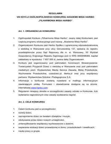 REGULAMIN VIII EDYCJI OGÓLNOPOLSKIEGO KONKURSU AKADEMII MISIA HARIBO „FILHARMONIA MISIA HARIBO” Art. 1. ORGANIZACJA KONKURSU 1. Ogólnopolski Konkurs „Filharmonia Misia Haribo”, zwany dalej Konkursem, jest częścią programu edukacyjnego pod nazwą: „Akademia Misia Haribo”. 2. Organizatorem Konkursu jest Haribo Spółka z ograniczoną odpowiedzialnością z siedzibą w Warszawie przy ulicy Górczewskiej 137, wpisana do rejestru przedsiębiorców przez Sąd Rejonowy dla m. st. Warszawy, XII Wydział Gospodarczy Krajowego Rejestru Sądowego pod nr KRS 0000098069, kapitał zakładowy w wysokości 7 657 000 zł, zwana dalej Organizatorem. 3. Konkurs jest organizowany pod patronatem honorowym Stowarzyszenia: Towarzystwo Przyjaciół Dzieci z siedzibą w Warszawie oraz pod patronatem medialnym pism: Wydawnictwo Media Service Zawada, Bliżej Przedszkola, Wychowanie Przedszkolne, czasdzieci.pl, literka.pl oraz przy współpracy partnera: Wydawnictwa Szkolne i Pedagogiczne S.A. 4. Informacje o konkursie zostaną rozesłane w mailingu informacyjnym zawierającym ulotkę. Formularz i oświadczenie dostępne są na stronie internetowej www.haribo.com 5. Regulamin niniejszy określa w szczególności zasady udziału w Konkursie, tryb wyłaniania nagrodzonych oraz zasady wydawania nagród. Art. 2. CELE KONKURSU 1. Celem konkursu jest w szczególności: • rozwój dzieci, • zaznajomienie dzieci ze światem dźwięków i muzyki, • zdobywanie przez dzieci nowych umiejętności, • zintensyfikowanie współpracy wychowawców z dziećmi, • wspieranie edukacji dzieci prowadzonej w domu, przedszkolach i świetlicach; • nauka pracy w grupie. Art. 3. UCZESTNICTWO W KONKURSIE Konkurs skierowany jest do wszystkich przedszkoli publicznych i niepublicznych działających na terenie Rzeczypospolitej Polskiej, zgłoszonych do udziału w Konkursie w sposób wskazany w niniejszym Regulaminie, zwanych dalej Uczestnikami. Art. 4. HARMONOGRAM KONKURSU 1. Konkurs rozpoczyna się w dniu 11 października 2010 roku i trwa do 22 listopada 2010 roku, co oznacza, że w tym terminie (decyduje data stempla pocztowego) Uczestnicy mogą nadsyłać prace konkursowe wraz z wypełnionym formularzem zgłoszeniowym, który jest do pobrania ze strony internetowej www.haribo.com w dziale Akademii Misia Haribo, zakładka „Dla przedszkoli”. 2. Lista laureatów zostanie ogłoszona na stronie internetowej www.haribo.com w zakładce Akademia Misia Haribo do dnia 30 listopada 2010 roku. 3. Nagrody zostaną przesłane zwycięzcom do dnia 31 grudnia 2010 roku. Art. 5. PRZEDMIOT KONKURSU. ETAPY KONKURSU. 1. Zadanie konkursowe (zwane dalej Praca) polega na przeprowadzeniu z przedszkolakami zajęć dydaktycznych, których celem jest zaznajomienie dzieci ze światem dźwięków i muzyki poprzez stwierdzenie prostych instrumentów muzycznych z dostępnych powszechnie przedmiotów, „skomponowanie” etiudy dźwiękowej z wykorzystaniem przygotowanych własnoręcznie instrumentów, przeprowadzenie zajęć dydaktycznych z dziećmi w tym zakresie, a następnie prezentacji efektów pracy przed publicznością złożoną z rodziców i opiekunów dzieci, co zostanie zarejestrowane w formie reportażu, wg zasad wskazanych w niniejszym Regulaminie poniżej. 2. Poszczególne etapy przygotowania prac konkursowych: 2.1. Etap I – Tworzenie instrumentów muzycznych a) Każde dziecko uczestniczące w konkursie Filharmonia Misia Haribo powinno zostać poproszone podczas zajęć przedszkolnych o przyniesienie z domu dowolnego przedmiotu za pomocą, którego można wytworzyć dźwięk. Wychowawca przedszkolny powinien zaznaczyć, iż przyniesiony z domu przedmiot nie może być prawdziwym instrumentem muzycznym. Dzieciom pozostawia się całkowitą dowolność w wyborze rzeczy, która ma służyć do dalszej zabawy. b) Po przyniesieniu do przedszkola wybranych przedmiotów dzieci proszone są o krótkie ich zaprezentowanie przed grupą kolegów i koleżanek. Dzieci powinny opisać znalezione przedmioty i zaprezentować sposoby jakie wymyśliły, aby zaprezentowany przedmiot mógł „zagrać”. Przedszkolaków można poprosić również o poszukanie alternatywnych pomysłów na wydobywanie dźwięków z przedmiotów przyniesionych przez koleżanki i kolegów. c) W trakcie zajęć plastycznych dzieci mogą przetworzyć znalezione przez siebie przedmioty w nietypowe i oryginalne instrumenty muzyczne, udekorować je zgodnie ze swoją fantazją lub wymyślić dla nich nazwy. Dekoracje plastyczne dzieci mogą znaleźć na stronie internetowe www.haribo.com w zakładce Akademia Misia Haribo. 2.2. Etap II – Przygotowanie występu • Gdy instrumenty są już gotowe (udekorowane) dzieci wspólnie z wychowawcą przedszkolnym lub nauczycielem rytmiki rozpoczynają próby do krótkiego przedstawienia. • Zadaniem dzieci w czasie występu jest prezentacja wykonanych przez siebie instrumentów oraz sposobów wydobywania z nich dźwięków. • Podczas przedstawienia dzieci mogą również zaśpiewać piosenkę, zarecytować nauczone wcześniej wiersze lub w inny sposób zaprezentować swoje umiejętności twórcze. • Prezentacja instrumentów powinna odbywać się formie krótkiej etiudy, w trakcie której dzieci odtwarzają dźwięki w określonych sekwencjach czasowych. • Zadaniem nauczyciela jest wymyślenie tytułu dla przedstawienia. 2.3. Etap III – Zaproszenie rodziców i opiekunów Po zakończonym etapie prób, gdy przedstawienie jest już gotowe, dzieci proszone są o wykonanie zaproszeń na występ dla rodziców i opiekunów. W tym celu można wykorzystać gotowe wzory zaproszeń przygotowane przez organizatorów konkursu Akademii Misia Haribo „Filharmonia Misia Haribo ” dostępne na stronie internetowej www.haribo.com 2.4. Etap IV – Prezentacja przedstawienia a) Dzieci prezentują efekty swojej pracy podczas przedstawienia odgrywanego przed zaproszonymi rodzicami i opiekunami. b) Występ dzieci powinien zostać udokumentowan