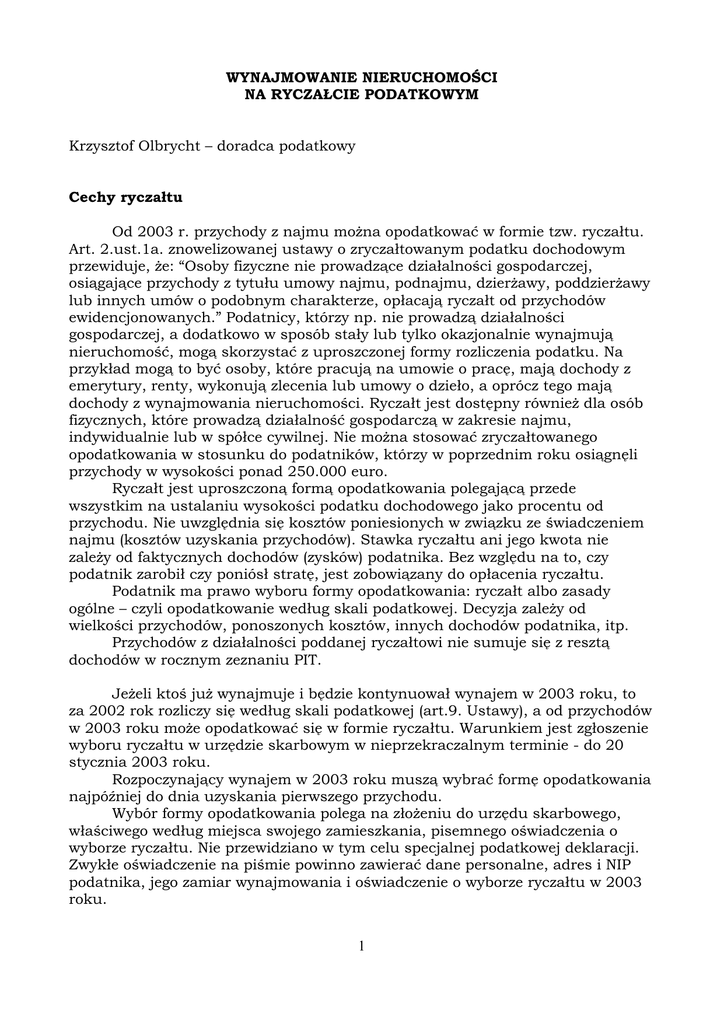 WYNAJMOWANIE NIERUCHOMOŚCI NA RYCZAŁCIE PODATKOWYM Krzysztof Olbrycht – doradca podatkowy Cechy ryczałtu Od 2003 r. przychody z najmu można opodatkować w formie tzw. ryczałtu. Art. 2.ust.1a. znowelizowanej ustawy o zryczałtowanym podatku dochodowym przewiduje, że: “Osoby fizyczne nie prowadzące działalności gospodarczej, osiągające przychody z tytułu umowy najmu, podnajmu, dzierżawy, poddzierżawy lub innych umów o podobnym charakterze, opłacają ryczałt od przychodów ewidencjonowanych.” Podatnicy, którzy np. nie prowadzą działalności gospodarczej, a dodatkowo w sposób stały lub tylko okazjonalnie wynajmują nieruchomość, mogą skorzystać z uproszczonej formy rozliczenia podatku. Na przykład mogą to być osoby, które pracują na umowie o pracę, mają dochody z emerytury, renty, wykonują zlecenia lub umowy o dzieło, a oprócz tego mają dochody z wynajmowania nieruchomości. Ryczałt jest dostępny również dla osób fizycznych, które prowadzą działalność gospodarczą w zakresie najmu, indywidualnie lub w spółce cywilnej. Nie można stosować zryczałtowanego opodatkowania w stosunku do podatników, którzy w poprzednim roku osiągnęli przychody w wysokości ponad 250.000 euro. Ryczałt jest uproszczoną formą opodatkowania polegającą przede wszystkim na ustalaniu wysokości podatku dochodowego jako procentu od przychodu. Nie uwzględnia się kosztów poniesionych w związku ze świadczeniem najmu (kosztów uzyskania przychodów). Stawka ryczałtu ani jego kwota nie zależy od faktycznych dochodów (zysków) podatnika. Bez względu na to, czy podatnik zarobił czy poniósł stratę, jest zobowiązany do opłacenia ryczałtu. Podatnik ma prawo wyboru formy opodatkowania: ryczałt albo zasady ogólne – czyli opodatkowanie według skali podatkowej. Decyzja zależy od wielkości przychodów, ponoszonych kosztów, innych dochodów podatnika, itp. Przychodów z działalności poddanej ryczałtowi nie sumuje się z resztą dochodów w rocznym zeznaniu PIT. Jeżeli ktoś już wynajmuje i będzie kontynuował wynajem w 2003 roku, to za 2002 rok rozliczy się według skali podatkowej (art.9. Ustawy), a od przychodów w 2003 roku może opodatkować się w formie ryczałtu. Warunkiem jest zgłoszenie wyboru ryczałtu w urzędzie skarbowym w nieprzekraczalnym terminie - do 20 stycznia 2003 roku. Rozpoczynający wynajem w 2003 roku muszą wybrać formę opodatkowania najpóźniej do dnia uzyskania pierwszego przychodu. Wybór formy opodatkowania polega na złożeniu do urzędu skarbowego, właściwego według miejsca swojego zamieszkania, pisemnego oświadczenia o wyborze ryczałtu. Nie przewidziano w tym celu specjalnej podatkowej deklaracji. Zwykłe oświadczenie na piśmie powinno zawierać dane personalne, adres i NIP podatnika, jego zamiar wynajmowania i oświadczenie o wyborze ryczałtu w 2003 roku. 1 Jeżeli Wynajmujący chce się rozliczać w 2003 r. według skali podatkowej, nie musi zawiadamiać urzędu skarbowego. Po prostu płaci zaliczki na podatek dochodowy i składa miesięczną deklarację PIT-5. Stawki ryczałtu Stawka dla wynajmu wynosi 8,5% od przychodu. Obowiązuje ona dopóty, dopóki podatnik nie przekroczy przychodu 4.000 EURO z wynajmowania nieruchomości. Po przekroczeniu limitu w ciągu roku od nadwyżki stosuje się stawkę ryczałtu 20%. Kwota limitu rocznego jest ustalana na podstawie kursu średniego EURO ogłaszanego przez NBP, obowiązującego w dniu 1 października poprzedniego roku. W 2003 r. kwota limitu, do której stosuje się stawkę 8,5 % wynosi 16.366 zł. Stawka ryczałtu z tytułu wynajmu w ramach działalności gospodarczej wynosi 17%. Obowiązki podatnika W przypadku najmu nie prowadzi się ewidencji przychodów, jeśli z umowy najmu wynika miesięczna kwota czynszu (art.15.ust.3. Ustawy). Zgodnie z art.21. ustawy, wynajmujący powinien samodzielnie w każdym miesiącu obliczać ryczałt podatkowy i wpłacać jego kwotę na konto swojego urzędu skarbowego. Podatek za dany miesiąc trzeba wpłacać do 20-go dnia następnego miesiąca. Zgodnie z art.11.ust.1. ustawy z 26.07.1991 r. o podatku dochodowym od osób fizycznych, przychód do opodatkowania powstaje w chwili otrzymania lub postawienia do dyspozycji Wynajmującego kwoty czynszu. Jeżeli czynsz będzie zapłacony z góry za cały rok podatkowy, przychód podatkowy powstanie w dacie zapłaty czynszu. Niektóre urzędy skarbowe stoją na stanowisku, że przychód do opodatkowania z wynajmu powstaje w dacie wynikającej z umowy najmu, niezależnie od daty otrzymania zapłaty. Takie stanowisko nie ma podstawy w przepisach prawnych. W terminie do 31.01.2004 roku trzeba będzie złożyć zeznanie roczne PIT-28 za 2003 rok. Nie składa się miesięcznych deklaracji podatkowych. Dokumentacja przy opodatkowaniu ryczałtem jest uproszczona. Nie trzeba prowadzić skomplikowanej księgowości. Wymagane jest przede wszystkim prowadzenie ewidencji kwoty faktycznie otrzymanych przychodów. Ewidencja nie jest konieczna, jeżeli podatnik dysponuje pisemną umową najmu i nie prowadzi najmu w ramach działalności gospodarczej. Gdy wynajmują małżonkowie Często jest tak, że właścicielami wynajmowanego lokalu lub nieruchomości są małżonkowie na zasadzie majątkowej wspólności małżeńskiej. W tej sytuacji każdy z małżonków jest podatnikiem i osiąga 50% przychodu z kwoty czynszu najmu. Małżonkowie mogą wybrać ryczałt. Wówczas przysługuje im wspólny limit obrotów w wysokości 4.000 EURO, od którego zależy wyższa (20%) stawka ryczałtu (art. 12. ust. 5-6, ust.11. ustawy). Limit dla każdego z nich 2 wyniesie po 2.000 EURO. Każdy z małżonków zapłaci podatek ryczałtowy od połowy przychodu i złoży osobno roczną deklarację PIT -28. Małżonkowie mogą złożyć w urzędzie wspólne pisemne oświadczenie, że jeden z nich rozliczy całą kwotę przychodu z najmu. Wówczas tylko ten jeden małżonek złoży roczny PIT -28. Decyzję taką