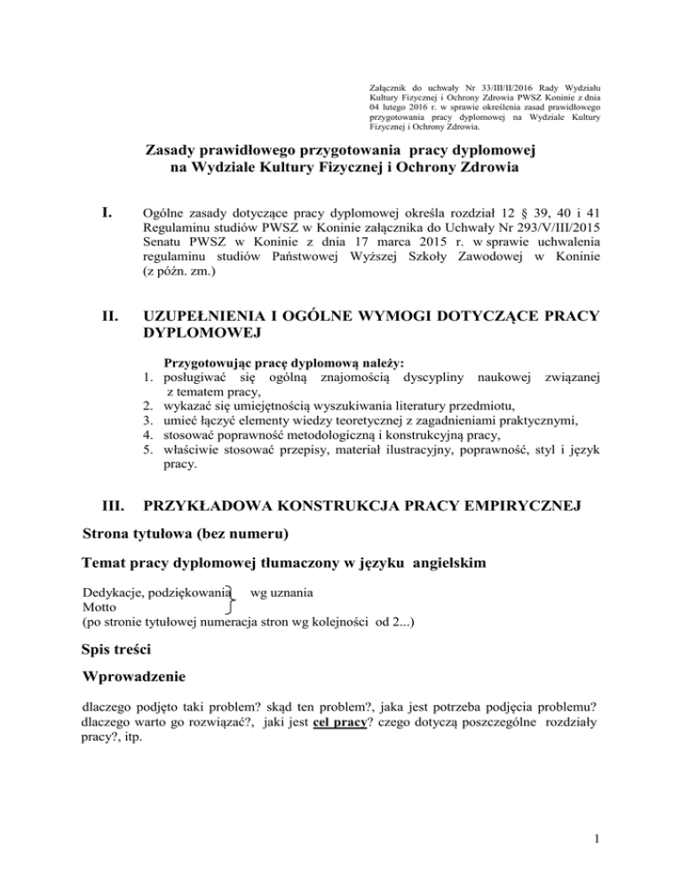 Załącznik do uchwały Nr 33/III/II/2016 Rady Wydziału Kultury Fizycznej i Ochrony Zdrowia PWSZ Koninie z dnia 04 lutego 2016 r. w sprawie określenia zasad prawidłowego przygotowania pracy dyplomowej na Wydziale Kultury Fizycznej i Ochrony Zdrowia. Zasady prawidłowego przygotowania pracy dyplomowej na Wydziale Kultury Fizycznej i Ochrony Zdrowia I. Ogólne zasady dotyczące pracy dyplomowej określa rozdział 12 § 39, 40 i 41 Regulaminu studiów PWSZ w Koninie załącznika do Uchwały Nr 293/V/III/2015 Senatu PWSZ w Koninie z dnia 17 marca 2015 r. w sprawie uchwalenia regulaminu studiów Państwowej Wyższej Szkoły Zawodowej w Koninie (z późn. zm.) II. UZUPEŁNIENIA I OGÓLNE WYMOGI DOTYCZĄCE PRACY DYPLOMOWEJ Przygotowując pracę dyplomową należy: 1. posługiwać się ogólną znajomością dyscypliny naukowej związanej z tematem pracy, 2. wykazać się umiejętnością wyszukiwania literatury przedmiotu, 3. umieć łączyć elementy wiedzy teoretycznej z zagadnieniami praktycznymi, 4. stosować poprawność metodologiczną i konstrukcyjną pracy, 5. właściwie stosować przepisy, materiał ilustracyjny, poprawność, styl i język pracy. III. PRZYKŁADOWA KONSTRUKCJA PRACY EMPIRYCZNEJ Strona tytułowa (bez numeru) Temat pracy dyplomowej tłumaczony w języku angielskim Dedykacje, podziękowania wg uznania Motto (po stronie tytułowej numeracja stron wg kolejności od 2...) Spis treści Wprowadzenie dlaczego podjęto taki problem? skąd ten problem?, jaka jest potrzeba podjęcia problemu? dlaczego warto go rozwiązać?, jaki jest cel pracy? czego dotyczą poszczególne rozdziały pracy?, itp. 1 Rozdział 1. Tytuł dotyczący głównego problemu pracy (tzw. rozdział teoretyczny) w podrozdziałach np.: wprowadzenie w podjęty problem, tło teoretyczne problemu, charakterystyka problemu i jego głównych uwarunkowań, co wiadomo dotychczas na temat problemu? kto się nim zajmował? co jeszcze w tym zakresie warto zbadać i dlaczego?, itp. Rozdział 2. Metodologia badań własnych (tzw. rozdział metodologiczny) w podrozdziałach np.: problem badawczy- czego dokładnie dotyczy problem badań własnych?, bardziej szczegółowe cele badań- np. określenie związku między…., badane zmienne (czynniki), pytania i hipotezy badawcze, materiał badawczy, metody badań, schemat analizy danych, itp. Rozdział 3. Analiza wyników badań Rozdział 4. Dyskusja i wnioski końcowe (albo: Podsumowanie i wnioski końcowe) w podrozdziałach np.: weryfikacja hipotez i dyskusja nad wynikami badań, w której autor może rozważyć następujące kwestie: które z hipotez uzyskały potwierdzenie w wynikach badań, a które z nich nie uzyskały i dlaczego? jak się mają wyniki badań własnych do wyników badań innych autorów? co ukazują badania własne ?, co wynika z pracy dla praktyki? (potencjalne obszary i możliwości zastosowań), wnioski końcowe, itp. Piśmiennictwo tylko to które wykorzystywano w tekście pracy, podane wg spisu alfabetycznego Streszczenie pracy + słowa kluczowe (w języku polskim oraz w języku angielskim) Załączniki: 1. narzędzia stosowane w badaniach (jeżeli są konstrukcji własnej lub dostępne dla użytku publicznego za zgoda autora), 2. tabele z wynikami w formie podsumowania. W zakresie formalnej struktury pracy (tj. rozdziały) dopuszcza się możliwość innej konstrukcji pracy dyplomowej, którą określa promotor w zależności od dyscypliny naukowej, z zakresu której praca jest pisana. 2 KRYTERIA FORMALNE DOTYCZĄCE TEKSTU PRACY IV. 1. marginesy w pracy: dolny i górny -2,5 cm; lewy- 3,5 cm; prawy- 2,5 cm, 2. odstęp między wierszami (interlinia):1,5, 3. czcionka: Times New Roman, 4. Rozmiar czcionki: 12 pkt, 5. włączone justowanie (nie musi być dzielenia wyrazów), 6. nowy akapit – wcięcie: 1,25, 7. każdy rozdział powinien rozpoczynać się od nowej strony, 8. podrozdziały powinny znajdować się na tej samej stronie, 9. numerowanie stron (w prawym dolnym rogu strony), 10. wyrazy i zwroty wymagające uwypuklenia wyróżnione pogrubieniem, 11. niczego innego nie podkreślać ani nie pogrubiać w tekście, 12. wyrazy pochodzenia obcego wyróżniamy kursywą, 13. tytuły rozdziałów: czcionka: 16 pkt i bold (pogrubiony), kropki tylko po cyfrach np.: Rozdział 1. Rozwój sportowy młodzieży (bez kropki na końcu), 14. wszystkie inne tytuły podrozdziałów 14 pkt i bold np. 1.1. Wprowadzenie. 1.1.1. Wykład z psychologii......, 15. przed i po każdym tytule podrozdziału 1 wiersz przerwy, 16. każda rycina i tabela powinna mieć numer, tytuł i źródło (jeśli nie jest materiałem autorskim) np. Źródło: opracowano na podstawie: Osiński (2000, s.71) (bez kropki), 17. podając źródło piszemy czcionką 10 pkt, 18. w tekście należy odsyłać do rycin i tabel np. Jak pokazuje Rycina 1…, albo: Z danych zamieszczonych w Tabeli 51 wynika, że..., 19. numeracja rycin i tabel nie uwzględnia numeracji rozdziałów i podrozdziałów , jest to numeracja ciągła przez cały tekst pracy od 1 do n, 20. rysunek, ilustrację oraz wykres określamy jako rycinę, przykładowy opis ryciny: Rycina 9. Profile badanych zdolności motorycznych w grupie kobiet i mężczyzn (bez kropki, czcionka nr 11), 21. przykład opisu tabeli i ryciny w aspekcie całościowym: tytuł powinien znajdować się nad tabelą oraz pod ryciną, 3 Tabela 25 . Obszary zastosowań…(czcionka 11 pkt) (bez kropki na końcu) Źródło: opracowano na podstawie: Nowak (1999, s.25) (bez kropki, czcionka 10 pkt) Rycina 14. Profile zdolności motorycznych…( bez kropki, czcionka 11 pkt) Źródło: opracowano na podstawie: Nowak (1999, s.25) (bez kropki, czcionka 10 pkt) Proponowana objętość pracy (praca teoretyczna) Całość 45 - 55 stron Proponowana objętość pracy empirycznej (badawczej) Wprowadzenie Rozdział 1. Problem Rozdział 2. Metoda Rozdział 3. Wyniki Podsumowanie i wnioski końcowe Piśmiennictwo, Załączniki Całość 2 strony 5- 10 stron 5 - 8 stron 5- 10 s