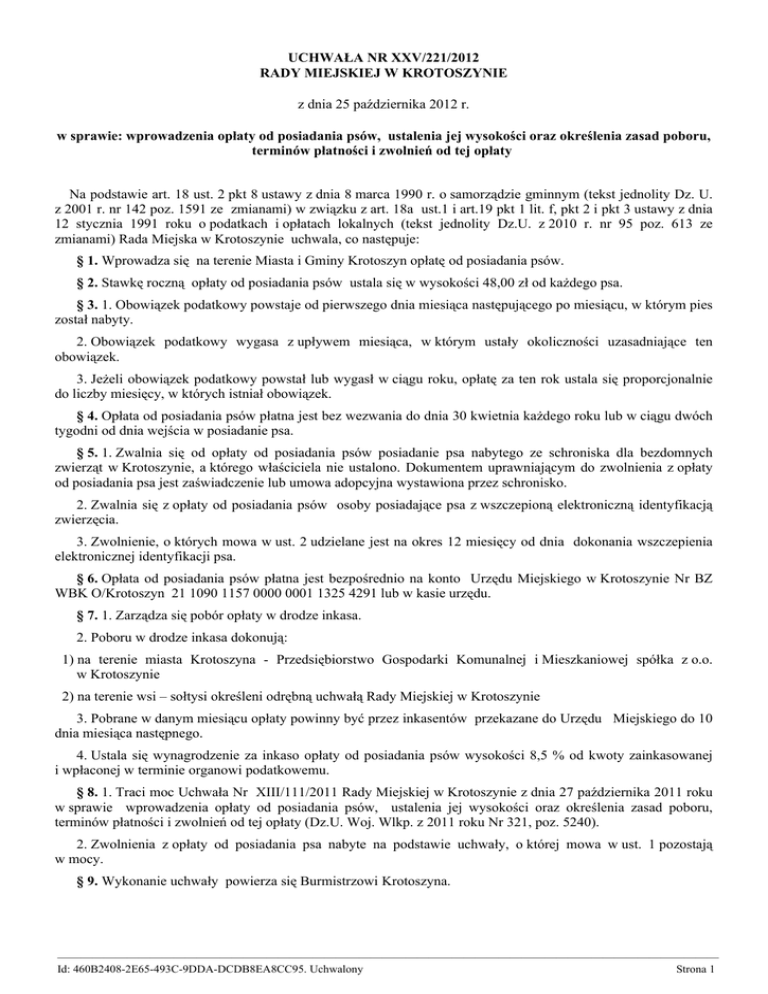 UCHWAŁA NR XXV/221/2012 RADY MIEJSKIEJ W KROTOSZYNIE z dnia 25 października 2012 r. w sprawie: wprowadzenia opłaty od posiadania psów, ustalenia jej wysokości oraz określenia zasad poboru, terminów płatności i zwolnień od tej opłaty Na podstawie art. 18 ust. 2 pkt 8 ustawy z dnia 8 marca 1990 r. o samorządzie gminnym (tekst jednolity Dz. U. z 2001 r. nr 142 poz. 1591 ze zmianami) w związku z art. 18a ust.1 i art.19 pkt 1 lit. f, pkt 2 i pkt 3 ustawy z dnia 12 stycznia 1991 roku o podatkach i opłatach lokalnych (tekst jednolity Dz.U. z 2010 r. nr 95 poz. 613 ze zmianami) Rada Miejska w Krotoszynie uchwala, co następuje: § 1. Wprowadza się na terenie Miasta i Gminy Krotoszyn opłatę od posiadania psów. § 2. Stawkę roczną opłaty od posiadania psów ustala się w wysokości 48,00 zł od każdego psa. § 3. 1. Obowiązek podatkowy powstaje od pierwszego dnia miesiąca następującego po miesiącu, w którym pies został nabyty. 2. Obowiązek podatkowy wygasa z upływem miesiąca, w którym ustały okoliczności uzasadniające ten obowiązek. 3. Jeżeli obowiązek podatkowy powstał lub wygasł w ciągu roku, opłatę za ten rok ustala się proporcjonalnie do liczby miesięcy, w których istniał obowiązek. § 4. Opłata od posiadania psów płatna jest bez wezwania do dnia 30 kwietnia każdego roku lub w ciągu dwóch tygodni od dnia wejścia w posiadanie psa. § 5. 1. Zwalnia się od opłaty od posiadania psów posiadanie psa nabytego ze schroniska dla bezdomnych zwierząt w Krotoszynie, a którego właściciela nie ustalono. Dokumentem uprawniającym do zwolnienia z opłaty od posiadania psa jest zaświadczenie lub umowa adopcyjna wystawiona przez schronisko. 2. Zwalnia się z opłaty od posiadania psów osoby posiadające psa z wszczepioną elektroniczną identyfikacją zwierzęcia. 3. Zwolnienie, o których mowa w ust. 2 udzielane jest na okres 12 miesięcy od dnia dokonania wszczepienia elektronicznej identyfikacji psa. § 6. Opłata od posiadania psów płatna jest bezpośrednio na konto Urzędu Miejskiego w Krotoszynie Nr BZ WBK O/Krotoszyn 21 1090 1157 0000 0001 1325 4291 lub w kasie urzędu. § 7. 1. Zarządza się pobór opłaty w drodze inkasa. 2. Poboru w drodze inkasa dokonują: 1) na terenie miasta Krotoszyna - Przedsiębiorstwo Gospodarki Komunalnej i Mieszkaniowej spółka z o.o. w Krotoszynie 2) na terenie wsi – sołtysi określeni odrębną uchwałą Rady Miejskiej w Krotoszynie 3. Pobrane w danym miesiącu opłaty powinny być przez inkasentów przekazane do Urzędu Miejskiego do 10 dnia miesiąca następnego. 4. Ustala się wynagrodzenie za inkaso opłaty od posiadania psów wysokości 8,5 % od kwoty zainkasowanej i wpłaconej w terminie organowi podatkowemu. § 8. 1. Traci moc Uchwała Nr XIII/111/2011 Rady Miejskiej w Krotoszynie z dnia 27 października 2011 roku w sprawie wprowadzenia opłaty od posiadania psów, ustalenia jej wysokości oraz określenia zasad poboru, terminów płatności i zwolnień od tej opłaty (Dz.U. Woj. Wlkp. z 2011 roku Nr 321, poz. 5240). 2. Zwolnienia z opłaty od posiadania psa nabyte na podstawie uchwały, o której mowa w ust. 1 pozostają w mocy. § 9. Wykonanie uchwały powierza się Burmistrzowi Krotoszyna. ————————————————————————————————————————————————————————— Id: 460B2408-2E65-493C-9DDA-DCDB8EA8CC95. Uchwalony Strona 1 § 10. Uchwała podlega ogłoszeniu w Dzienniku Urzędowym Województwa Wielkopolskiego i wchodzi w życie z dniem 1 stycznia 2013 roku. Przewodnicząca Rady Zofia Jamka ————————————————————————————————————————————————————————— Id: 460B2408-2E65-493C-9DDA-DCDB8EA8CC95. Uchwalony Strona 2 Uzasadnienie Zgodnie z treścią art. 20 ust. 1 ustawy z dnia 12 stycznia 1991 roku o podatkach i opłatach lokalnych (tekst jednolity Dz. U. z 2006 r. Nr 121 poz. 844 ze zmianami ) górne granice stawek kwotowych określonych w ustawie o podatkach i opłatach lokalnych ulegają corocznie podwyższeniu na następny rok podatkowy w stopniu odpowiadającym wskaźnikowi wzrostu cen detalicznych towarów i usług konsumpcyjnych w okresie pierwszych trzech kwartałów roku, w którym stawki ulegają podwyższeniu, w stosunku do analogicznego okresu roku poprzedniego. Obwieszczeniem z dnia 2 sierpnia 2012 roku Minister Finansów dokonał podwyższenia górnych granic stawek o wskaźnik inflacji, który wynosi 4 % (opublikowany w Monitorze Polskim z 2012 poz. 587). Stawka opłaty od posiadania psa po uwzględnianiu w/w wskaźnika nie może przekroczyć kwoty 119,93 zł rocznie od jednego psa. Projekt niniejszej uchwały przedstawia podwyżkę stawki opłaty za psa z kwoty 42,00 zł do kwoty 48,00 zł, co w przeliczeniu na miesiące stanowi 4,00 zł opłaty od psa za każdy miesiąc, tj o wzrost o 14,29 % w stosunku do roku 2012. Proponowana stawka 48,00 zł stanowi 40,03 % stawki maksymalnej , która kształtuje się na poziomie 119,93 zł. Od roku 2009 na terenie Miasta i Gminy Krotoszyn jest przeprowadzana akcja rejestrowania psów poprzez dokonywanie wszczepienia elektronicznej identyfikacji. Projekt niniejszej uchwały podtrzymuje zwolnienia dla posiadaczy czworonogów, którzy dokonają wszczepienia elektronicznej identyfikacji oraz dla osób które nabędą pieska ze schroniska w drodze umowy adopcyjnej. Nabycie czworonoga należy udokumentować stosownym zaświadczeniem lub umową adopcyjną. Zwolnienie to obejmuje cały okres posiadania psa, od dnia 1 stycznia 2013 roku. Należy przypomnieć, że w myśl art. 18 a ust. 2 ustawy o podatkach i opłatach lokalnych, opłaty posiadania psów nie pobiera się między innymi: od 1) od podatników podatku rolnego od gospodarstw rolnych – z tytułu posiadania nie więcej niż dwóch psów, 2) od osób w wieku powyżej 65 lat prowadzących s