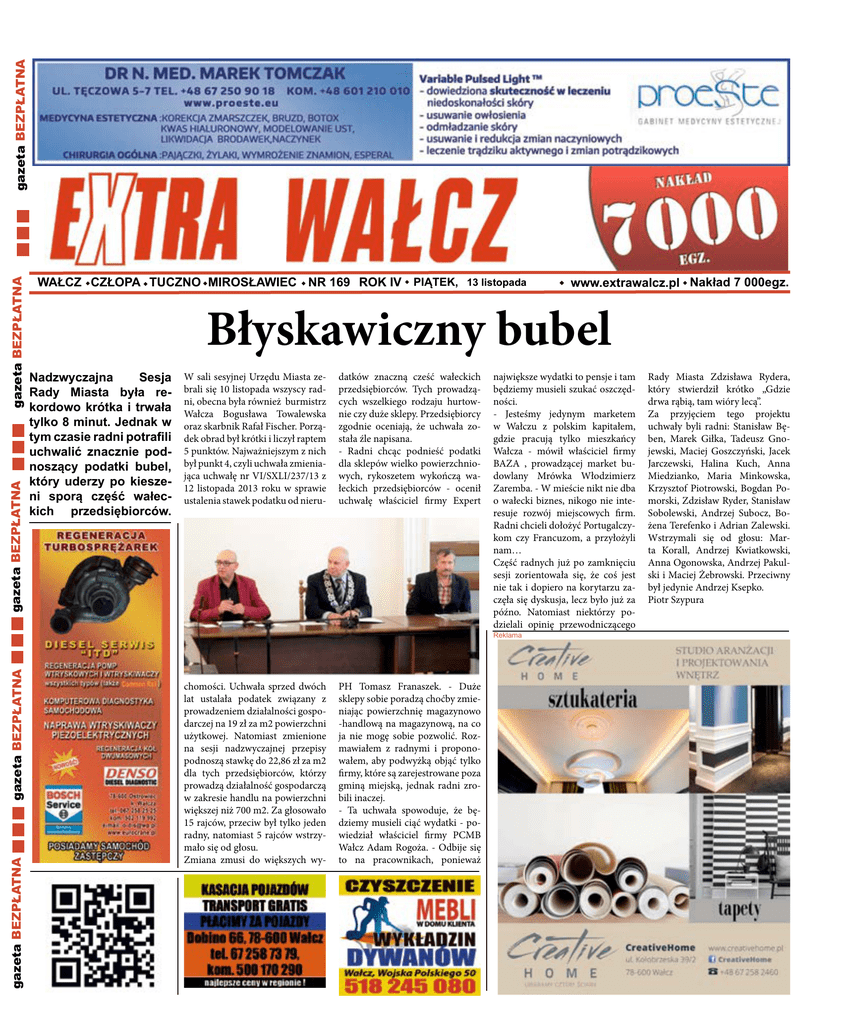 gazeta BEZPŁATNA gazeta BEZPŁATNA gazeta BEZPŁATNA WAŁCZ CZŁOPA TUCZNO MIROSŁAWIEC NR 169 ROK IV PIĄTEK, 13 listopada Błyskawiczny bubel Nadzwyczajna Sesja Rady Miasta była rekordowo krótka i trwała tylko 8 minut. Jednak w tym czasie radni potrafili uchwalić znacznie podnoszący podatki bubel, który uderzy po kieszeni sporą część wałeckich przedsiębiorców. W sali sesyjnej Urzędu Miasta zebrali się 10 listopada wszyscy radni, obecna była również burmistrz Wałcza Bogusława Towalewska oraz skarbnik Rafał Fischer. Porządek obrad był krótki i liczył raptem 5 punktów. Najważniejszym z nich był punkt 4, czyli uchwała zmieniająca uchwałę nr VI/SXLI/237/13 z 12 listopada 2013 roku w sprawie ustalenia stawek podatku od nieru- datków znaczną cześć wałeckich przedsiębiorców. Tych prowadzących wszelkiego rodzaju hurtownie czy duże sklepy. Przedsiębiorcy zgodnie oceniają, że uchwała została źle napisana. - Radni chcąc podnieść podatki dla sklepów wielko powierzchniowych, rykoszetem wykończą wałeckich przedsiębiorców - ocenił uchwałę właściciel firmy Expert największe wydatki to pensje i tam będziemy musieli szukać oszczędności. - Jesteśmy jedynym marketem w Wałczu z polskim kapitałem, gdzie pracują tylko mieszkańcy Wałcza - mówił właściciel firmy BAZA , prowadzącej market budowlany Mrówka Włodzimierz Zaremba. - W mieście nikt nie dba o wałecki biznes, nikogo nie interesuje rozwój miejscowych firm. Radni chcieli dołożyć Portugalczykom czy Francuzom, a przyłożyli nam… Część radnych już po zamknięciu sesji zorientowała się, że coś jest nie tak i dopiero na korytarzu zaczęła się dyskusja, lecz było już za późno. Natomiast niektórzy podzielali opinię przewodniczącego gazeta BEZPŁATNA Reklama gazeta BEZPŁATNA www.extrawalcz.pl Nakład 7 000egz. chomości. Uchwała sprzed dwóch lat ustalała podatek związany z prowadzeniem działalności gospodarczej na 19 zł za m2 powierzchni użytkowej. Natomiast zmienione na sesji nadzwyczajnej przepisy podnoszą stawkę do 22,86 zł za m2 dla tych przedsiębiorców, którzy prowadzą działalność gospodarczą w zakresie handlu na powierzchni większej niż 700 m2. Za głosowało 15 rajców, przeciw był tylko jeden radny, natomiast 5 rajców wstrzymało się od głosu. Zmiana zmusi do większych wy- PH Tomasz Franaszek. - Duże sklepy sobie poradzą choćby zmieniając powierzchnię magazynowo -handlową na magazynową, na co ja nie mogę sobie pozwolić. Rozmawiałem z radnymi i proponowałem, aby podwyżką objąć tylko firmy, które są zarejestrowane poza gminą miejską, jednak radni zrobili inaczej. - Ta uchwała spowoduje, że będziemy musieli ciąć wydatki - powiedział właściciel firmy PCMB Wałcz Adam Rogoża. - Odbije się to na pracownikach, ponieważ Rady Miasta Zdzisława Rydera, który stwierdził krótko „Gdzie drwa rąbią, tam wióry lecą”. Za przyjęciem tego projektu uchwały byli radni: Stanisław Bęben, Marek Giłka, Tadeusz Gnojewski, Maciej Goszczyński, Jacek Jarczewski, Halina Kuch, Anna Miedzianko, Maria Minkowska, Krzysztof Piotrowski, Bogdan Pomorski, Zdzisław Ryder, Stanisław Sobolewski, Andrzej Subocz, Bożena Terefenko i Adrian Zalewski. Wstrzymali się od głosu: Marta Korall, Andrzej Kwiatkowski, Anna Ogonowska, Andrzej Pakulski i Maciej Żebrowski. Przeciwny był jedynie Andrzej Ksepko. Piotr Szypura 2 CZWARTEK, 13 listopada 2015 FELIETON NACZELNEGO (W ZASTĘPSTWIE) Nasze elity Święto Niepodległości już za nami. W związku z obchodami pewien znajomy starszy pan zwrócił moją uwagę na pewną niekonsekwencję Polaków w obchodach 11 listopada. Podkreślano, że Polacy odzyskali wolność 97 lat temu i za chwilę po tych słowach w przemówieniach „dygnitarzy” pojawiał się albo zaborca hitlerowski, a niejednokrotnie nawet radziecki okupant z czasów PRL. Przedstawia się internowanych jako żywą historię powiązaną z Dniem Niepodległości. Znajomy pan zmarszczył czoło i skwitował to słowami „Szkoda, że ludzie na stanowiskach nie rozumieją historii i nie rozróżniają dat 1918, 1945 i 1989. Każda z tych dat to inne ważne wydarzenie i wiedza ta jest nabywana już w podstawówce, a jak ktoś bzdury opowiada w tym temacie, to chyba kupił sobie świadectwo z podstawówki za wiadro śledzi”. Jeśli chodzi o lokalne podwórko największym zainteresowaniem cieszyły się w ostatnim REKLAMA czasie dwie informacje. Chodzi o specjalistów od PR w wałeckim ratuszu i odwołanie dyrektor Wałeckiego Centrum Kultury. Osobiście uważam, że ktoś (do dziś nie wiadomo kto, bo taki jest przepływ informacji między Urzędem Miasta a redakcją Extra Wałcz) zatrudniając speców od PR podjął dobrą decyzję. Wizerunek Wałcza nie jest doskonały i powtarza to coraz więcej mieszkańców. Trzymam kciuki za nową firmę, bo mam nadzieję, że w końcu nastanie normalność pozbawiona szumów komunikacyjnych i wybiórczego traktowania ludzi przez panią burmistrz Bogusławę Towalewską. Z drugiej strony gratuluję pani burmistrz doskonałej strategii. Chcąc sprawdzić czy firma od public relations jest naprawdę dobra… zwalnia dyrektora WCK w trybie natychmiastowym! I teraz panowie od PR kombinujcie, jak z tego wybrnąć z twarzą, bo za to wam płacą. Zadania nie zazdroszczę. Piotr Kurzyna Zachowywał się podejrzanie Policjanci Wydziału Kryminalnego zatrzymali 21-latka, który przy sobie i w mieszkaniu miał narkotyki. Prokurator zastosował wobec niego dozór policyjny i poręczenie majątkowe. Policjanci pełniący służbę na tere- nie Wałcza zauważyli dwóch młodych mężczyzn. Jeden z nich na widok mundurowych zaczął się nerwowo zachowywać, a kiedy podeszli bliżej, mężczyzna odrzucił od siebie jakieś zawiniątko. Okazało się, że była to marihuana (prawie 5 gram). Mężczyzna został zatrzymany. W toku dalszych czynności policjanci przeszukali jego mieszkanie i 