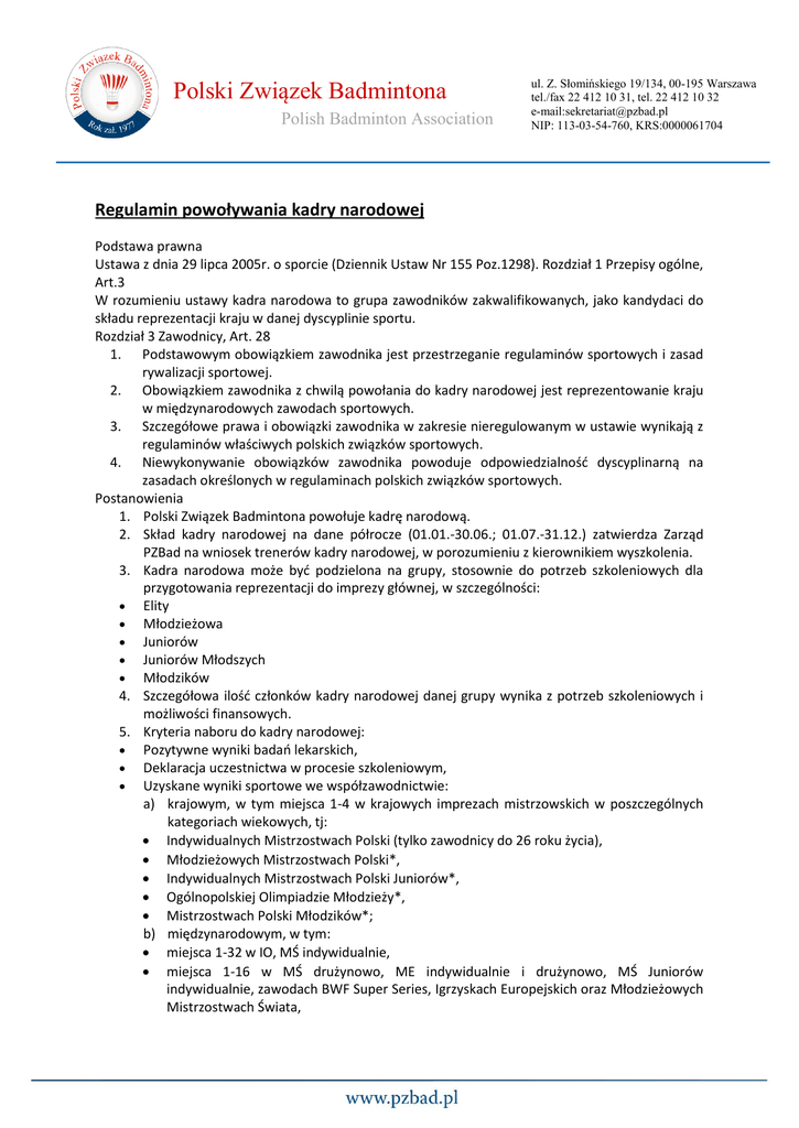 Polski Związek Badmintona Polish Badminton Association ul. Z. Słomińskiego 19/134, 00-195 Warszawa tel./fax 22 412 10 31, tel. 22 412 10 32 e-mail:[email protected] NIP: 113-03-54-760, KRS:0000061704 Regulamin powoływania kadry narodowej Podstawa prawna Ustawa z dnia 29 lipca 2005r. o sporcie (Dziennik Ustaw Nr 155 Poz.1298). Rozdział 1 Przepisy ogólne, Art.3 W rozumieniu ustawy kadra narodowa to grupa zawodników zakwalifikowanych, jako kandydaci do składu reprezentacji kraju w danej dyscyplinie sportu. Rozdział 3 Zawodnicy, Art. 28 1. Podstawowym obowiązkiem zawodnika jest przestrzeganie regulaminów sportowych i zasad rywalizacji sportowej. 2. Obowiązkiem zawodnika z chwilą powołania do kadry narodowej jest reprezentowanie kraju w międzynarodowych zawodach sportowych. 3. Szczegółowe prawa i obowiązki zawodnika w zakresie nieregulowanym w ustawie wynikają z regulaminów właściwych polskich związków sportowych. 4. Niewykonywanie obowiązków zawodnika powoduje odpowiedzialnośd dyscyplinarną na zasadach określonych w regulaminach polskich związków sportowych. Postanowienia 1. Polski Związek Badmintona powołuje kadrę narodową. 2. Skład kadry narodowej na dane półrocze (01.01.-30.06.; 01.07.-31.12.) zatwierdza Zarząd PZBad na wniosek trenerów kadry narodowej, w porozumieniu z kierownikiem wyszkolenia. 3. Kadra narodowa może byd podzielona na grupy, stosownie do potrzeb szkoleniowych dla przygotowania reprezentacji do imprezy głównej, w szczególności: Elity Młodzieżowa Juniorów Juniorów Młodszych Młodzików 4. Szczegółowa ilośd członków kadry narodowej danej grupy wynika z potrzeb szkoleniowych i możliwości finansowych. 5. Kryteria naboru do kadry narodowej: Pozytywne wyniki badao lekarskich, Deklaracja uczestnictwa w procesie szkoleniowym, Uzyskane wyniki sportowe we współzawodnictwie: a) krajowym, w tym miejsca 1-4 w krajowych imprezach mistrzowskich w poszczególnych kategoriach wiekowych, tj: Indywidualnych Mistrzostwach Polski (tylko zawodnicy do 26 roku życia), Młodzieżowych Mistrzostwach Polski*, Indywidualnych Mistrzostwach Polski Juniorów*, Ogólnopolskiej Olimpiadzie Młodzieży*, Mistrzostwach Polski Młodzików*; b) międzynarodowym, w tym: miejsca 1-32 w IO, MŚ indywidualnie, miejsca 1-16 w MŚ drużynowo, ME indywidualnie i drużynowo, MŚ Juniorów indywidualnie, zawodach BWF Super Series, Igrzyskach Europejskich oraz Młodzieżowych Mistrzostwach Świata, Polski Związek Badmintona Polish Badminton Association ul. Z. Słomińskiego 19/134, 00-195 Warszawa tel./fax 22 412 10 31, tel. 22 412 10 32 e-mail:[email protected] NIP: 113-03-54-760, KRS:0000061704 6. 7. 8. 9. miejsca 1-8 w MŚ Juniorów drużynowo, Zawodach Grand Prix Gold, Grand Prix, ME Juniorów indywidualnie, miejsca 1-8 w drużynowych mistrzostwach Europy U17, miejsca 1-4 w zawodach BWF International Challenge, International Series, Future Series, międzynarodowych mistrzostwach juniorów. c) Uczestnictwo w szkoleniu centralnym, Dodatkowa selekcja trenera KN – w uzasadnionych przypadkach. W danym półroczu skład kadry narodowej może byd uzupełniony na podstawie uchwały Zarządu PZBad na wniosek trenera kadry, w porozumieniu z kierownikiem wyszkolenia. W danym półroczu skład kadry może byd zmniejszony wskutek uprawomocnienia się decyzji dyscyplinarnej o usunięciu z kadry. PZBad informuje zainteresowanego o powołaniu do kadry narodowej. Niniejszy regulamin zatwierdzony przez PZBad w dniu 09.01.2010r., skorygowany w dniu 2.01.2015 wchodzi w życie z dniem korekty. OGÓLNE PRAWA I OBOWIĄZKI CZŁONKÓW KADRY NARODOWEJ Zarząd PZBad w dniu 23 lutego 1999 r. zatwierdził, co następuje: Członkowie kadry narodowej mają prawo do: 1. Szczegółowej informacji o planowanych akcjach szkoleniowych, tj. zgrupowaniach, badaniach, turniejach w kraju i za granicą z ich udziałem. 2. Właściwej opieki ze strony osób prowadzących proces szkoleniowy, w tym kierowników zgrupowao i ekip wyjeżdżających za granicę, trenerów i ich asystentów, lekarzy, masażystów, psychologów itd. 3. Korzystania z odpowiednich warunków socjalnych, w tym zakwaterowania, wyżywienia podczas akcji szkoleniowych. 4. Korzystania z niezbędnego sprzętu na zgrupowaniach. 5. Otrzymania osobistego wyposażenia w sprzęt i ubiory zgodnie z obowiązującymi normami. 6. Otrzymania należnej premii finansowej za osiągnięte wyniki sportowe. 7. Ubezpieczenia od następstw nieszczęśliwych wypadków. Członkowie kadry narodowej są zobowiązani do: 1. Posiadania: licencji zawodnika, ważnego paszportu, książeczki sportowo - lekarskiej z aktualnymi badaniami, 2. Aktywnego uczestnictwa w procesie szkoleniowym, w tym: zaangażowanego udziału w treningi, wykonywania zaleceo trenera kadry, wykonywania poleceo innych osób funkcyjnych biorących udział w akcjach szkoleniowych, startów w wyznaczonych turniejach krajowych i zagranicznych. 3. Przestrzegania powszechnie obowiązującego prawa oraz przepisów obowiązujących w dziedzinie kultury fizycznej, w tym przepisów Polskiego Związku Badmintona. 4. Poddawania się obowiązkowym testom sprawnościowym, badaniom lekarskim i antydopingowym. 5. Bieżącego informowania trenera kadry o sprawach osobistych uniemożliwiających udział w zaplanowanej akcji szkoleniowej. 6. Prowadzenia sportowego trybu życia, w szczególności zakaz palenia tytoniu, picia alkoholu, używania narkotyków i środków dopingujących. Polski Związek Badmintona Polish Badminton Association ul. Z. Słomińskiego 19/134, 00-195 Warszawa tel./fax 22 412 10 31, tel. 22 412 10 32 e-mail:[email protected] NIP: 113-03-54-760, KRS:0000061704 7. Propagowania dyscypliny, w tym: noszenia stroju reprezentacji, dbania o zewnętrzny wizerunek kadry narodowej, udziału w turniejach pokazowych, udziału w spotkaniach promujących badminton. *miejsca 1-4 uzyskane przez zawodników z ostatniego rocznika danej kategorii wiekowej nie uprawniają do członkostwa w kolejny