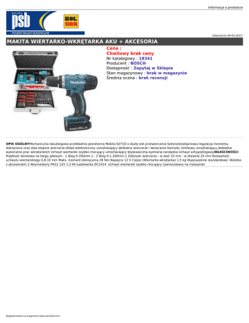 Informacje o produkcie Utworzono 04-03-2017 MAKITA WIERTARKO-WKRĘTARKA AKU + AKCESORIA Cena : Chwilowy brak ceny Nr katalogowy : 18341 Producent : BOSCH Dostępność : Zapytaj w Sklepie Stan magazynowy : brak w magazynie Średnia ocena : brak recenzji OPIS OGÓLNYMechaniczna dwubiegowa przekładnia planetarna Makita 6271D o dużej sile przewiercania Szesnastostopniowa regulacja momentu dokręcania oraz dwa stopnie wiercenia Układ elektroniczny umożliwiający delikatne wiercenie i wkręcanie Hamulec silnikowy umożliwiający dokładne wykonanie prac wkrętarskich Uchwyt wiertarski szybko mocujący umożliwiający błyskawiczną wymianę narzędzia Uchwyt antypoślizgowyWŁAŚCIWOŚCI Prędkość obrotowa na biegu jałowym - 1 Bieg 0-350min-1 - 2 Bieg 0-1.200min-1 Zdolność wiercenia - w stali 10 mm - w drewnie 25 mm Rozwartość uchwytu wiertarskiego 0,8-10 mm Maks. moment dokręcania 28 Nm Napięcie 12 V Ciężar (Wiertarko-wkrętarka) 1,5 kg Wyposażenie standardowe: Walizka z akcesoriami 2 Akumulatory PA12 12V 1,3 Ah Ładowarka DC1414 Uchwyt wiertarski szybko mocujący (zamocowany na maszynie) Wygenerowano w programie www.oscGold.com