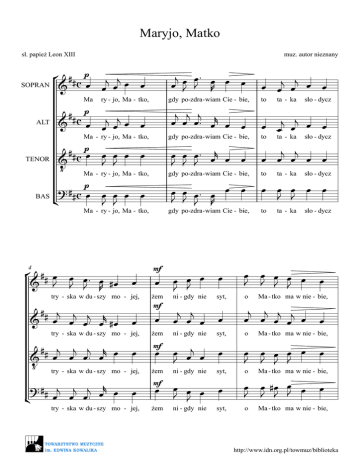 Maryjo, Matko sł. papież Leon XIII j œ œ™ œ œ œ œ J J R ° ## p j j SOPRAN & c œ œ œ œ œ Ma ALT ry - jo, Ma - tko, gdy po-zdra - wiam Cie - bie, ## p & c œ œj œj œ œ j j j œ œ œ™ œr œ œ Ma - ry - jo, Ma - tko, TENOR gdy po-zdra - wiam Cie - bie, œ œ œ ™ œr œ œ J J J ## pœ œ œ œ œ & c J J ‹ Ma - ry - jo, Ma - tko, gdy po-zdra - wiam Cie - bie, œ œ œ™ œ œ œ J J J R ? ##c œ œ œ œ œ BAS ¢ J J p Ma - ry - jo, Ma - tko, ° ## œ œ œ™ & J J J œR #œ 4 œ try - ska w du - szy mo - jej, ## j j j r & œ œ œ ™ œ #œ œ try - ska w du - szy mo - jej, ## j j j r œ œ & œ œ œ™ œ ‹ try - ska w du - szy mo - jej, ? ## j j j œr œ œ œ œ™ ¢ œ try - ska w du - szy mo - jej, gdy po-zdra - wiam Cie - bie, mf œ œ œ œ J J œ żem mf ni - gdy nie syt, œ żem j j œ œ œ ni - gdy nie syt, œ œ œj œ J œ œ mf muz. autor nieznany œ œj œj œ œ to ta - ka sło - dycz j œ œj œ œ œ to ta - ka sło - dycz j j œ œ œ œ œ to ta - ka sło - dycz œ œ œ œ œ J J to ta - ka sło - dycz œ œ œ œ œ J J J J œ j j j œ œ œ œj œ œ œ œ œ œ œ J J J J œ œ o o Ma - tko ma w nie - bie, żem ni - gdy nie syt, œ œ œ œ J J œ œ œ #œ œ œ J J J J syt, o mf żem ni - gdy nie o Ma - tko ma w nie - bie, Ma - tko ma w nie - bie, Ma - tko ma w nie - bie, http://www.idn.org.pl/towmuz/biblioteka ° ## œ & œ œ œ J J ## & œ j j œ œ œ 2 7 œ wciąż bym po - wta - rzał: œ wciąż bym po - wta - rzał: ¢ ## œ œ œ & œ J J ‹ wciąż bym po - wta ? ## œ j œj œ œ œ - rzał: œ wciąż bym po - wta - rzał: ˙ ˙ f zdro - f ˙ ˙ zdro waś, - ˙ waś, ˙ f zdro f - zdro - ˙ waś, ˙ waś, rit. œ œ œ œ œ J J J J U œ j œ œ œ œ œ J J J U œ zdro - waś ku czci Two - jej. zdro - waś ku czci Two - jej. #œ œ œ œ œ J J J J U œ œ œ œ œ J J J J œ U œ zdro - waś ku czci Two - jej. zdro - waś ku czci Two - jej. 2. Kiedy nade mną pokusy zawieją, gdy się uzbroi przeciw mnie duch złości, Tyś mą rozkoszą, Tyś mą jest nadzieją, Tyś ponad wszystkie droższa, Droższa ma miłości. 3. Bo kiedy tylko napadną mnie wrogi, a Ty mnie, Matko, weźmiesz na swe łono, wnet zniknąć muszą wszystkie duszy trwogi, moja pociecho, tarczo, tarczo i obrono. http://www.idn.org.pl/towmuz/biblioteka
