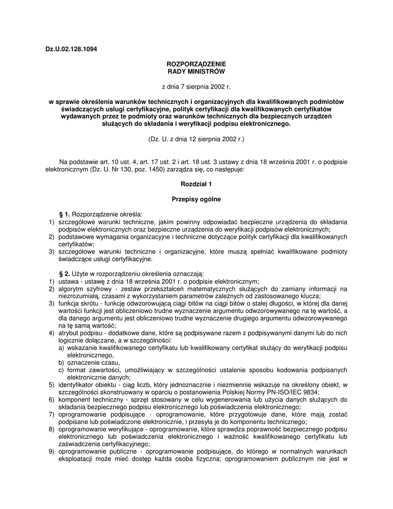 Dz.U.02.128.1094 ROZPORZĄDZENIE RADY MINISTRÓW z dnia 7 sierpnia 2002 r. w sprawie określenia warunków technicznych i organizacyjnych dla kwalifikowanych podmiotów świadczących usługi certyfikacyjne, polityk certyfikacji dla kwalifikowanych certyfikatów wydawanych przez te podmioty oraz warunków technicznych dla bezpiecznych urządzeń służących do składania i weryfikacji podpisu elektronicznego. (Dz. U. z dnia 12 sierpnia 2002 r.) Na podstawie art. 10 ust. 4, art. 17 ust. 2 i art. 18 ust. 3 ustawy z dnia 18 września 2001 r. o podpisie elektronicznym (Dz. U. Nr 130, poz. 1450) zarządza się, co następuje: Rozdział 1 Przepisy ogólne § 1. Rozporządzenie określa: 1) szczegółowe warunki techniczne, jakim powinny odpowiadać bezpieczne urządzenia do składania podpisów elektronicznych oraz bezpieczne urządzenia do weryfikacji podpisów elektronicznych; 2) podstawowe wymagania organizacyjne i techniczne dotyczące polityk certyfikacji dla kwalifikowanych certyfikatów; 3) szczegółowe warunki techniczne i organizacyjne, które muszą spełniać kwalifikowane podmioty świadczące usługi certyfikacyjne. § 2. Użyte w rozporządzeniu określenia oznaczają: 1) ustawa - ustawę z dnia 18 września 2001 r. o podpisie elektronicznym; 2) algorytm szyfrowy - zestaw przekształceń matematycznych służących do zamiany informacji na niezrozumiałą, czasami z wykorzystaniem parametrów zależnych od zastosowanego klucza; 3) funkcja skrótu - funkcję odwzorowującą ciągi bitów na ciągi bitów o stałej długości, w której dla danej wartości funkcji jest obliczeniowo trudne wyznaczenie argumentu odwzorowywanego na tę wartość, a dla danego argumentu jest obliczeniowo trudne wyznaczenie drugiego argumentu odwzorowywanego na tę samą wartość; 4) atrybut podpisu - dodatkowe dane, które są podpisywane razem z podpisywanymi danymi lub do nich logicznie dołączane, a w szczególności: a) wskazanie kwalifikowanego certyfikatu lub kwalifikowany certyfikat służący do weryfikacji podpisu elektronicznego, b) oznaczenie czasu, c) format zawartości, umożliwiający w szczególności ustalenie sposobu kodowania podpisanych elektronicznie danych; 5) identyfikator obiektu - ciąg liczb, który jednoznacznie i niezmiennie wskazuje na określony obiekt, w szczególności skonstruowany w oparciu o postanowienia Polskiej Normy PN-ISO/IEC 9834; 6) komponent techniczny - sprzęt stosowany w celu wygenerowania lub użycia danych służących do składania bezpiecznego podpisu elektronicznego lub poświadczenia elektronicznego; 7) oprogramowanie podpisujące - oprogramowanie, które przygotowuje dane, które mają zostać podpisane lub poświadczone elektronicznie, i przesyła je do komponentu technicznego; 8) oprogramowanie weryfikujące - oprogramowanie, które sprawdza poprawność bezpiecznego podpisu elektronicznego lub poświadczenia elektronicznego i ważność kwalifikowanego certyfikatu lub zaświadczenia certyfikacyjnego; 9) oprogramowanie publiczne - oprogramowanie podpisujące, do którego w normalnych warunkach eksploatacji może mieć dostęp każda osoba fizyczna; oprogramowaniem publicznym nie jest w 10) 11) 12) 13) 14) 15) 16) 17) 18) szczególności oprogramowanie używane w mieszkaniu prywatnym, lokalu biurowym lub telefonie komórkowym; klucze infrastruktury - klucze kryptograficzne algorytmów szyfrowych stosowane do innych celów niż składanie lub weryfikacja bezpiecznego podpisu elektronicznego lub poświadczenia elektronicznego, a w szczególności klucze stosowane: a) w protokołach uzgadniania lub dystrybucji kluczy zapewniających poufność danych, b) do zapewnienia, podczas transmisji lub przechowywania, poufności i integralności zgłoszeń certyfikacyjnych, kluczy użytkowników, rejestrów zdarzeń, c) do weryfikacji dostępu do urządzeń, oprogramowania weryfikującego lub podpisującego; moduł kluczowy - urządzenie współpracujące z komponentem technicznym, przechowujące klucze infrastruktury lub dane służące do składania bezpiecznych podpisów elektronicznych lub poświadczeń elektronicznych, lub klucze chroniące te dane, lub przechowujące części tych kluczy lub danych; bezpieczna ścieżka - łącze zapewniające wymianę między oprogramowaniem podpisującym a komponentem technicznym informacji związanych z uwierzytelnieniem użytkownika komponentu technicznego, zabezpieczone w sposób uniemożliwiający naruszenie integralności przesyłanych danych przez jakiekolwiek oprogramowanie; bezpieczny kanał - łącze zapewniające wymianę między oprogramowaniem podpisującym a komponentem technicznym informacji związanych z przekazywaniem danych, które mają być podpisane lub poświadczone elektronicznie, zabezpieczone w sposób uniemożliwiający naruszenie integralności przesyłanych danych przez jakiekolwiek oprogramowanie; segment sieci - wydzieloną część sieci teleinformatycznej, połączoną z pozostałymi częściami za pośrednictwem specjalistycznych urządzeń umożliwiających odłączenie tej części od reszty sieci; śluza bezpieczeństwa - sprzęt lub oprogramowanie chroniące segment sieci teleinformatycznej przed przepływem nieuprawnionych danych z innego segmentu sieci teleinformatycznej; ścieżka certyfikacji - uporządkowany ciąg zaświadczeń certyfikacyjnych lub zaświadczeń certyfikacyjnych i kwalifikowanego certyfikatu, utworzony w ten sposób, że za pomocą danych służących do weryfikacji poświadczenia elektronicznego i nazwy wydawcy pierwszego zaświadczenia certyfikacyjnego na ścieżce jest możliwe wykazanie, że dla każdych dwóch bezpośrednio po sobie występujących zaświadczeń certyfikacyjnych lub zaświadczenia certyfikacyjnego i kwalifikowanego certyfikatu, poświadczenie elektroniczne zawarte w jednym z nich zostało sporządzone za pomocą danych służących do składania poświadczenia elektronicznego związanych z drugim z nich; dane służące do weryfikacji pier