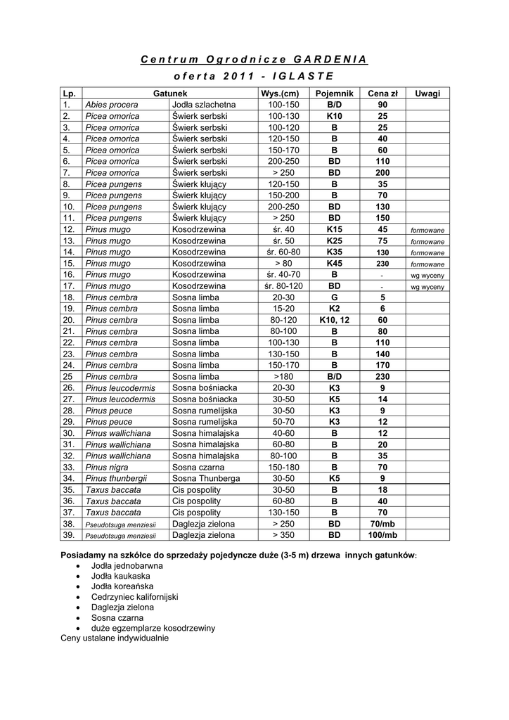 Centrum Ogrodnicze GARDENIA oferta 2011 - IGLASTE Lp. 1. 2. 3. 4. 5. 6. 7. 8. 9. 10. 11. 12. 13. 14. 15. 16. 17. 18. 19. 20. 21. 22. 23. 24. 25 26. 27. 28. 29. 30. 31. 32. 33. 34. 35. 36. 37. 38. 39. Gatunek Jodła szlachetna Abies procera Świerk serbski Picea omorica Świerk serbski Picea omorica Świerk serbski Picea omorica Świerk serbski Picea omorica Świerk serbski Picea omorica Świerk serbski Picea omorica Świerk kłujący Picea pungens Świerk kłujący Picea pungens Świerk kłujący Picea pungens Świerk kłujący Picea pungens Kosodrzewina Pinus mugo Kosodrzewina Pinus mugo Kosodrzewina Pinus mugo Kosodrzewina Pinus mugo Kosodrzewina Pinus mugo Kosodrzewina Pinus mugo Sosna limba Pinus cembra Sosna limba Pinus cembra Sosna limba Pinus cembra Sosna limba Pinus cembra Sosna limba Pinus cembra Sosna limba Pinus cembra Sosna limba Pinus cembra Sosna limba Pinus cembra Sosna bośniacka Pinus leucodermis Sosna bośniacka Pinus leucodermis Sosna rumelijska Pinus peuce Sosna rumelijska Pinus peuce Sosna himalajska Pinus wallichiana Sosna himalajska Pinus wallichiana Sosna himalajska Pinus wallichiana Sosna czarna Pinus nigra Sosna Thunberga Pinus thunbergii Cis pospolity Taxus baccata Cis pospolity Taxus baccata Cis pospolity Taxus baccata Daglezja zielona Pseudotsuga menziesii Daglezja zielona Pseudotsuga menziesii Wys.(cm) 100-150 100-130 100-120 120-150 150-170 200-250 > 250 120-150 150-200 200-250 > 250 śr. 40 śr. 50 śr. 60-80 > 80 śr. 40-70 śr. 80-120 20-30 15-20 80-120 80-100 100-130 130-150 150-170 >180 20-30 30-50 30-50 50-70 40-60 60-80 80-100 150-180 30-50 30-50 60-80 130-150 > 250 > 350 Pojemnik B/D K10 B B B BD BD B B BD BD K15 K25 K35 K45 B BD G K2 K10, 12 B B B B B/D K3 K5 K3 K3 B B B B K5 B B B BD BD Cena zł 90 25 25 40 60 110 200 35 70 130 150 45 75 Uwagi formowane formowane 130 230 formowane - wg wyceny - wg wyceny formowane 5 6 60 80 110 140 170 230 9 14 9 12 12 20 35 70 9 18 40 70 70/mb 100/mb Posiadamy na szkółce do sprzedaży pojedyncze duże (3-5 m) drzewa innych gatunków: • Jodła jednobarwna • Jodła kaukaska • Jodła koreańska • Cedrzyniec kalifornijski • Daglezja zielona • Sosna czarna • duże egzemplarze kosodrzewiny Ceny ustalane indywidualnie Oznaczenia: K3 - roślina w pojemniku 3-litrowym G - roślina kopana z gruntu, goły korzeń B - roślina kopana z bryłą zabezpieczona jutą BD - roślina kopana z bryłą zabezpieczona jutą i siatką drucianą śr. 40 - średnica kosodrzewiny ciętej kilkakrotnie Centrum Ogrodnicze GARDENIA oferta 2011 - LIŚCIASTE Lp. 1. 2. 3. 4. 5. 6. 7. 8. 9. 10. 11. 12. 13. 14. 15. 16. 17. 18. 19. 20. 21. 22. 23. 24. 25 26. 27. 28. 29. 30. 31. 32. 33. 34. 35. 36. 37. 38. 39. 40. 41. 42. 43. Gatunek Kasztanowiec biały Aesculus hippocastanium Kasztanowiec biały Aesculus hippocastanium Kasztanowiec biały Aesculus hippocastanium Kasztanowiec biały Aesculus hippocastanium Kasztanowiec biały Aesculus hippocastanium Kasztanowiec biały Aesculus hippocastanium Kasztanowiec biały Aesculus hippocastanium Kasztan jadalny Castanea sativa Kasztan jadalny Castanea sativa Kasztan jadalny Castanea sativa Kasztan jadalny Castanea sativa Jarząb szwedzki Sorbus intermedia Jarząb szwedzki Sorbus intermedia Jarząb szwedzki Sorbus intermedia Lipa drobnolistna Tilia cordata Lipa drobnolistna Tilia cordata Lipa drobnolistna Tilia cordata Lipa drobnolistna Tilia cordata Lipa drobnolistna Tilia cordata Lipa drobnolistna Tilia cordata Lipa drobnolistna Tilia cordata Lipa drobnolistna Tilia cordata Lipa drobnolistna Tilia cordata Lipa szerokolistna Tilia platyphyllos Lipa szerokolistna Tilia platyphyllos Lipa szerokolistna Tilia platyphyllos Lipa szerokolistna Tilia platyphyllos Lipa szerokolistna Tilia platyphyllos Lipa szerokolistna Tilia platyphyllos Lipa szerokolistna Tilia platyphyllos Lipa szerokolistna Tilia platyphyllos Lipa szerokolistna Tilia platyphyllos Miłorząb japoński Ginkgo biloba Miłorząb japoński Ginkgo biloba Dąb szypułkowy Quercus robur Dąb szypułkowy Quercus robur Dąb szypułkowy Quercus robur Dąb szypułkowy Quercus robur Dąb szypułkowy Quercus robur Dąb szypułkowy Quercus robur Dąb szypułkowy Quercus robur "Fastigiata" Dąb szypułkowy "F" Quercus robur "Fastigiata" Dąb szypułkowy "F" Quercus robur "Fastigiata” Oznaczenia: Pa - forma pienna 18-20 - obwód pnia na wys. 1 m Oferowane drzewa do sprzedaży w sezonie jesień/wiosna. Bryła korzeniowa zabezpieczona, jutą lub jutą i siatką drucianą. Rozmiar Pa 12-14 Pa 14-16 Pa 16-18 Pa 18-20 Pa 22-24 Pa 24-26 Pa > 26 Pa 12-14 Pa 14-16 Pa 16-18 Pa 18-20 Pa 8-10 Pa 10-12 Pa 12-14 Pa 8 -10 Pa 10-12 Pa 12-14 Pa 14-16 Pa 16-18 Pa 18-20 Pa 20-22 Pa 22-24 Pa 26-30 Pa 14-16 Pa 16-18 Pa 18-20 Pa 20-22 Pa 22-24 Pa 24-26 Pa 26-30 Pa 30-34 Pa 34-38 Pa 12-14 Pa 14-16 Pa 14-16 Pa 16-18 Pa 18-20 Pa 20-22 Pa 22-24 Pa 24-26 200-250 18-20 38-40 Cena zł 70 100 120 140 160 180 200 90 120 160 190 60 90 120 40 60 90 120 160 190 220 350 550 110 150 180 210 340 420 550 700 800 260 320 190 240 290 350 420 550 180 850 1500 Uwagi KONTAKT Roman Grupa ul. Obwodowa 21 66-008 Świdnica tel. 601 919 583, 601 437 648 e-mail: [email protected], [email protected] Oferta zawiera ceny hurtowe netto. Stosujemy rabaty oraz negocjacje cenowe.
