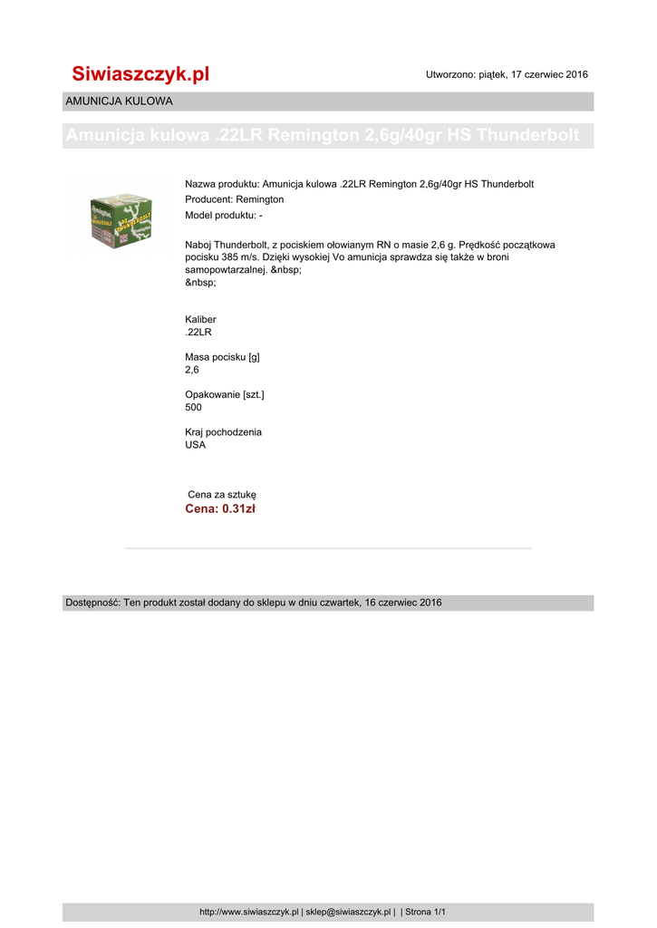 Siwiaszczyk.pl Utworzono: piątek, 17 czerwiec 2016 AMUNICJA KULOWA Amunicja kulowa .22LR Remington 2,6g/40gr HS Thunderbolt Nazwa produktu: Amunicja kulowa .22LR Remington 2,6g/40gr HS Thunderbolt Producent: Remington Model produktu: Naboj Thunderbolt, z pociskiem ołowianym RN o masie 2,6 g. Prędkość początkowa pocisku 385 m/s. Dzięki wysokiej Vo amunicja sprawdza się także w broni samopowtarzalnej. Kaliber .22LR Masa pocisku [g] 2,6 Opakowanie [szt.] 500 Kraj pochodzenia USA Cena za sztukę Cena: 0.31zł Dostępność: Ten produkt został dodany do sklepu w dniu czwartek, 16 czerwiec 2016 http://www.siwiaszczyk.pl | [email protected] | | Strona 1/1