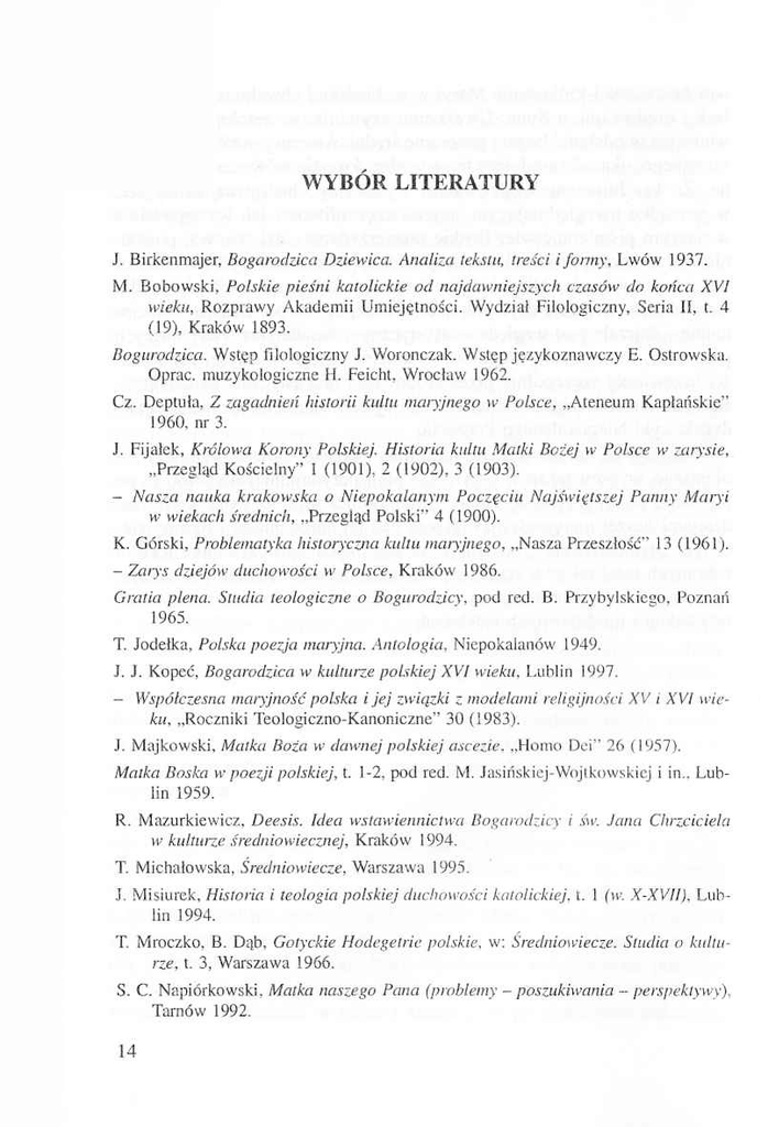 W Y B Ó R LITER A TU R Y J. Birkenmajer, Bogarodzica Dziewica. Analiza tekstu, treści i formy, Lwów 1937. M. Bobowski, Polskie pieśni katolickie od najdawniejszych czasów do końca XVI wieku, Rozprawy Akademii Umiejętności. Wydział Filologiczny, Seria II, t. 4 (19), Kraków 1893. Bogurodzica. Wstęp filologiczny J. Woronczak. Wstęp językoznawczy E. Ostrowska. Oprac, muzykologiczne H. Feicht, Wrocław 1962. Cz. Deptuła, Z zagadnień historii kultu maryjnego w Polsce, „Ateneum Kapłańskie” 1960, nr 3. J. Fijałek, Królowa Korony Polskiej. Historia kultu Matki Bożej w Polsce w zarysie, „Przegląd Kościelny” 1 (1901), 2 (1902), 3 (1903). — Nasza nauka krakowska o Niepokalanym Poczęciu Najświętszej Panny Maryi w wiekach średnich, „Przegląd Polski” 4 (1900). K. Górski, Problematyka historyczna kultu maryjnego, „Nasza Przeszłość” 13 (1961). —Zarys dziejów duchowości w Polsce, Kraków 1986. Gratia plena. Studia teologiczne o Bogurodzicy, pod red. B. Przybylskiego, Poznań 1965. T. Jodełka, Polska poezja maryjna. Antologia, Niepokalanów 1949. J. J. Kopeć, Bogarodzica w kulturze polskiej XVI wieku. Lublin 1997. — Współczesna maryjność polska i je j związki z modelami religijności XV i XVI wie ku, „Roczniki Teologiczno-Kanoniczne” 30 (1983). J. Majkowski, Matka Boża w dawnej polskiej ascezie, „Homo Dei” 26 (1957). Matka Boska w poezji polskiej, t. 1-2, pod red. M. Jasińskiej-Wojtkowskiej i im. Lub lin 1959. R. Mazurkiewicz, Deesis. Idea wstawiennictwa Bogarodzicy i św. Jana Chrzciciela w kulturze średniowiecznej, Kraków 1994. T. Michałowska, Średniowiecze, Warszawa 1995. J. Misiurek, Historia i teologia polskiej duchowości katolickiej, t. 1 (w. X-XVII), Lub lin 1994. T. Mroczko, B. Dąb, Gotyckie Hodegetria polskie, w: Średniowiecze. Studia o kultu rze, t. 3, Warszawa 1966. S. C. Napiórkowski, Matka naszego Pana (problemy – poszukiwania – perspektywy). Tarnów 1992. 14 J . Pirog, Geneza i rozwój bractw różańcowych w Polsce do roku 1604, „Roczniki Teologiczno-Kanoniczne” 19 (1972). Z Roszkówna [Z. Orawa], Kult Matki Boskiej Bolesnej w Polsce, „Homo Dei” 29 (1960). G. Ryś, Pobożność ludowa na ziemiach polskich w średniowieczu. Próba typologii, Szczecin 1995. S. Sawicki, Motywy maryjne w poezji średniowiecza i renesansu, w: S. Sawicki, Z pogranicza literatury i religii. Szkice, Lublin 1978. T. Sinka, Polska pieśń w liturgii, „Nasza Przeszłość” 60 (1983). M. Skradlik, Królowa Korony Polskiej. Szkice z historii malarstwa i kultu Bogarodzi cy w Polsce, Lwów 1930. W. Smoleń, Ilustracje świąt kościelnych w polskiej sztuce, Lublin 1987. J. Surzyński, Matka Boska w muzyce polskiej, Kraków 1905. Średniowieczna pieśń religijna polska, oprac. M. Korolko, Wrocław 1980. J. Trietiak, Najświętsza Panna w poezji polskiej, Kraków 1904. J. Wojnowski, Rozwój czci Matki Bożej w Polsce, „Homo Dei” 26 (1957). J . Wojtkowski, De cultu BMV in literatura Polonorum medii aevi, „Ephemerides Ma riologicae” 14 (1964). —Dogmat Niepokalanego Poczęcia NMP w średniowiecznej liturgii polskiej, „Ruch Biblijny i Liturgiczny” 6 (1953). —Kult Matki Boskiej w polskim piśmiennictwie do końca XV wieku. „Studia Warmiń skie” 3 (1966). —Macierzyństwo duchowe NMP w piśmiennictwie polskim do roku 1500, „Roczniki Teologiczno-Kanoniczne” 10 (1963). —NMP w Kazaniach gnieźnieńskich, „Roczniki Teologiczno-Kanoniczne” 1 (1955). —Początki kultu Matki Boskiej w Polsce w świetle najstarszych rękopisów, „Studia Warmińskie” 1 (1964). — Powstanie Godzinek o Niepokalanym Poczęciu Najśw. Maryi Panny z Modlitw Wacława, „Roczniki Teologiczno-Kanoniczne” 2 (1955). —Przedmiot liturgicznego kultu Maiki Boskiej w Polsce XIII wieku. „Studia Warmiń skie” 2 (1965). — Wiara w Niepokalane Poczęcie NMP w Polsce w świetle średniowiecznych zabyt ków liturgicznych. Studium historyczno-dogmatyczne, Lublin 1958. — Wniebowzięcie Matki Bożej w zbiorach kazań z biblioteki średniowiecznego kla sztoru franciszkanów w Gdańsku, „Studia Warmińskie” 4 (1967). W. Wydra, Władysław z Gielniowa. Z dziejów średniowiecznej poezji polskiej, Po znań 1992. E. Zdeb, Dzieje rorat w Polsce, „Rocznik Teologiczny Śląska Opolskiego” 1 (1968). 15