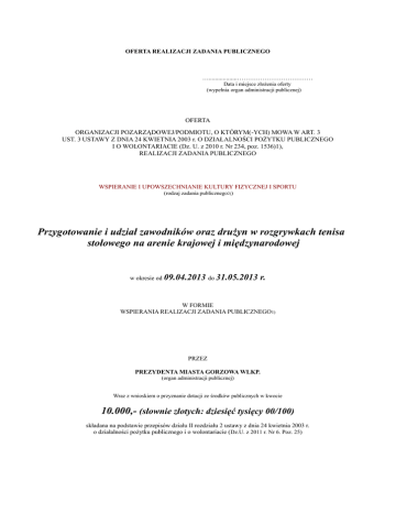 OFERTA REALIZACJI ZADANIA PUBLICZNEGO …..................……………………………… Data i miejsce złożenia oferty (wypełnia organ administracji publicznej) OFERTA ORGANIZACJI POZARZĄDOWEJ/PODMIOTU, O KTÓRYM(-YCH) MOWA W ART. 3 UST. 3 USTAWY Z DNIA 24 KWIETNIA 2003 r. O DZIAŁALNOŚCI POŻYTKU PUBLICZNEGO I O WOLONTARIACIE (Dz. U. z 2010 r. Nr 234, poz. 1536)1), REALIZACJI ZADANIA PUBLICZNEGO WSPIERANIE I UPOWSZECHNIANIE KULTURY FIZYCZNEJ I SPORTU (rodzaj zadania publicznego2)) Przygotowanie i udział zawodników oraz drużyn w rozgrywkach tenisa stołowego na arenie krajowej i międzynarodowej w okresie od 09.04.2013 do 31.05.2013 r. W FORMIE WSPIERANIA REALIZACJI ZADANIA PUBLICZNEGO1) PRZEZ PREZYDENTA MIASTA GORZOWA WLKP. (organ administracji publicznej) Wraz z wnioskiem o przyznanie dotacji ze środków publicznych w kwocie 10.000,- (słownie złotych: dziesięć tysięcy 00/100) składana na podstawie przepisów działu II rozdziału 2 ustawy z dnia 24 kwietnia 2003 r. o działalności pożytku publicznego i o wolontariacie (Dz.U. z 2011 r. Nr 6. Poz. 25) I. Dane na temat organizacji pozarządowej*/ podmiotu*/ jednostki organizacyjnej* 1) pełna nazwa: Gorzowski Klub Sportowy „GORZOVIA” w Gorzowie Wlkp. 2) forma prawna: Stowarzyszenie – Klub Sportowy 3) numer w Krajowym Rejestrze Sądowym lub w innym rejestrze* 0000068048 4) data wpisu , rejestracji lub utworzenia: 15.12.2001 r. 5) nr NIP: 599-10-74-780 nr REGON: 003131205 6) dokładny adres: miejscowość: 66-400 Gorzów Wlkp., ul. Wyczółkowskiego 6/14 gmina: powiat: województwo: Lubuskie 7) tel. 95-7386869 faks: 95-7292202 e-mail: [email protected] http:// www.gorzovia.pl 8) nazwa banku i numer rachunku PKO BP III Oddział w Gorzowie Wlkp. nr 30 1020 1967 0000 8002 0045 0973 9)nazwiska i imiona osób upoważnionych do podpisywania umowy o wykonanie zadania publicznego dr Ryszard Kulczycki – prezes (DO ALN 345307) Jerzy Purat – skarbnik (DO AHS 211791) 10) nazwa, adres i telefon kontaktowy jednostki bezpośrednio wykonującej zadanie, o którym mowa w ofercie GKS „Gorzovia”, 66-400 Gorzów Wlkp., ul. Wyczółkowskiego 6/14, tel. 95 7386869 11) osoba upoważniona do składania wyjaśnień i uzupełnień dotyczących oferty (imię i nazwisko oraz nr telefonu kontaktowego) dr Ryszard Kulczycki – tel. kom. 508-567326 12) przedmiot działalności statutowej: a) działalność statutowa nieodpłatna: organizuje zespoły (sekcje) o charakterze sportowym, organizuje zgrupowania, zawody, turnieje i inne masowe imprezy sportowo-rekreacyjne, organizuje naukę w zakresie podstawowych umiejętności z dziedziny sportu wyczynowego, udziela instruktażu, rozwija propagandę i udziela informacji o działalności statutowej, organizuje zebrania w zakresie działalności statutowej klubu. b) działalność statutowa odpłatna: działalność usługowa w zakresie organizacji imprez sportowych, podejmuje inne przedsięwzięcia o charakterze działalności gospodarczej, jakie okażą się celem dla realizacji działalności statutowej klubu oraz zlecone przez władze sportowe miasta i województwa lubuskiego. 13) jeżeli organizacja pozarządowa*/ podmiot*/ jednostka organizacyjna*/ prowadzi działalność gospodarczą: a) numer wpisu do rejestru przedsiębiorców, b) przedmiot działalności gospodarczej Nie dotyczy II. Informacja o sposobie reprezentacji oferentów wobec organu administracji publicznej wraz z przytoczeniem podstawy prawnej10) Nie dotyczy III. Szczegółowy zakres rzeczowy zadania publicznego proponowanego do realizacji 1. Krótka charakterystyka zadania publicznego W ramach realizacji zadania publicznego pn. upowszechnianie kultury fizycznej i sportu prowadzimy szkolenie kobiet i mężczyzn w sporcie wyczynowym (tenis stołowy). Nasz zespół męski bierze udział w rozgrywkach (ekstraklasy) superligi mężczyzn, I ligi kobiet, II i III ligi mężczyzn na szczeblu krajowym. Ponadto nasi zawodnicy występują w indywidualnych MP, mistrzostwach województwa seniorów i we wszystkich kategoriach młodzieżowych, w OTK i WTK oraz w innych turniejach okazjonalnych i międzynarodowych. 2. Opis potrzeb wskazujących na konieczność wykonania zadania publicznego, opis ich przyczyn oraz skutków Udział w rozgrywkach ligowych i innych turniejach, a przede wszystkim udział w codziennych treningach powoduje duże zużycie sprzętu sportowego. Kosztami udziału w rozgrywkach jest wpisowe do rozgrywek, transport, wyżywienie, zakup odżywek i witamin, odnowa biologiczna i inne. Uczestnicząc w rozgrywkach ligowych nasi zawodnicy podnoszą swoje umiejętności techniczno-taktyczne, nabierają większego doświadczenia sportowego i czynią stałe postępy. Dzięki organizacji spotkań ligowych wzrasta zainteresowanie sportem (tenisem stołowym) w mieście, co przekłada się na większy udział dzieci i młodzieży w podstawowym szkoleniu, jest też duża promocja miasta. 3. Opis grup adresatów zadania publicznego Zawodnicy naszego klubu , poza trzema wyjątkami (1 zawodnik z Chin, 2 zawodników z Czech) są studentami różnych uczelni i szkół gorzowskich oraz pracownikami zakładów pracy w Gorzowie Wlkp. W zespole ekstraklasy-superligi ćwiczy 6 zawodników. Rozpiętość wiekowa w zespole męskim waha się od 16-40 lat. W rozgrywkach kobiet uczestniczy 7 zawodniczek w wieku od 11-25 lat, a w II i III lidze mężczyzn występuje 12 zawodników w wieku od 11-40 lat.W kilkudrużynach klas niższych występuje 35zawodniczek i zawodników w wieku od 6-21 lat. W zajęciach treningowych zespołu superligi uczestniczą też najlepsze kobiety i najbardziej utalentowana młodzież naszego klubu. Zajęciami szkoleniowymi w tych zawodników zajmują się doświadczeni szkoleniowcy. 4. Uzasadnienie potrzeby dofinansowania z dotacji inwestycji związanych z realizacją zadania publicznego, w szczególności ze wskazaniem, w jaki sposób przyczyni się to do podwyższenia standardu realizacji zadania 11) Nie dotyczy 5. 