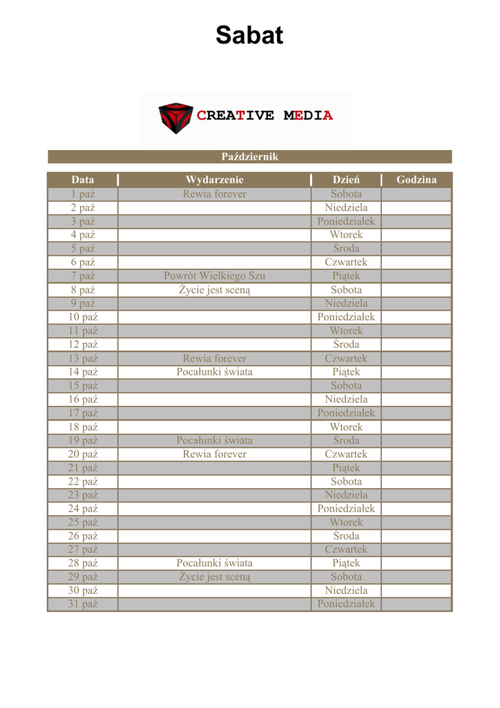 Sabat Październik Data 1 paź 2 paź 3 paź 4 paź 5 paź 6 paź 7 paź 8 paź 9 paź 10 paź 11 paź 12 paź 13 paź 14 paź 15 paź 16 paź 17 paź 18 paź 19 paź 20 paź 21 paź 22 paź 23 paź 24 paź 25 paź 26 paź 27 paź 28 paź 29 paź 30 paź 31 paź Wydarzenie Rewia forever Powrót Wielkiego Szu Życie jest sceną Rewia forever Pocałunki świata Pocałunki świata Rewia forever Pocałunki świata Życie jest sceną Dzień Sobota Niedziela Poniedziałek Wtorek Środa Czwartek Piątek Sobota Niedziela Poniedziałek Wtorek Środa Czwartek Piątek Sobota Niedziela Poniedziałek Wtorek Środa Czwartek Piątek Sobota Niedziela Poniedziałek Wtorek Środa Czwartek Piątek Sobota Niedziela Poniedziałek Godzina